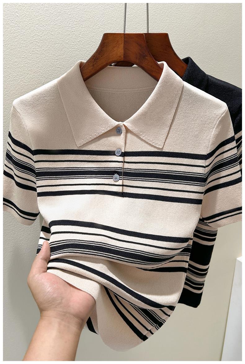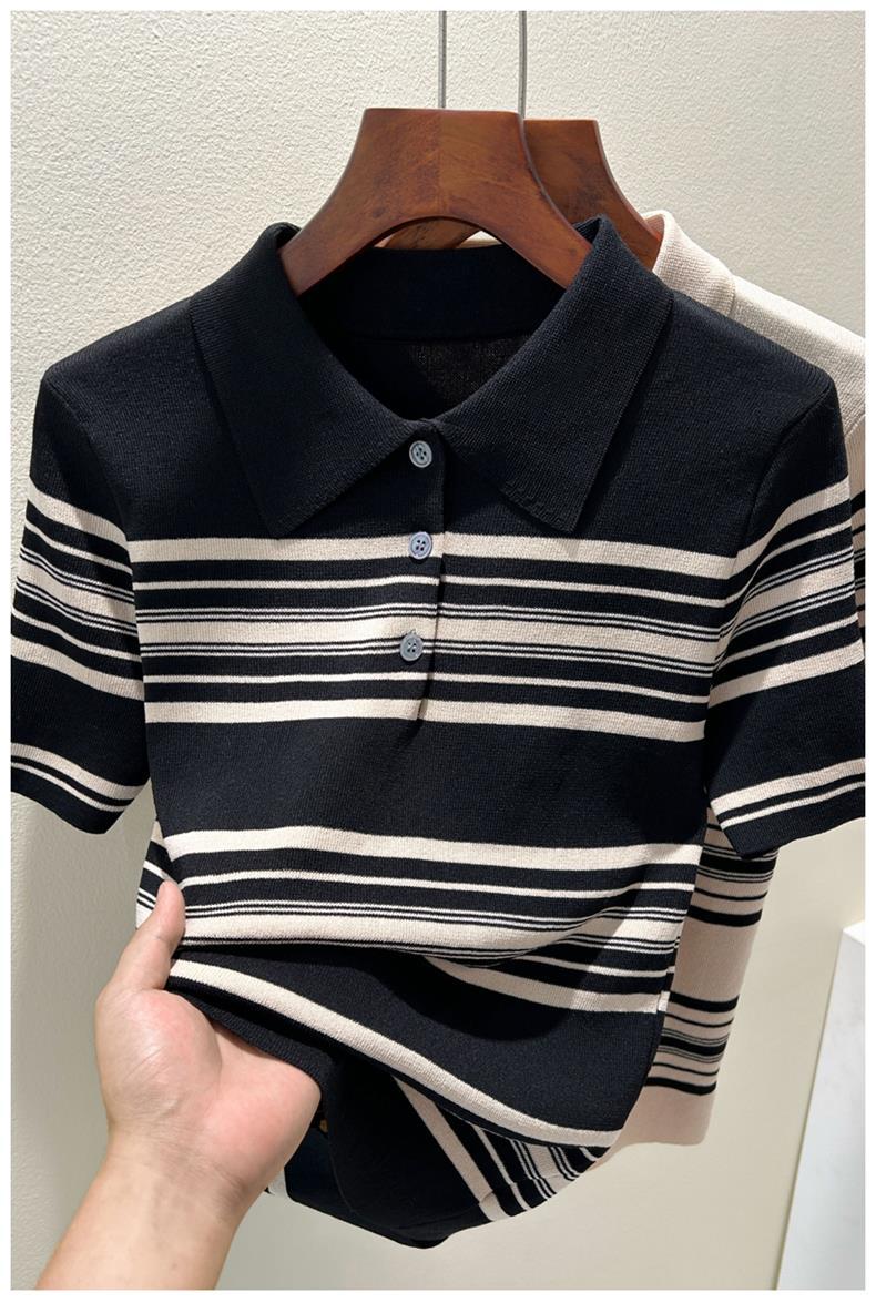 雀说莱赛尔天丝polo半开纽扣领短袖条纹冰丝针织衫法式正肩上衣AL1223
