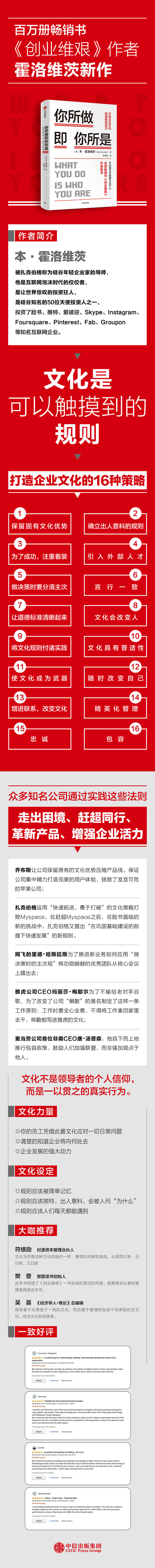 本·霍洛维茨不仅是一位风险投资家、现代管理专家,也是《纽约时报》的畅销书《创业维艰》作者。在本书《你所做即你所是》中他将历史和现代组织实践中的经验与实用的建议结合起来,帮助高管们建立一种能够经受住好的市场环境和坏的市场环境的文化。