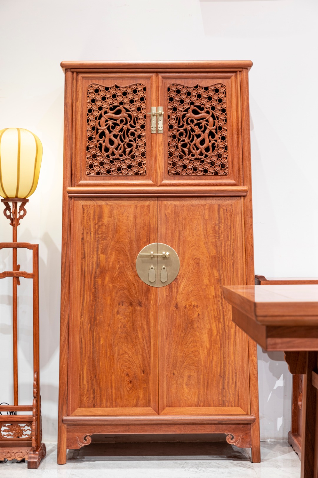此柜上下分层,皆对开双门,上部柜门透雕梅花草龙纹,梅花穿插映带,花朵含芯初开,极为玲珑剔透;龙纹蜷身昂首,形态蓄势待发,尤为生动饱满。下部双门平素,两侧门板木纹呈对称排布,门下直牙条,牙头锼卷云纹,线条卷曲多姿,与柜门透雕纹饰遥相呼应。此圆角柜型制儒雅中正,于淳朴古茂中含空灵妍秀之气,堪称明式家具之精品。