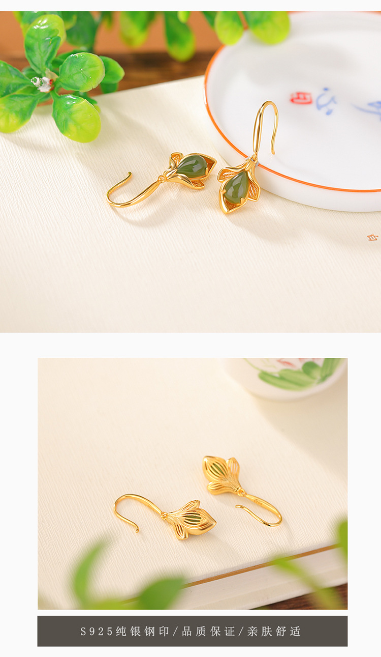S925纯银镀金和田玉碧玉玉兰花水滴耳坠CW