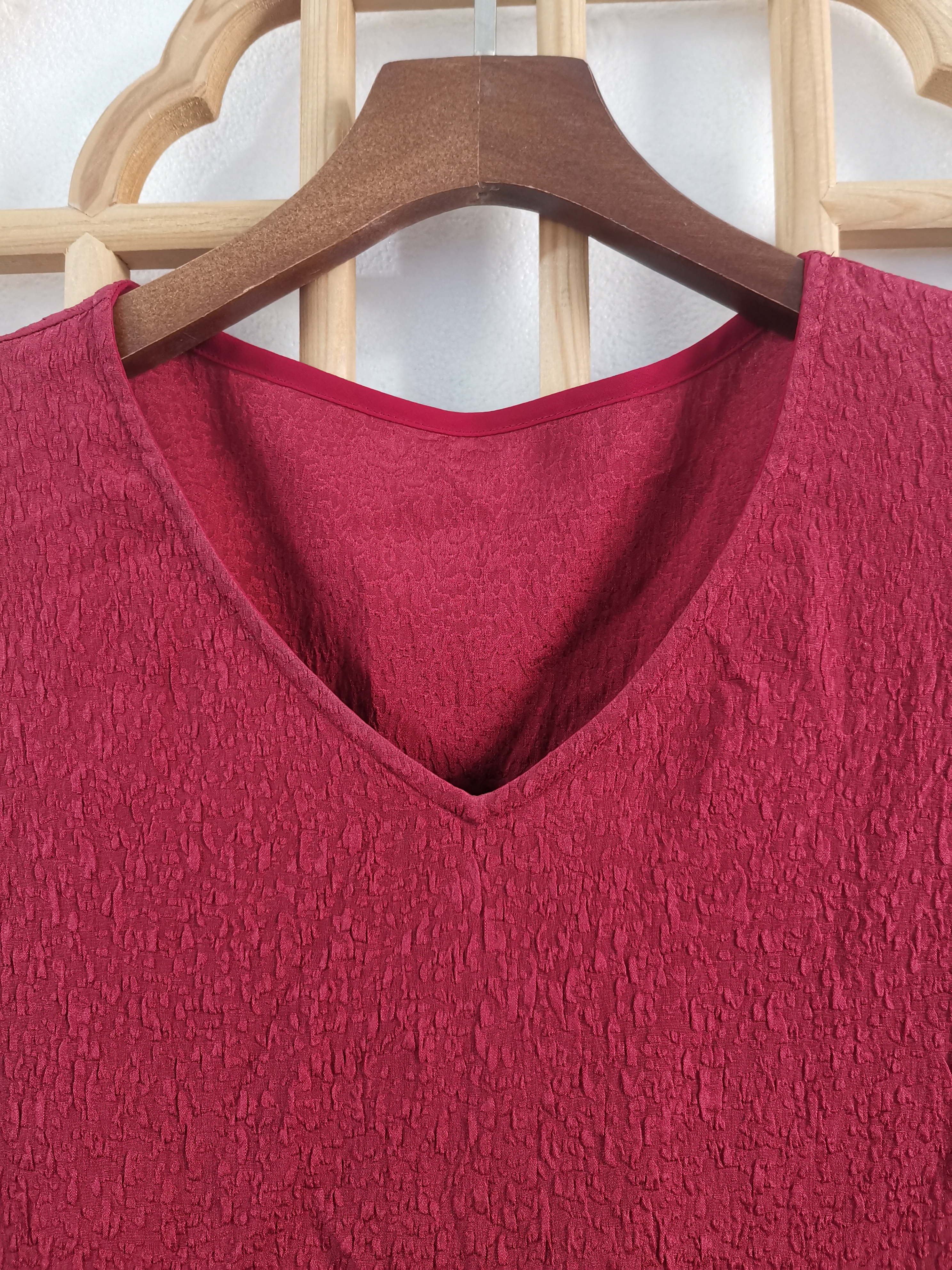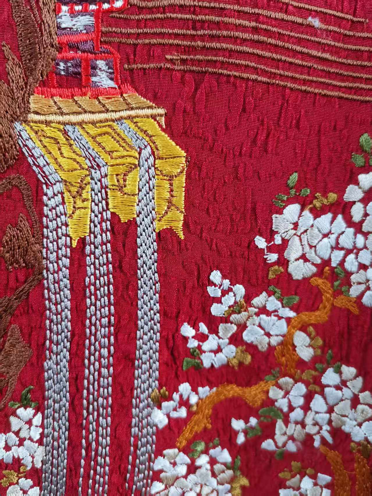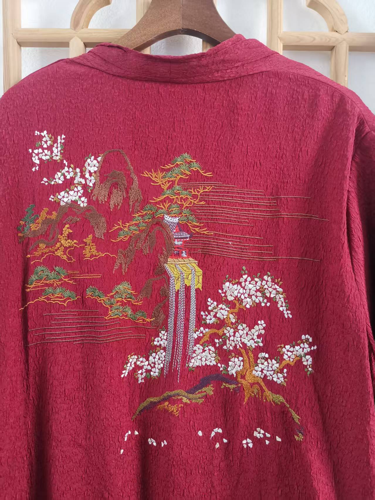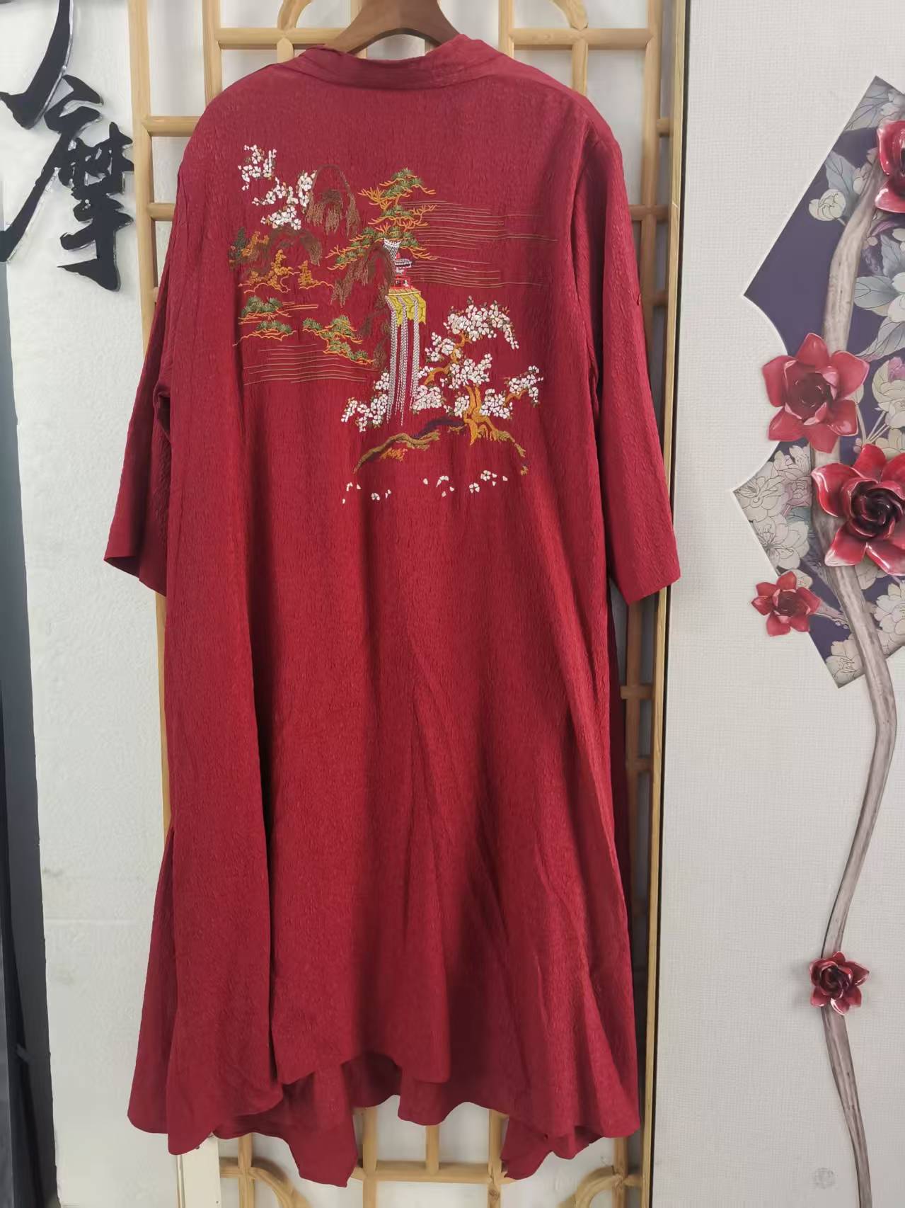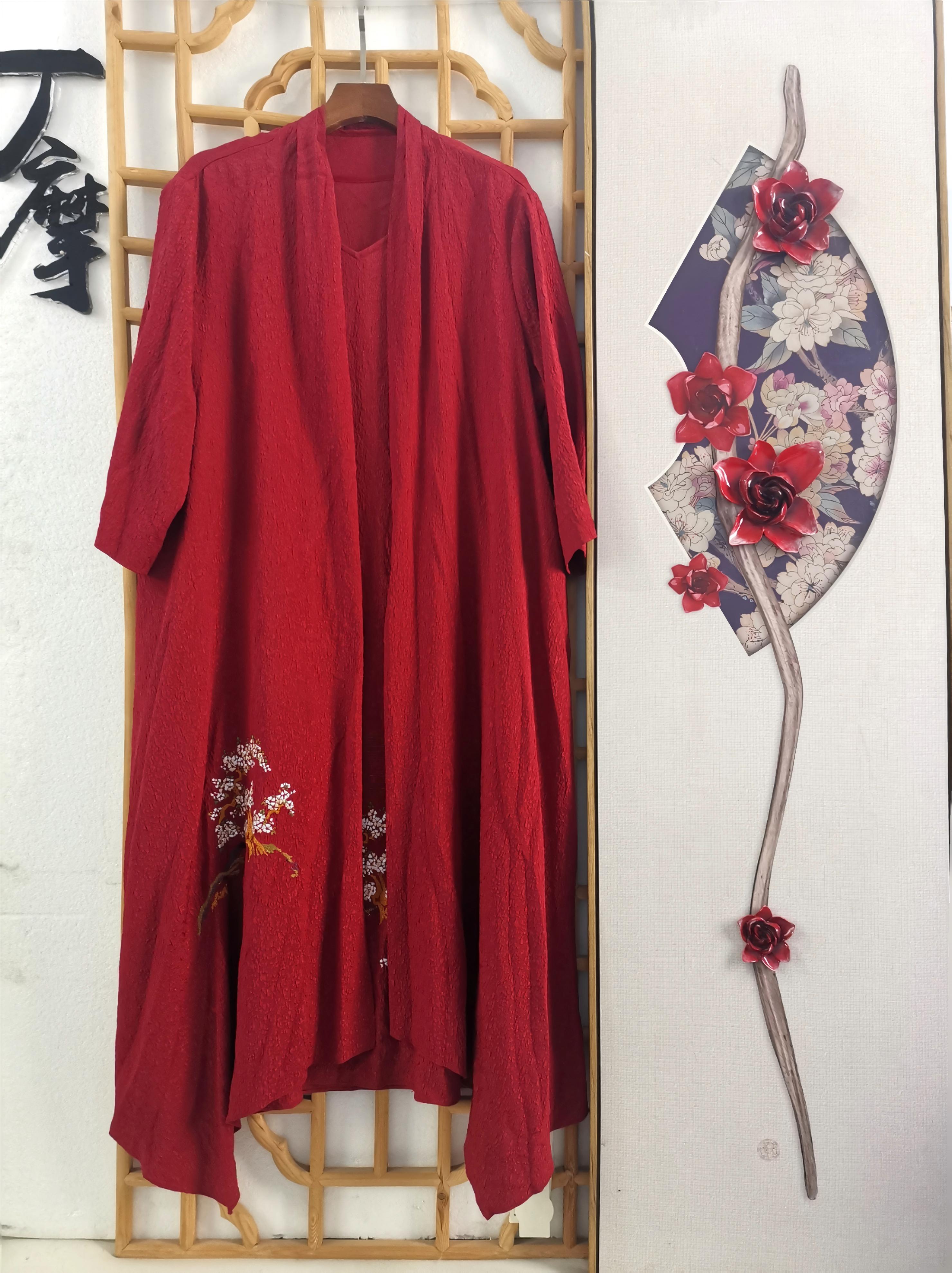 仅一件!XL码【断码清仓】重皱桑蚕丝重工刺绣中国风红色刺绣长款开衫复古宽松两件套连衣裙ZFYY013
