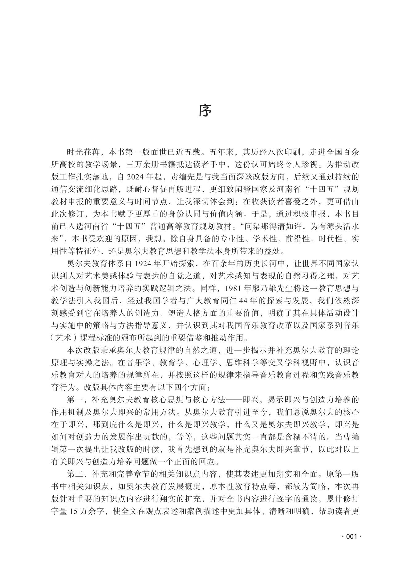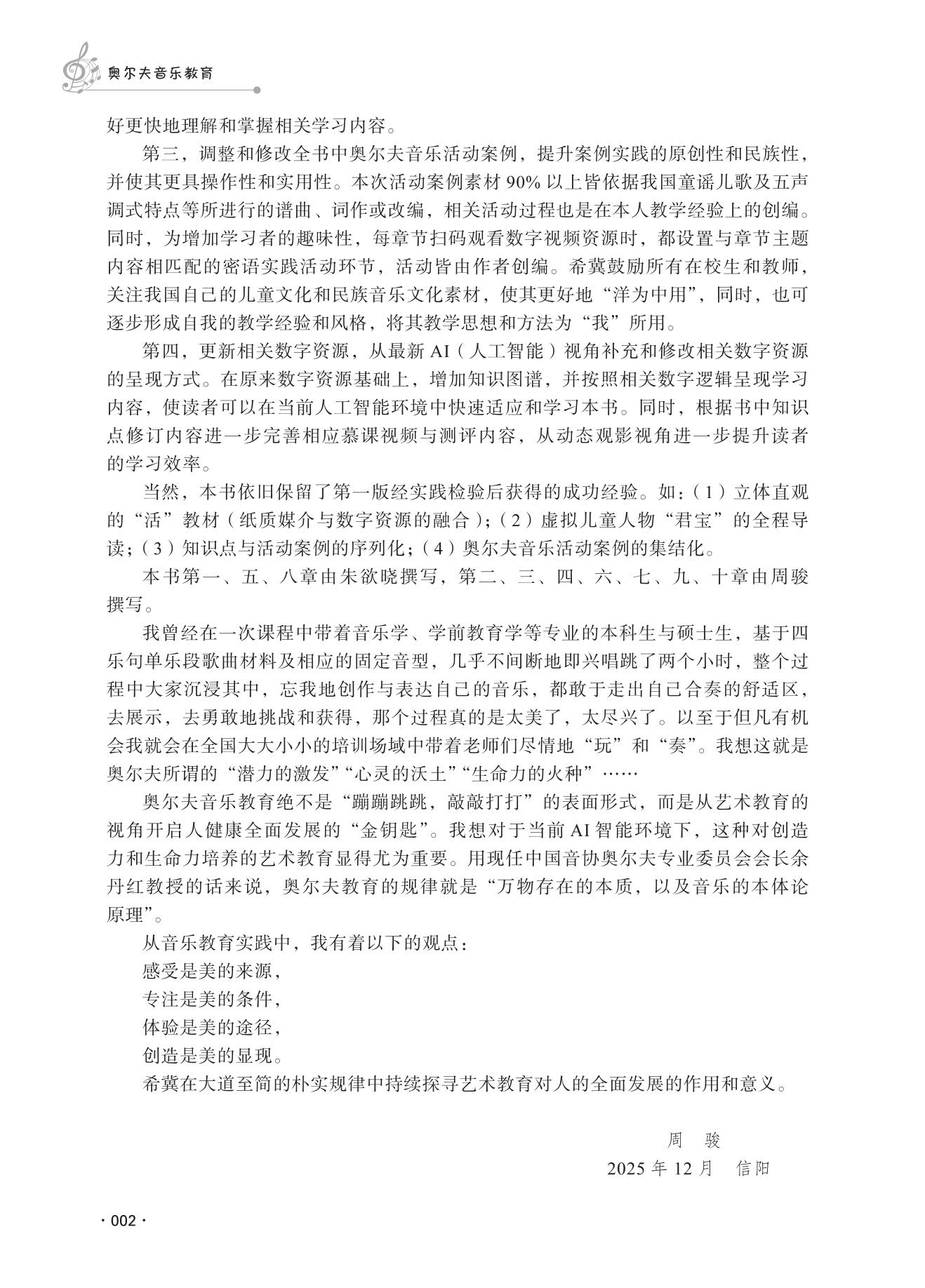 由信阳师范大学周骏老师领衔编撰的《奥尔夫音乐教育(第二版)》已正式出版发行。该教材已成功入选河南省“十四五”普通高等教育规划教材,并荣获河南省优秀教材(高等教育类)二等奖。此次改版以中国本土文化为价值引领,以创造力培养为教育目标,在教育原理与教学实操的双循环互证模式下,帮助学习者理解奥尔夫音乐教育的理念,掌握奥尔夫音乐教育教学的方法。相比第一版,该版特色显著:
