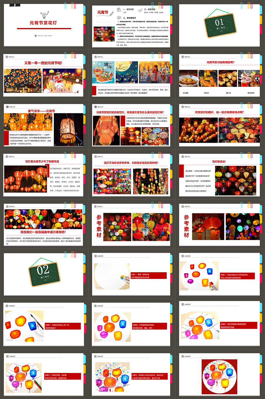 1、讲述有关元宵节来历,了解元宵节的相关习俗,拓宽学生的知识面,并选择花灯这一题材形式进行表现。