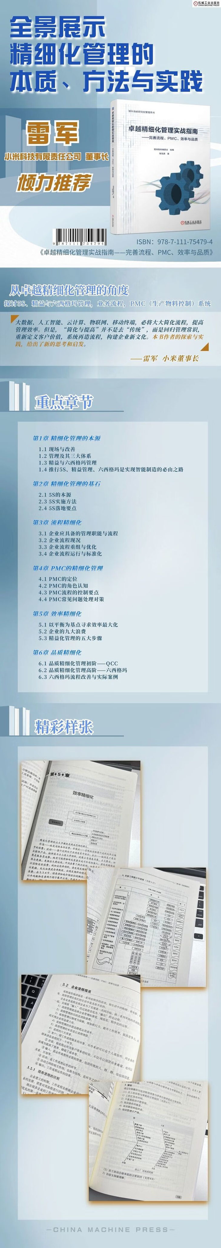 《卓越精细化管理实战指南——完善流程、PMC、效率与品质》一书是笔者二十多年来在工业企业管理领域的实践总结和反思,其中没有非常深奥的理论,而是通过浅显易懂的文字介绍了卓越精细化管理的相关知识、观念和落地执行的方法。笔者把实践中最有效的管理成果写出来,奉献给我们正在奋进的制造业企业管理者。