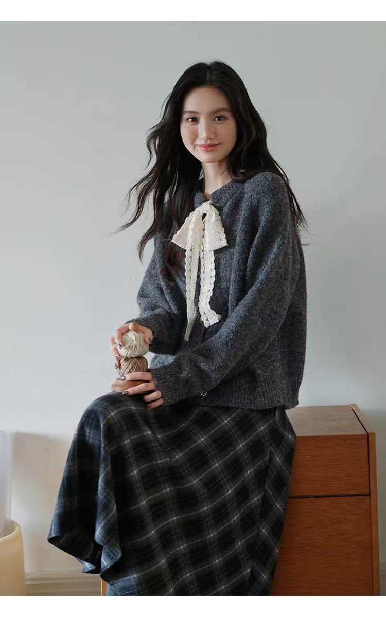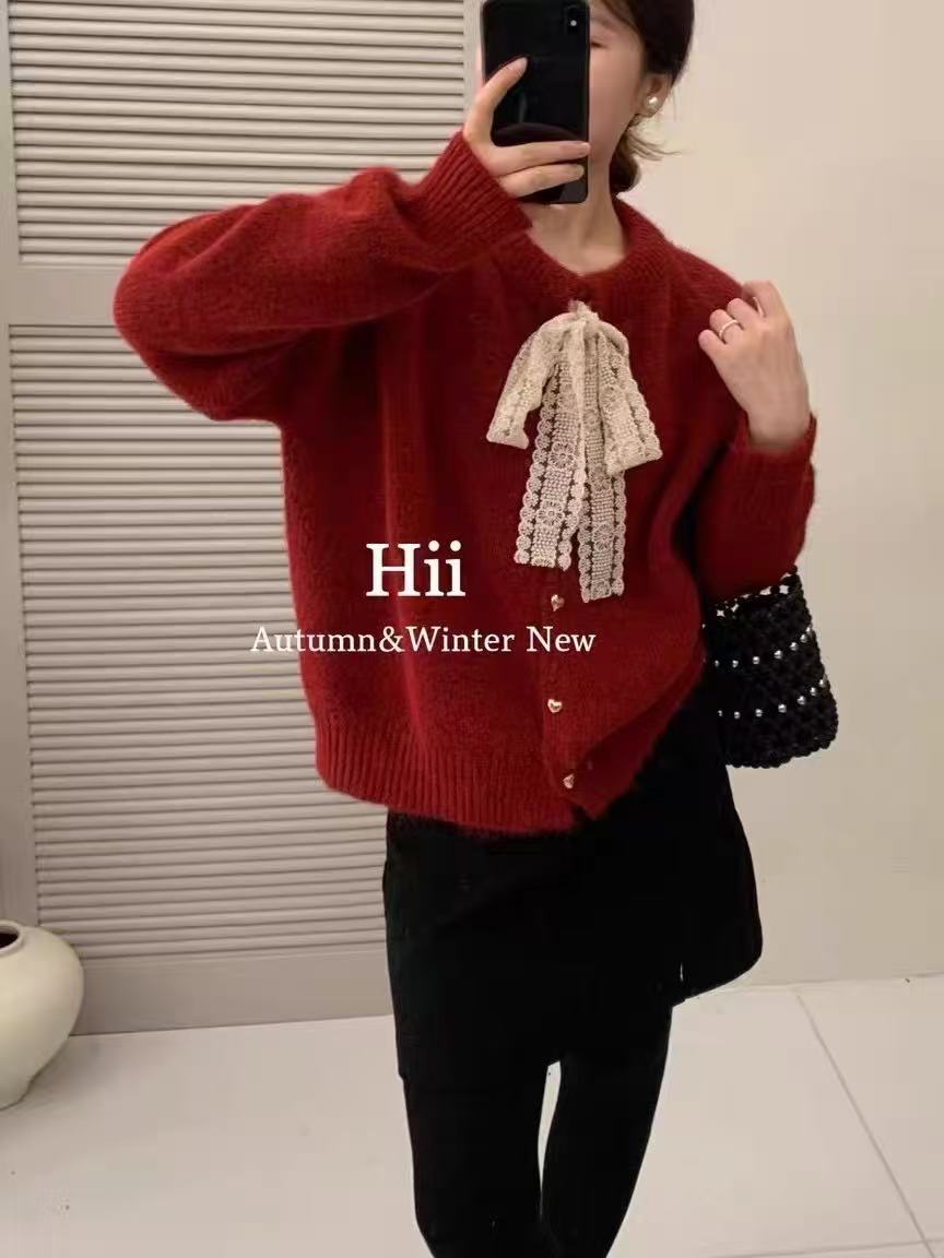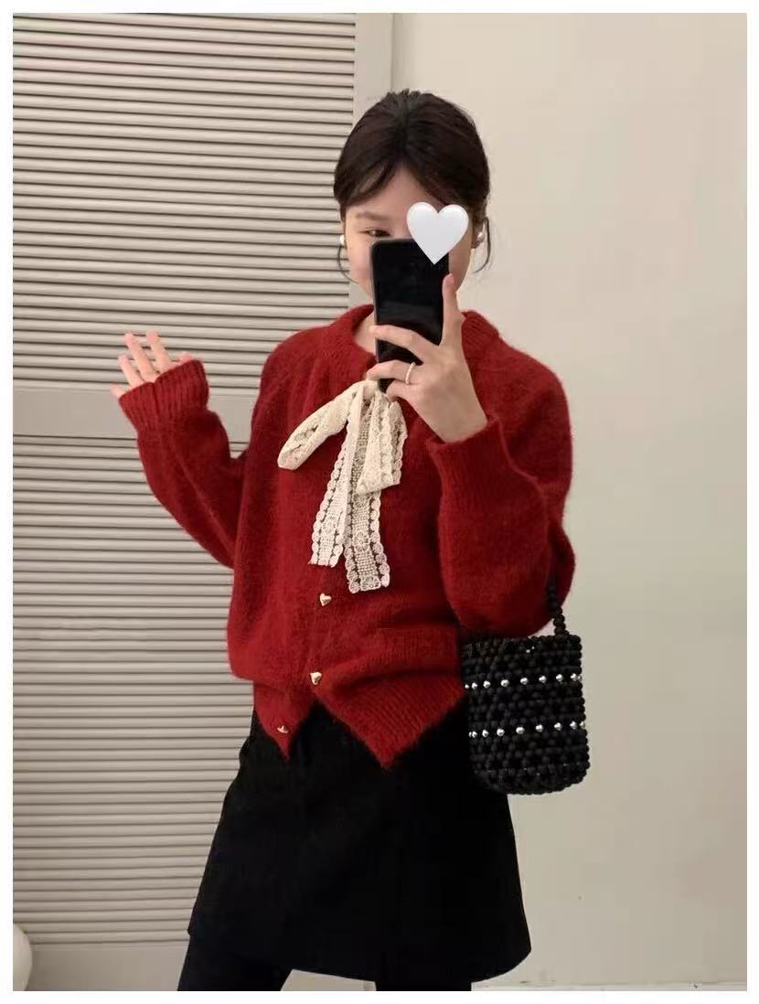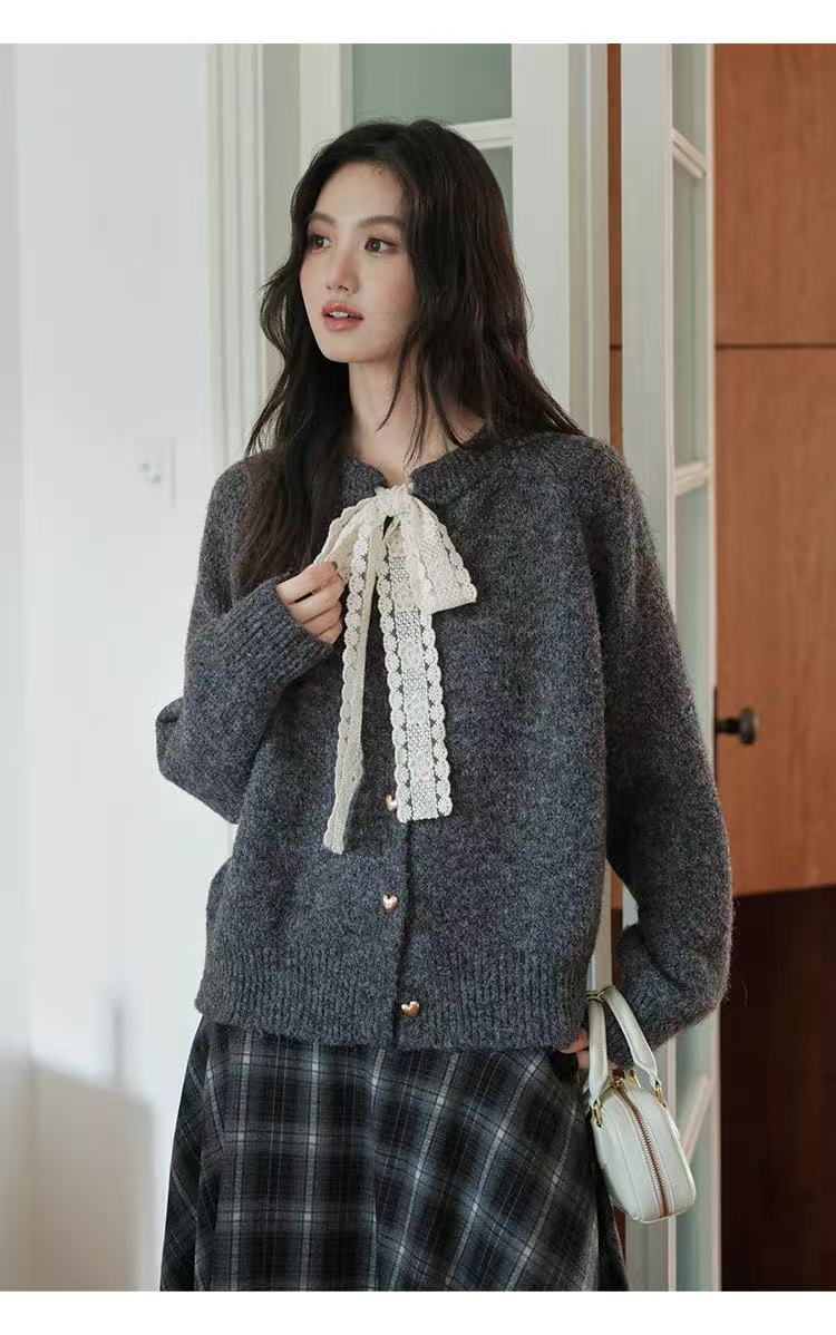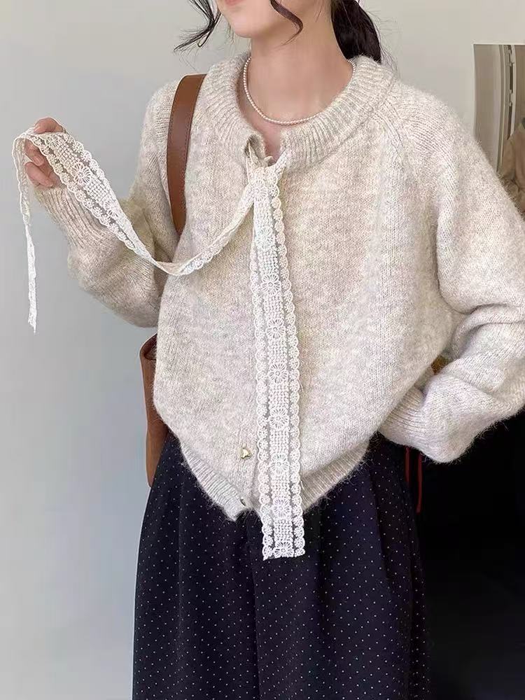自营【超美针织衫】M15温柔风氛围感蕾丝飘带开衫毛衣-喜出