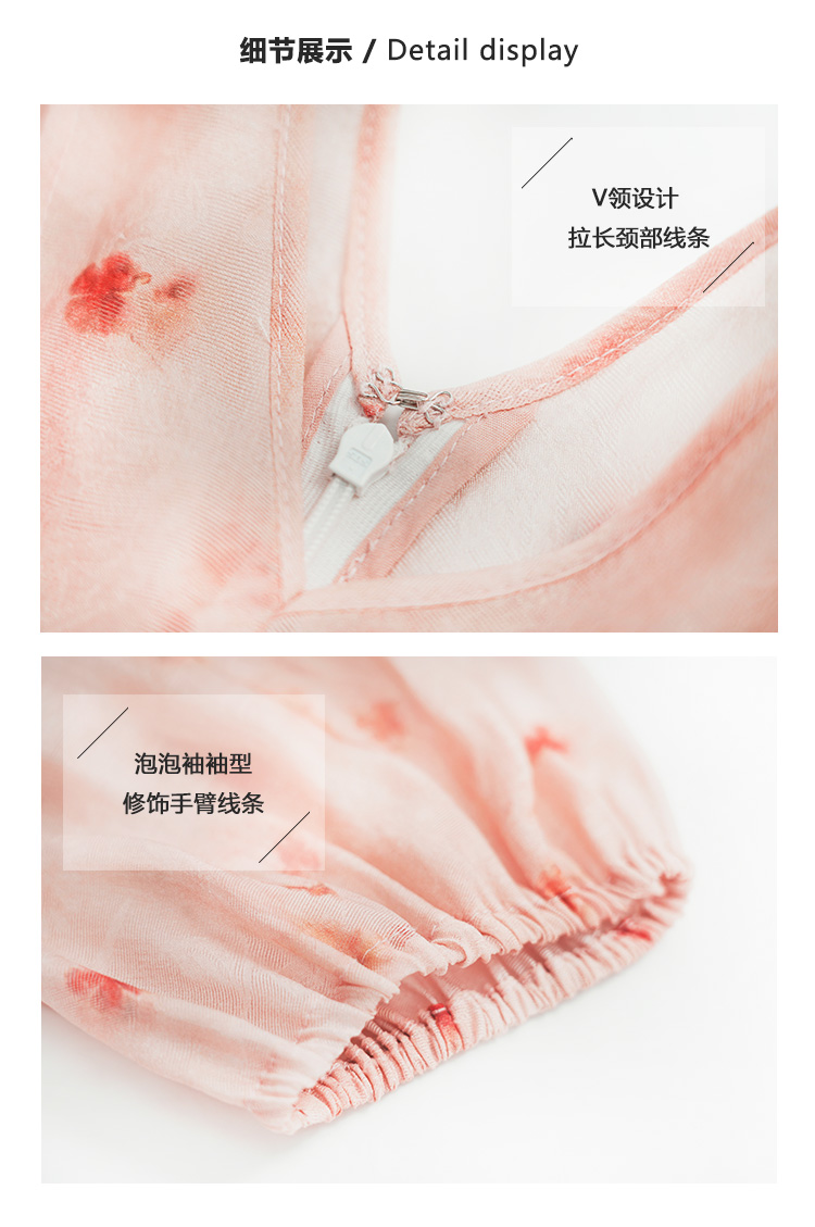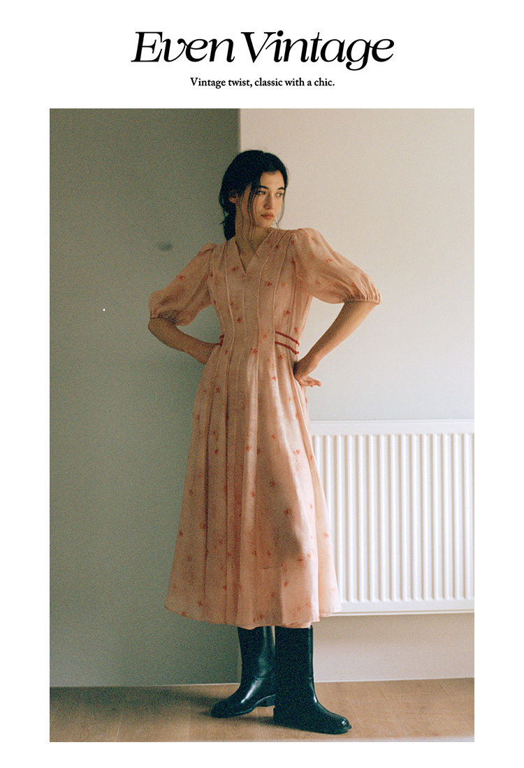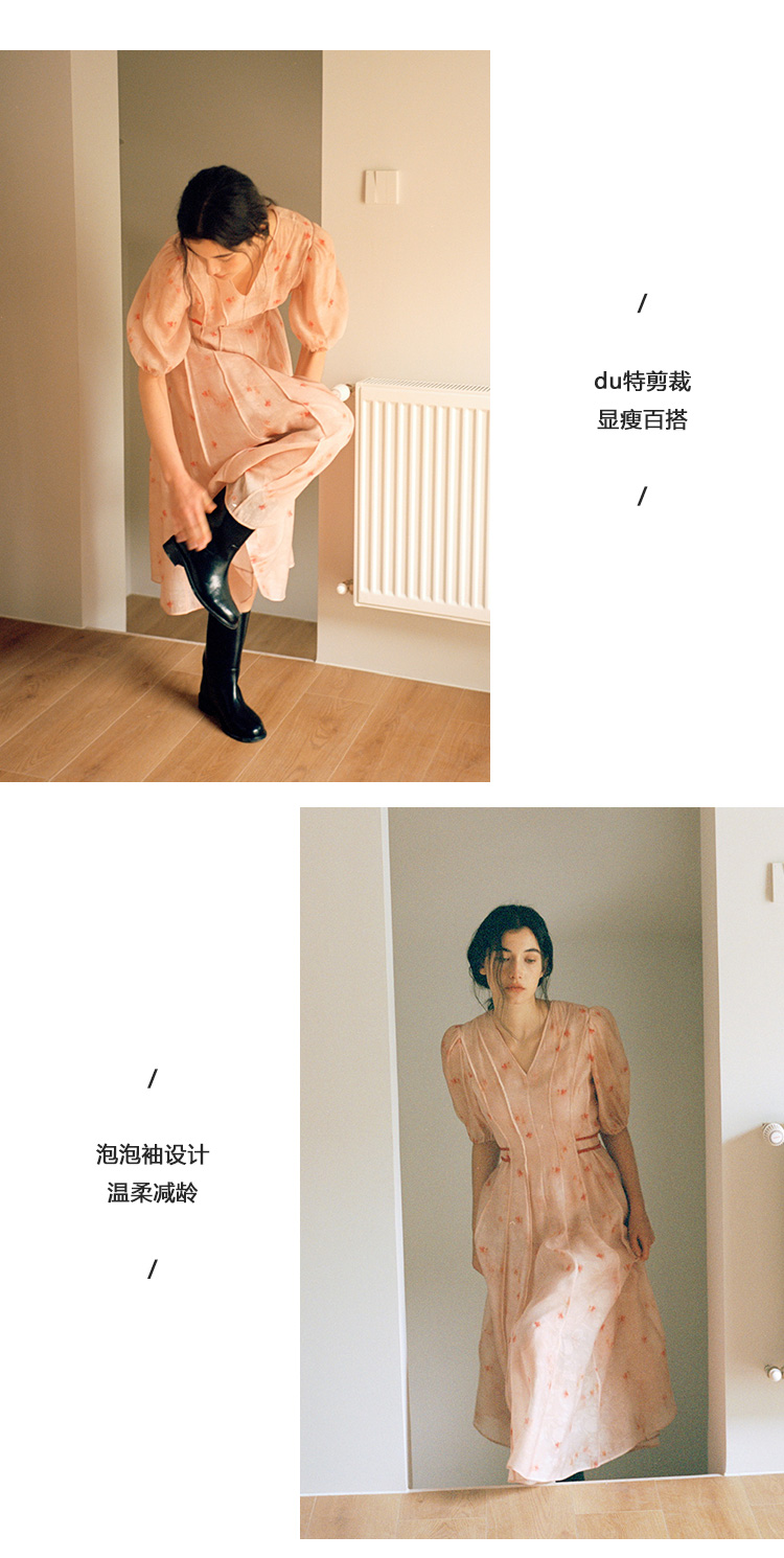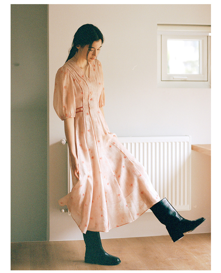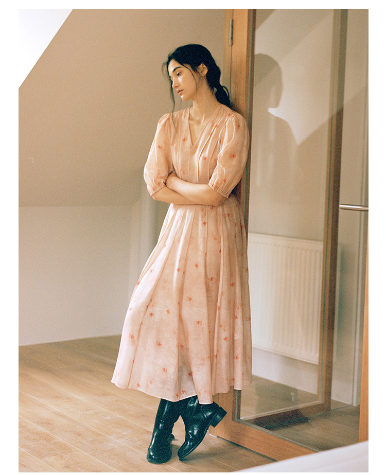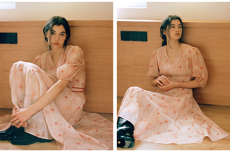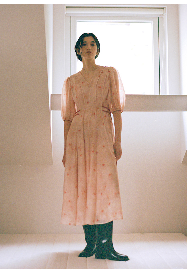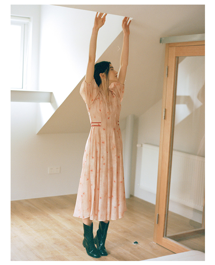 Even Vintage | 丝质光泽 法式V领泡泡袖粉红印花连衣裙女小个子