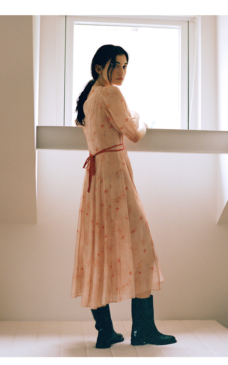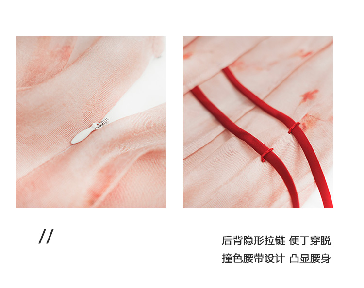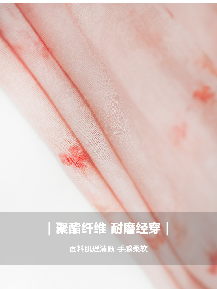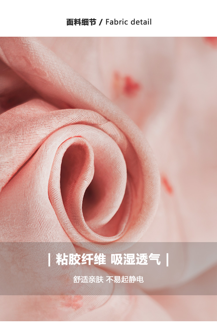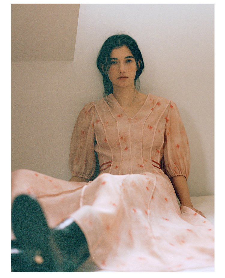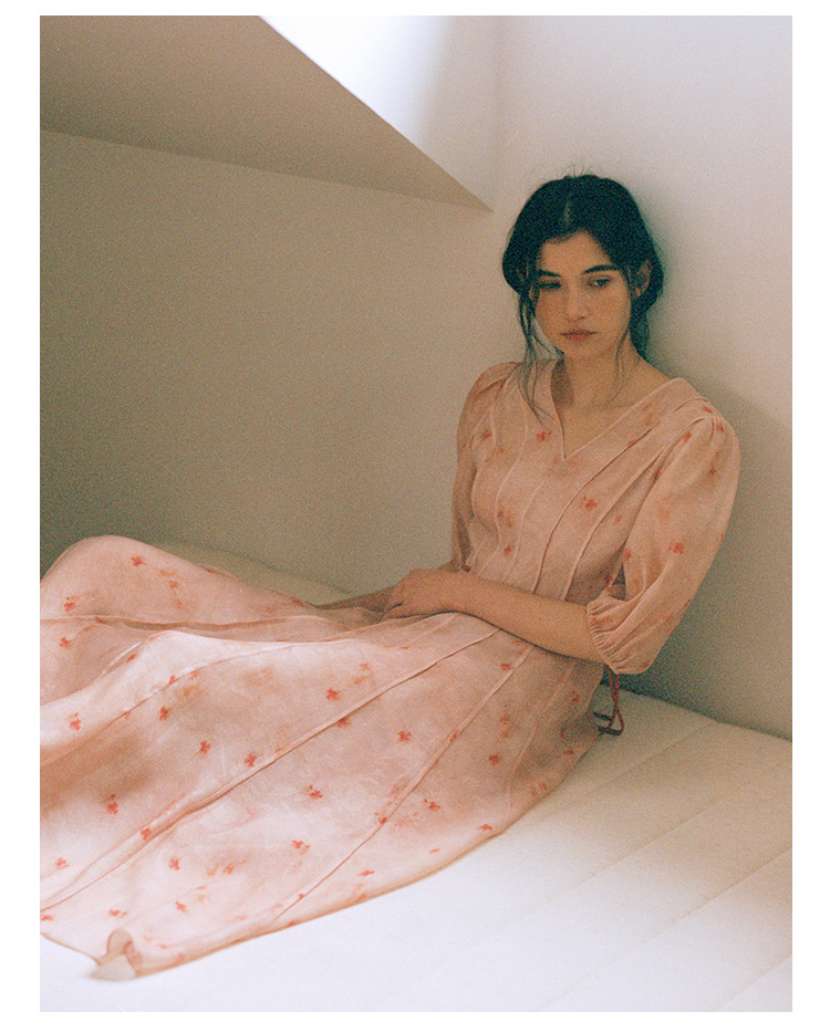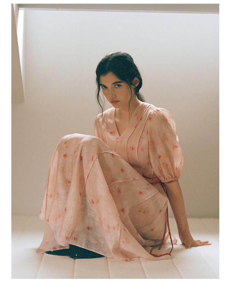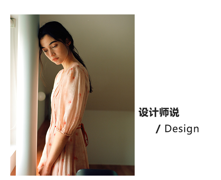 Even Vintage | 丝质光泽 法式V领泡泡袖粉红印花连衣裙女小个子