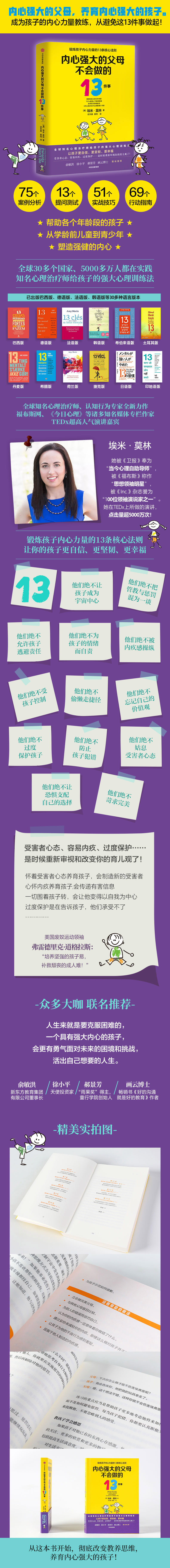 ◎科学系统的训练方式:每个主题都精心设计了丰富的案例分析、提问测试、实战技巧和行动指南,帮助各个年龄段的孩子塑造强健的内心,使他们成长为更自信、更坚韧、更幸福的成年人。