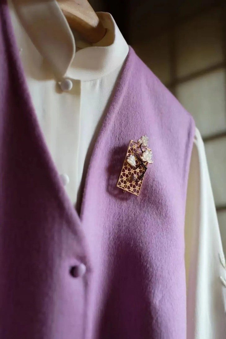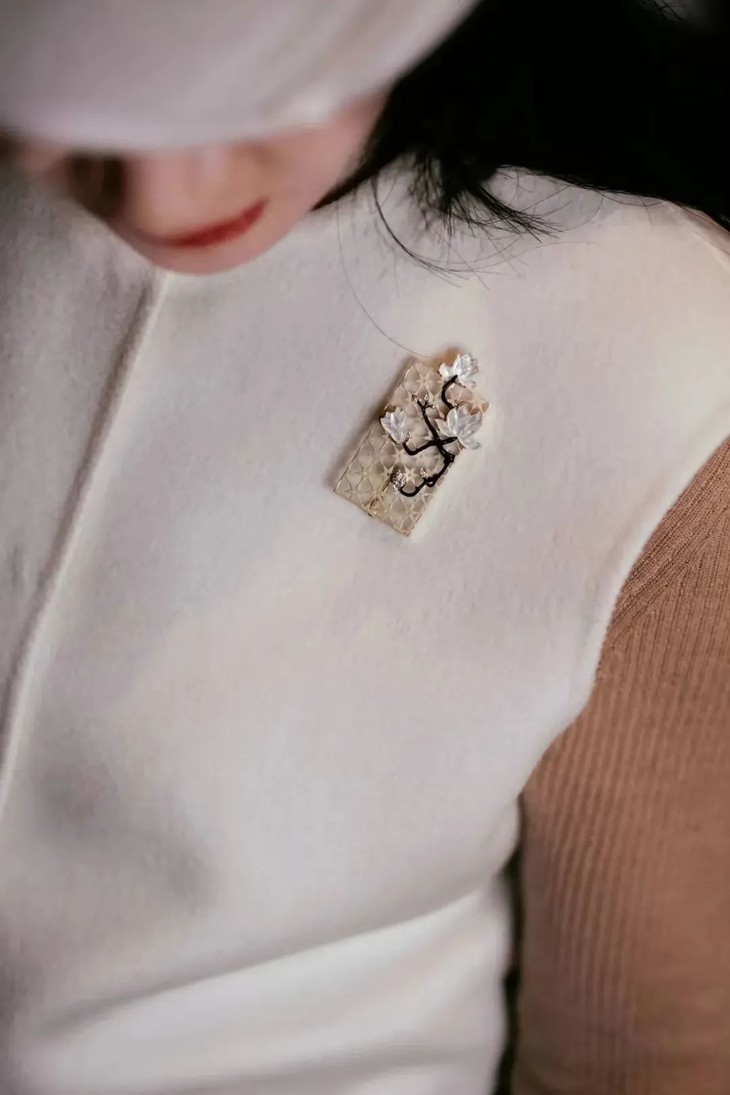 很少用方形作胸针。玉兰胸针好像一个40岁才突然爆红的明星,