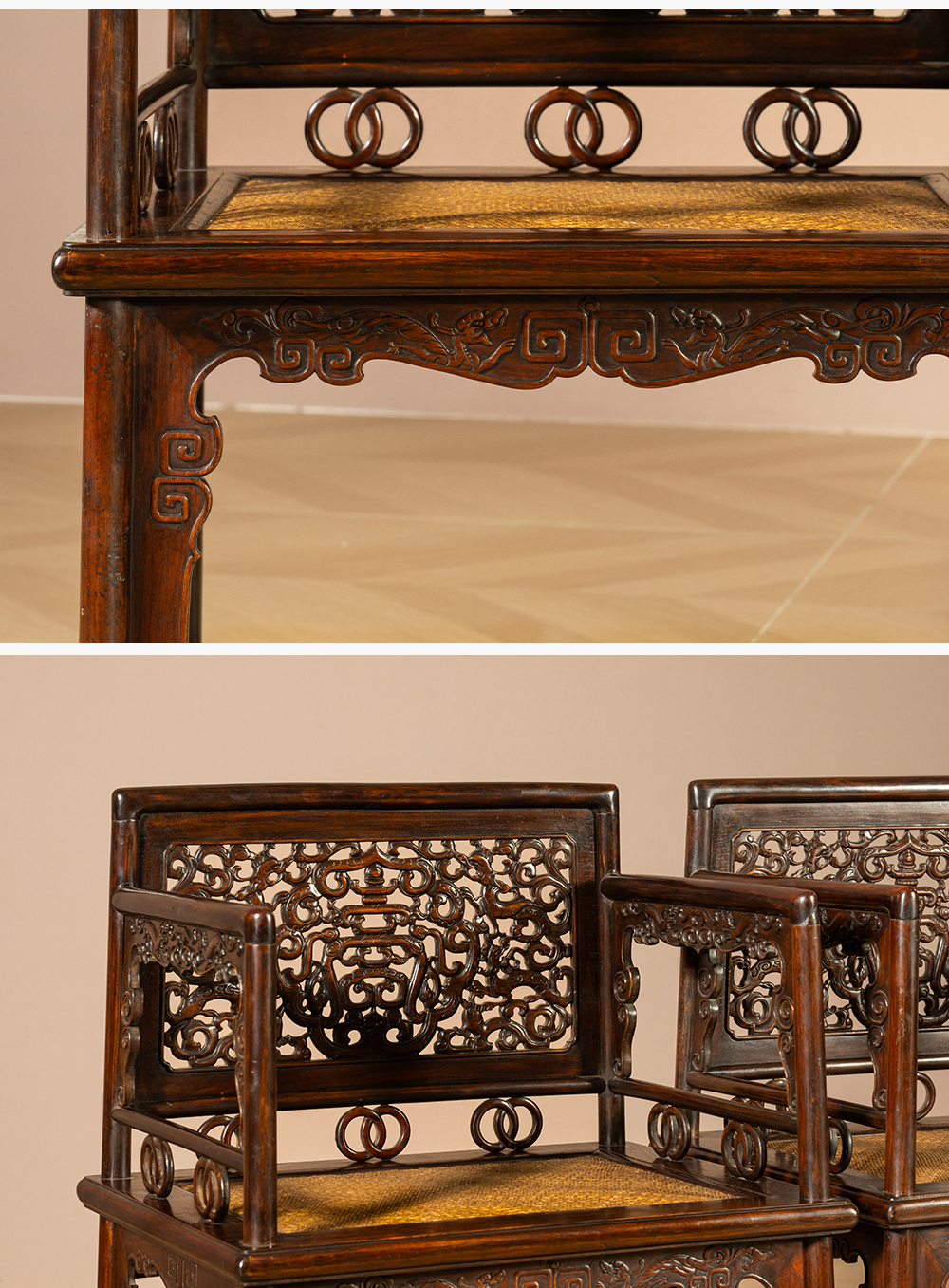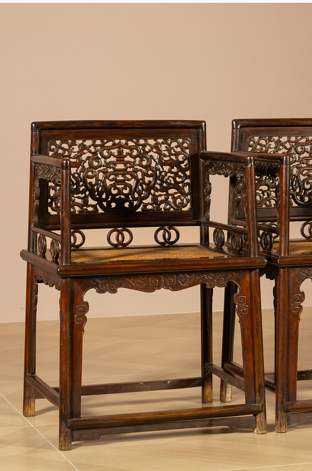 清 黄花梨透雕螭龙捧寿玫瑰椅(一对)