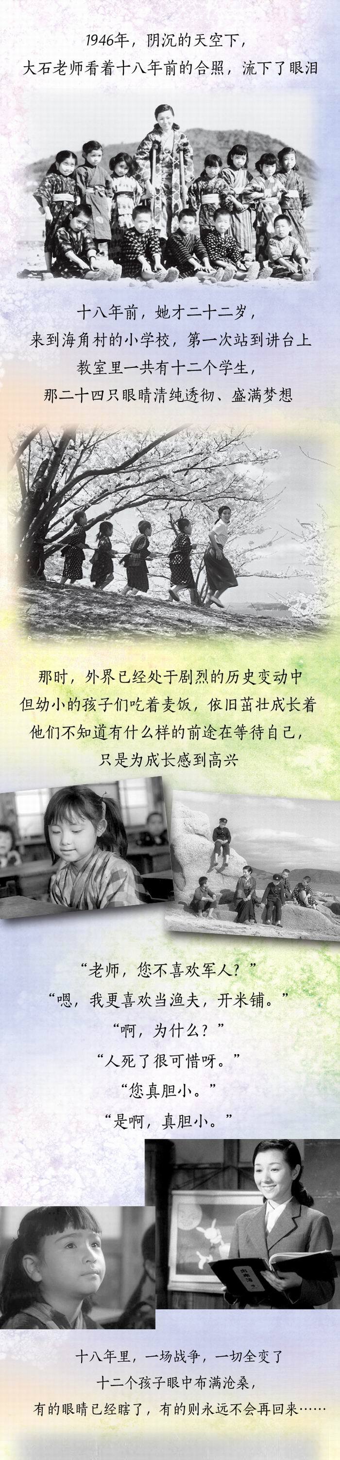 那一年,大石老师来到海角村的小学校,次站到讲台上。教室里一共有十二个学生,那二十四只眼睛清纯透彻、盛满梦想。