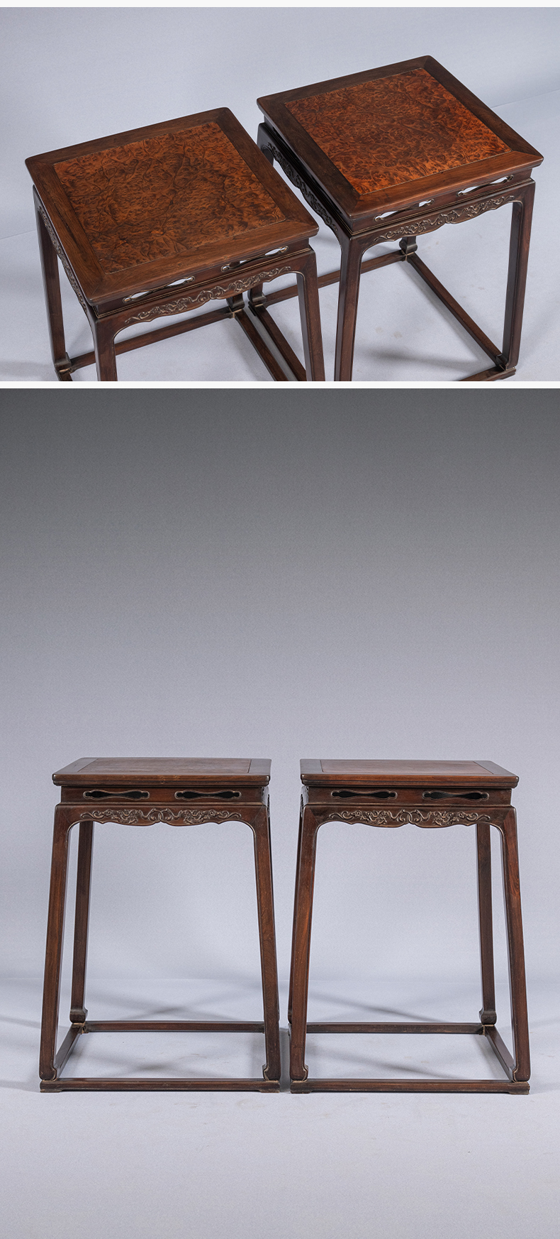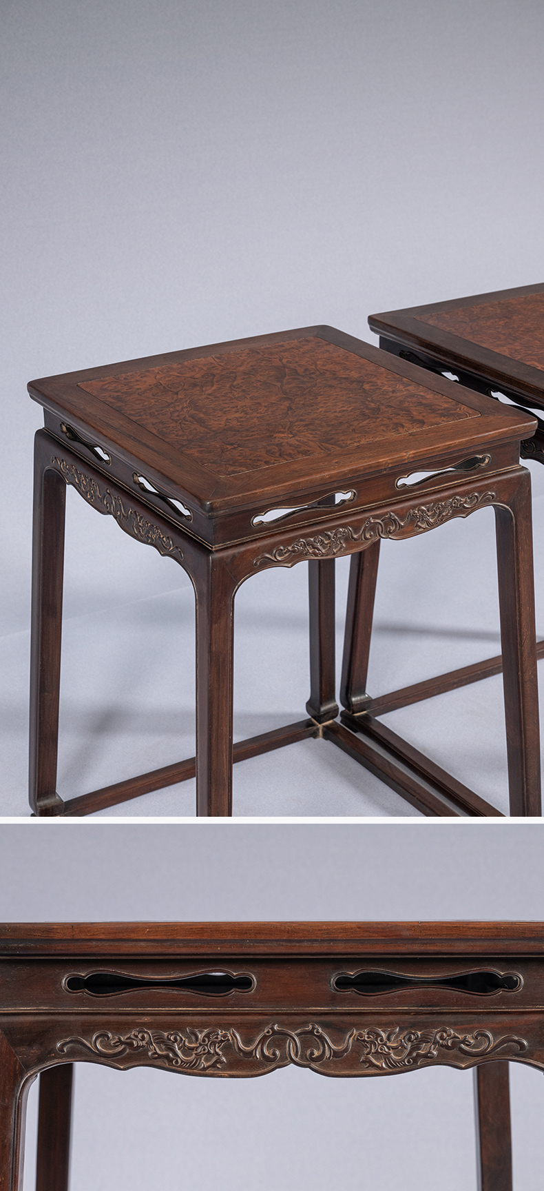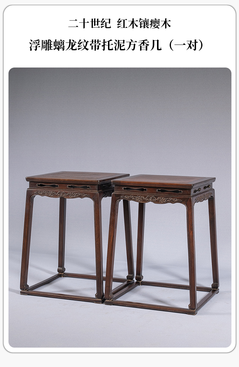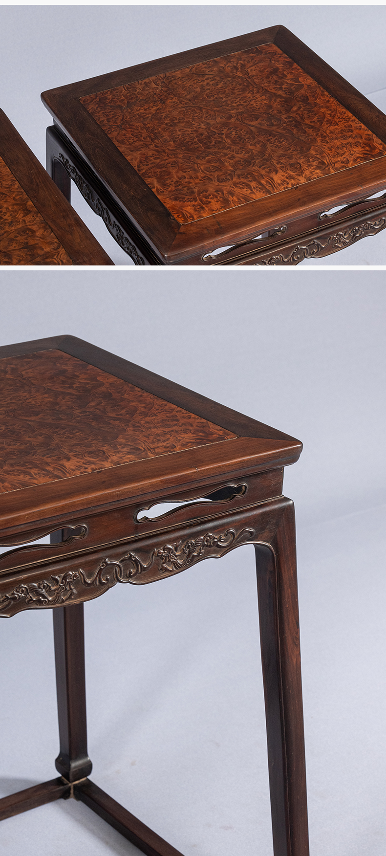 二十世纪 红木镶瘿木浮雕螭龙纹带托泥方香几(一对)