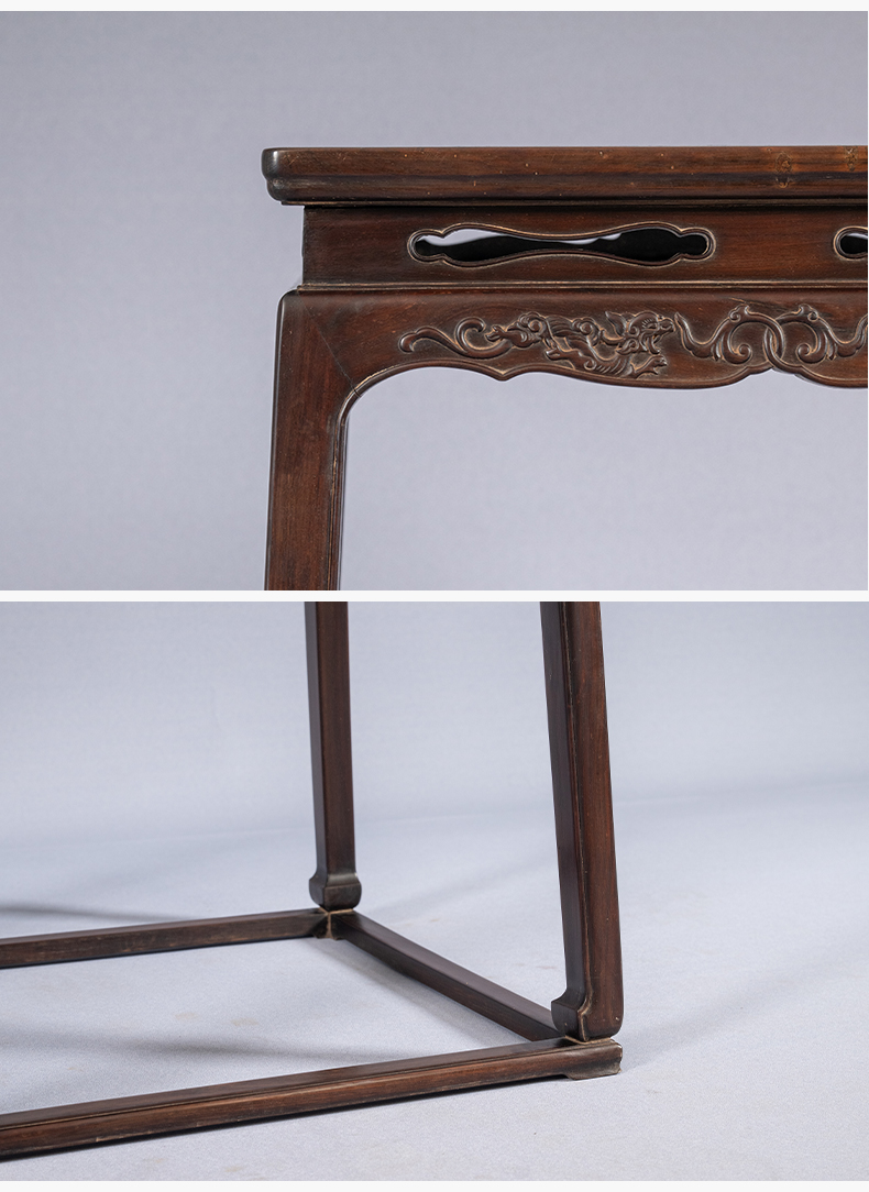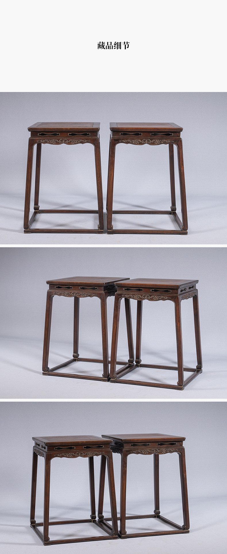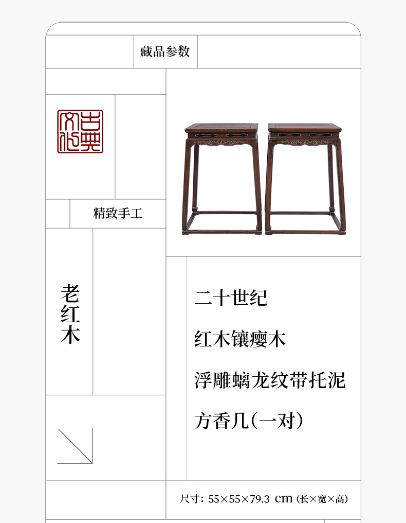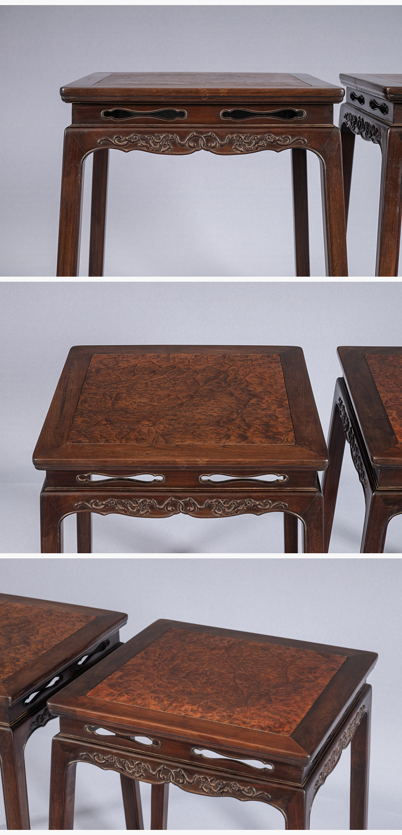 二十世纪 红木镶瘿木浮雕螭龙纹带托泥方香几(一对)