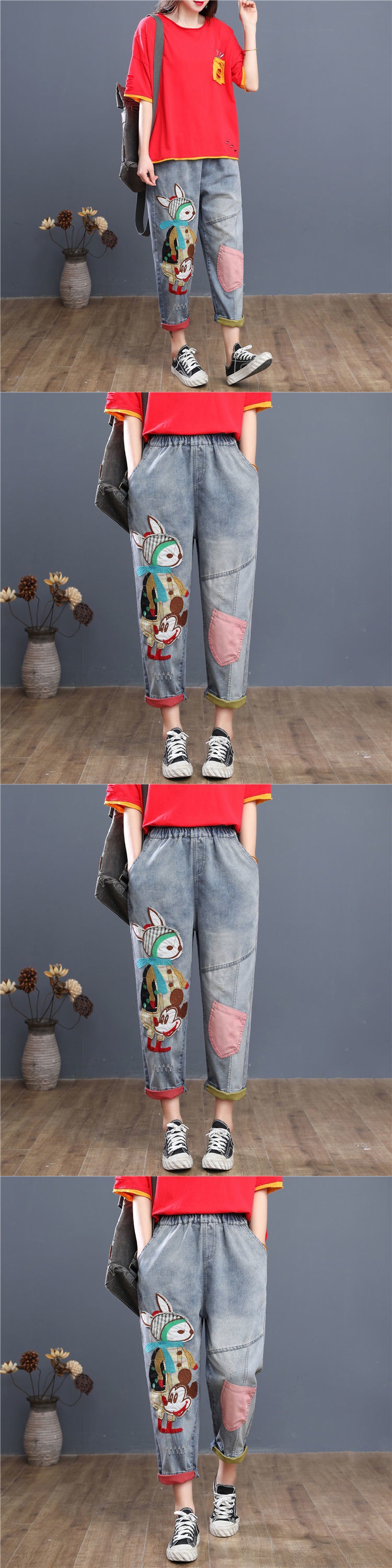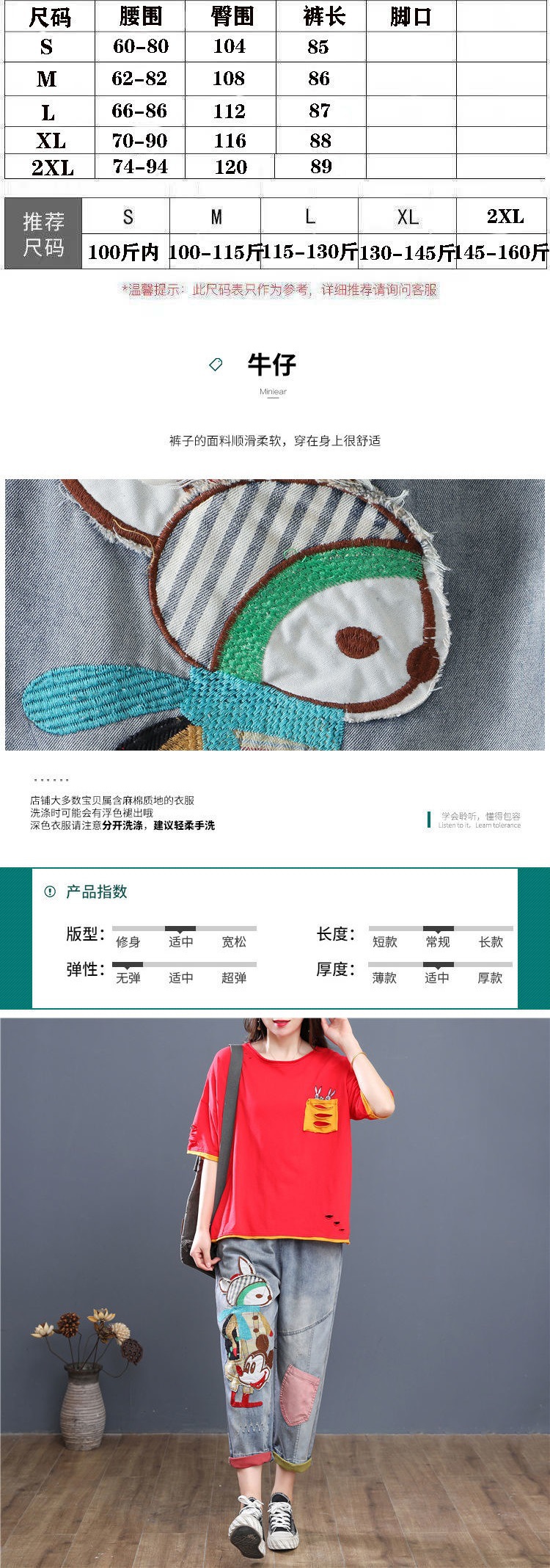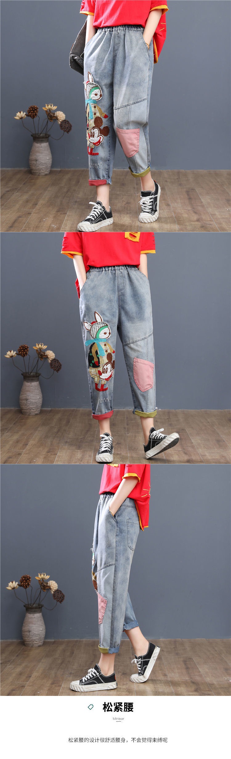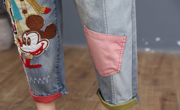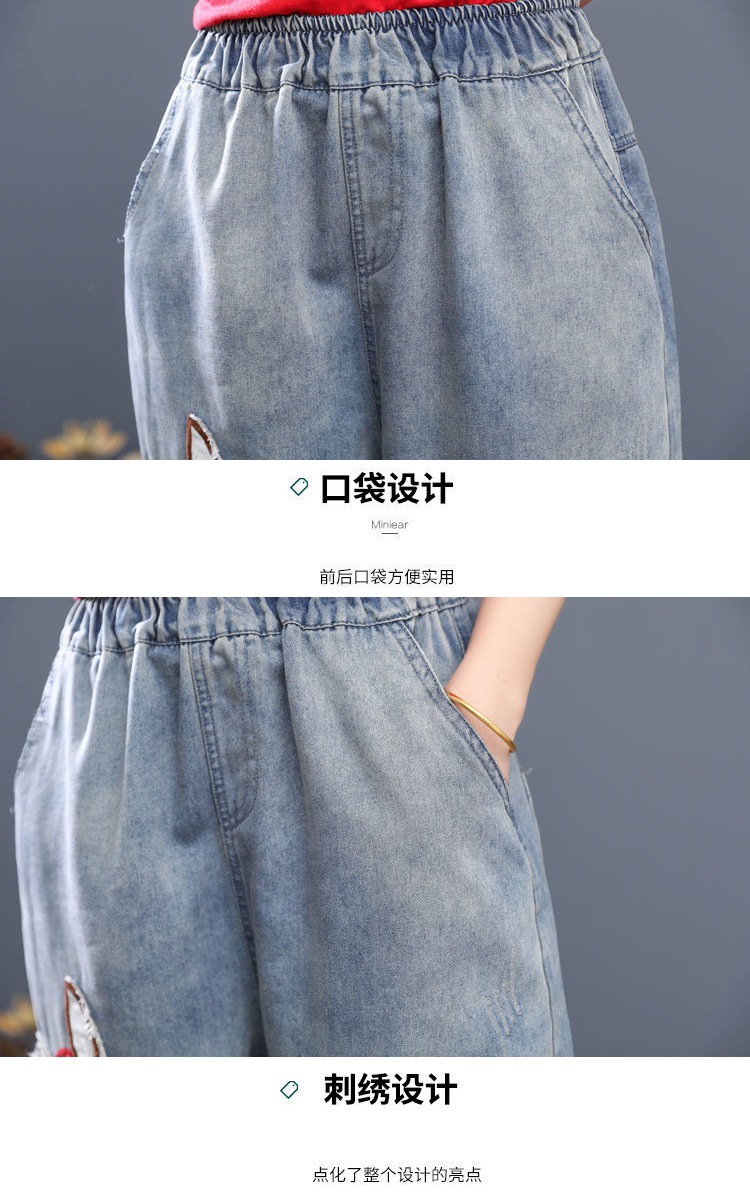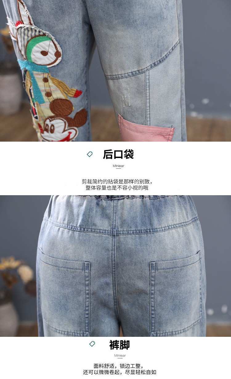 HY-哈伦老爹裤 复古宽松牛仔七分裤女夏季薄款高腰卡通刺绣宽松大码哈伦老爹裤潮