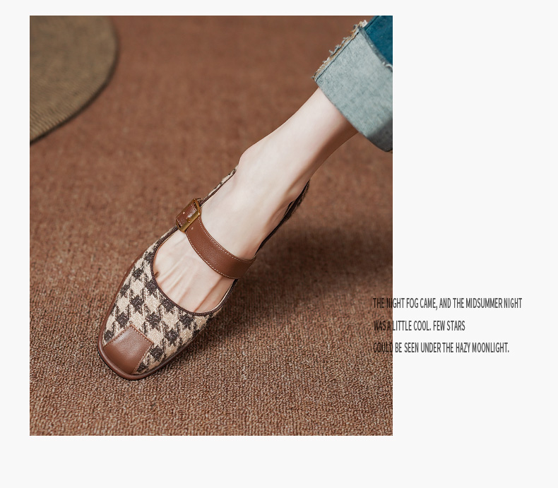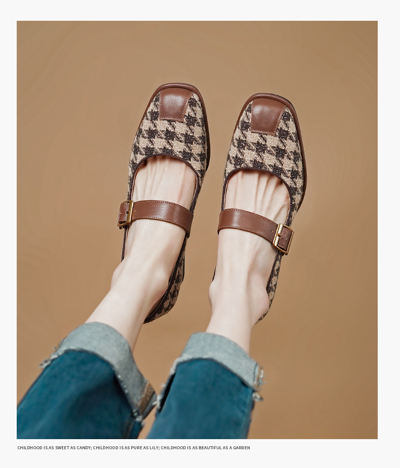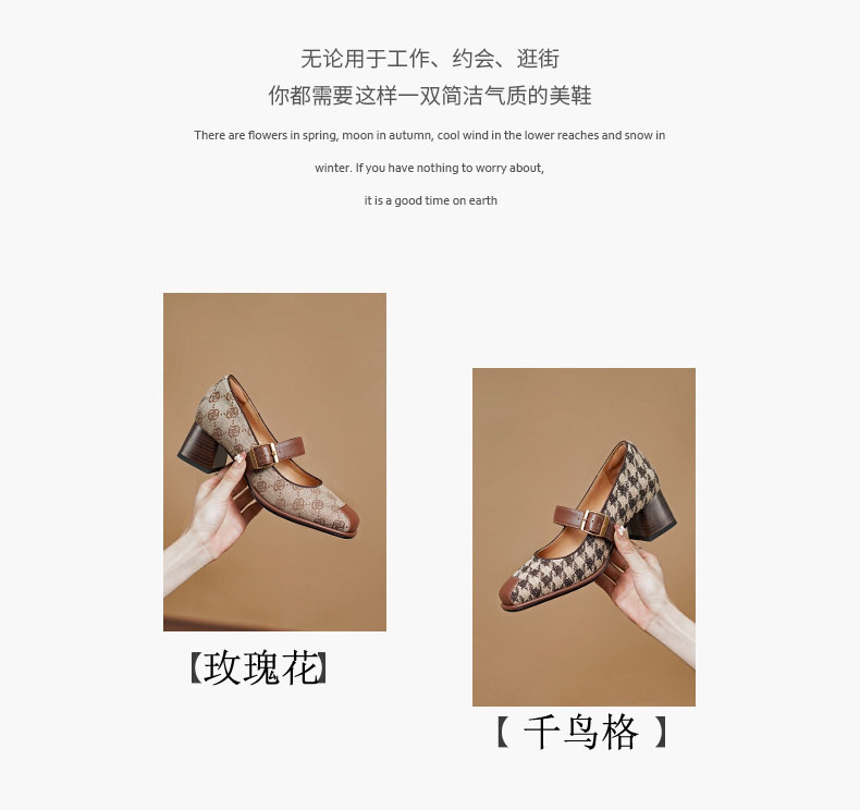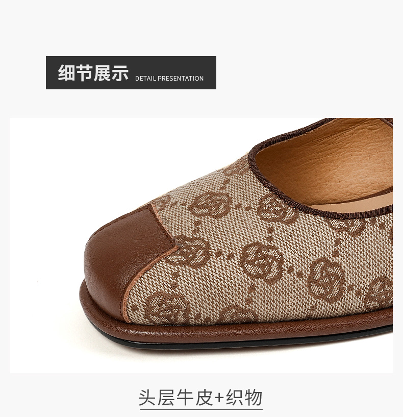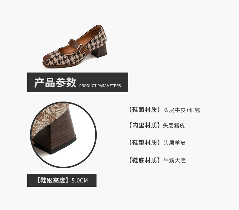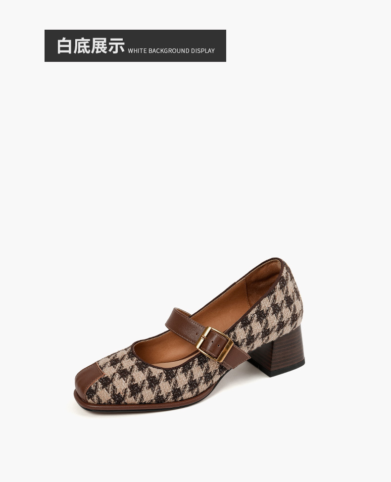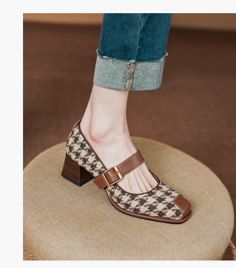 复古小香风,格纹布加头层牛皮低粗跟单鞋PS1257