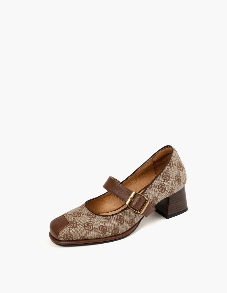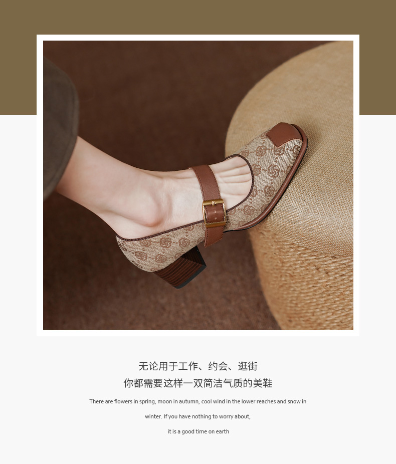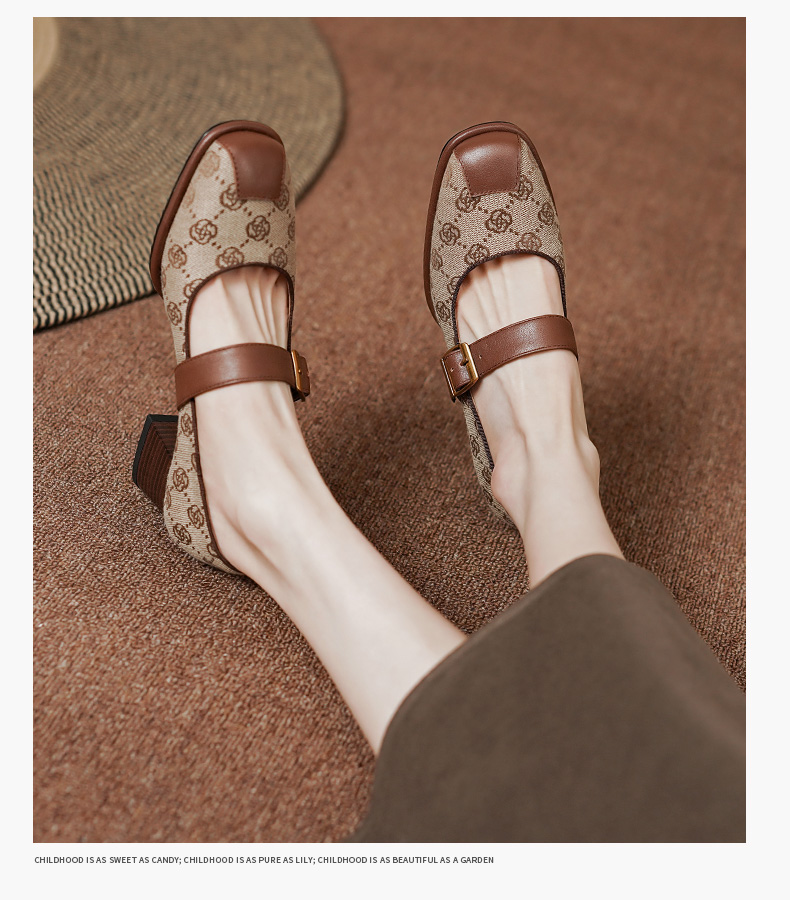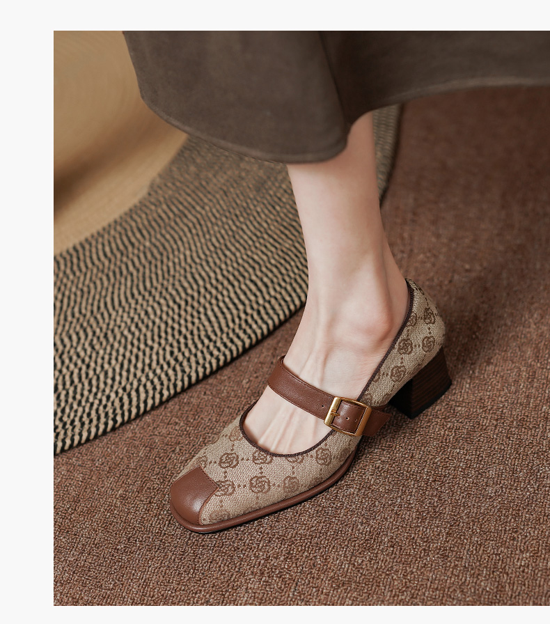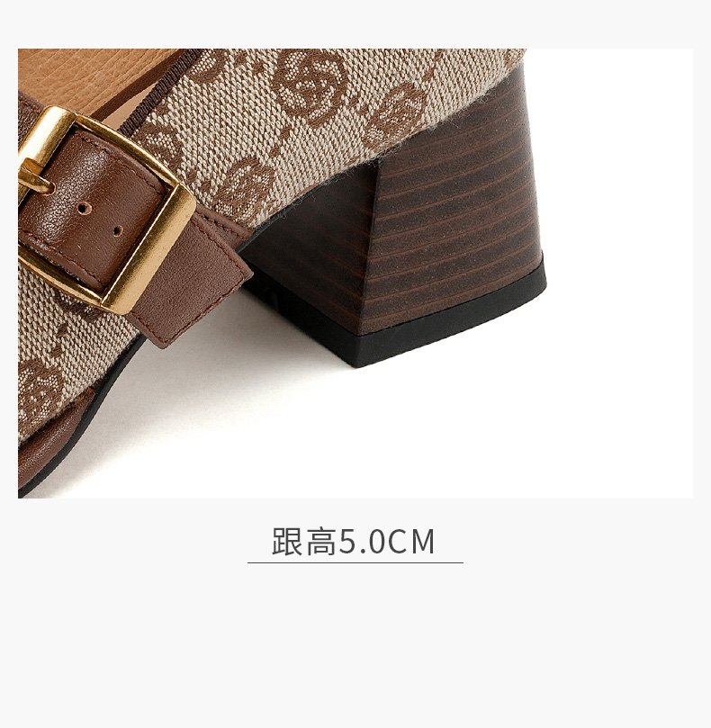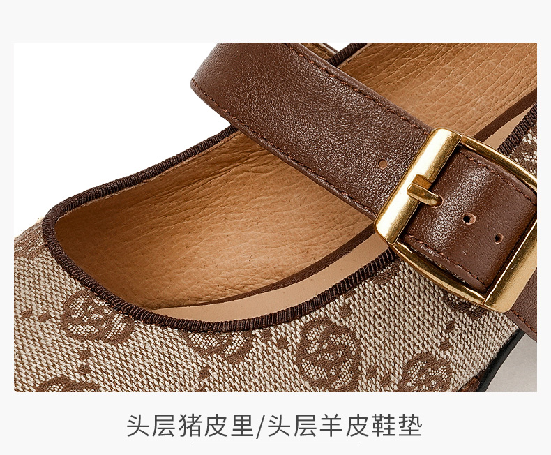 复古小香风,格纹布加头层牛皮低粗跟单鞋PS1257