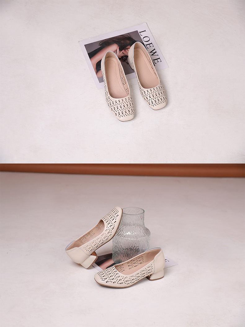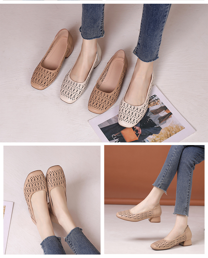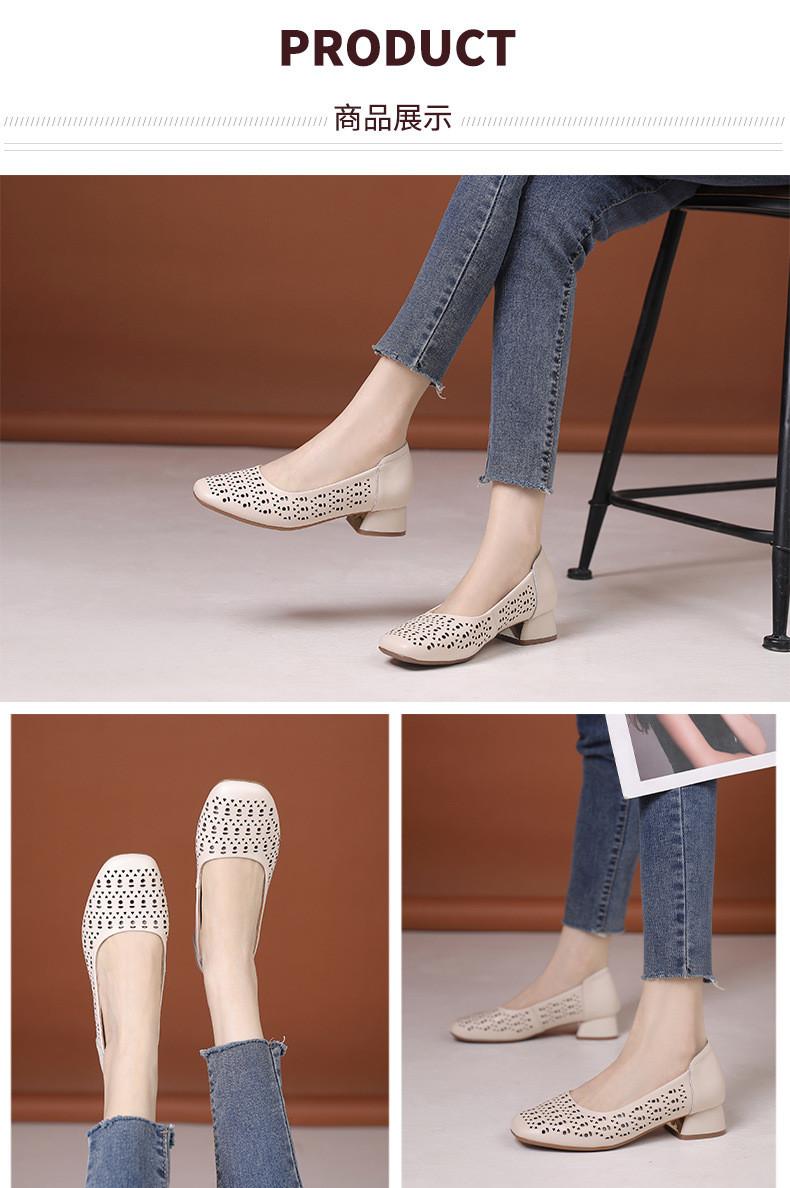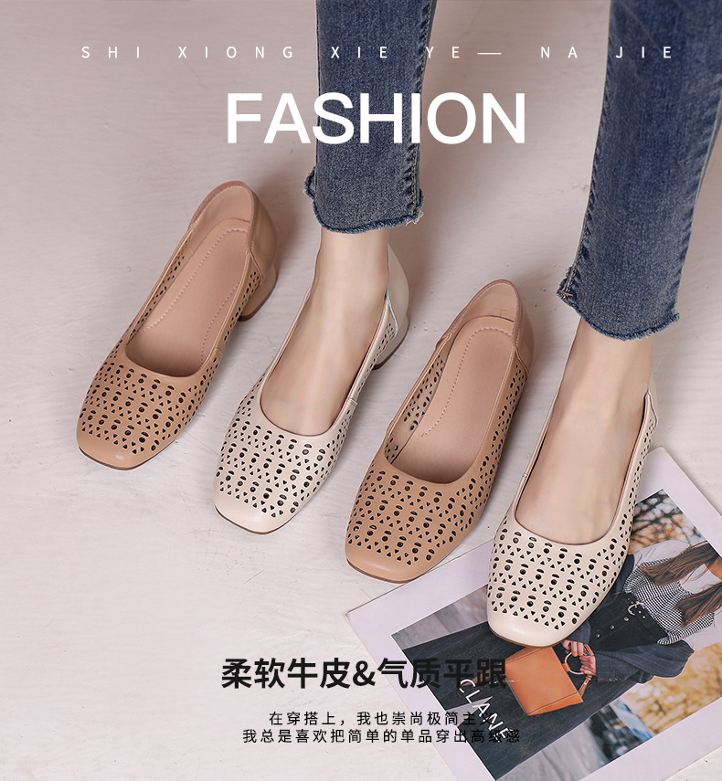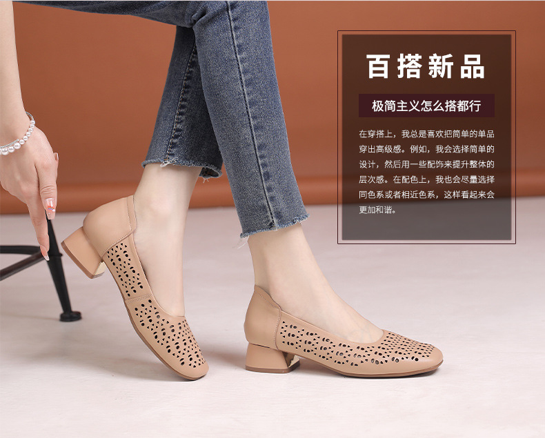 雀说浅口单鞋真皮洞洞浅口打孔镂空中跟凉鞋舒适四季单鞋AL1501