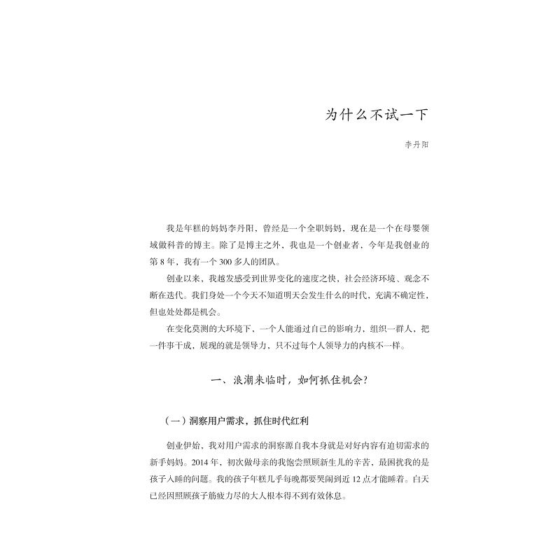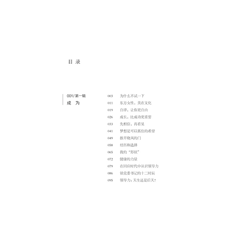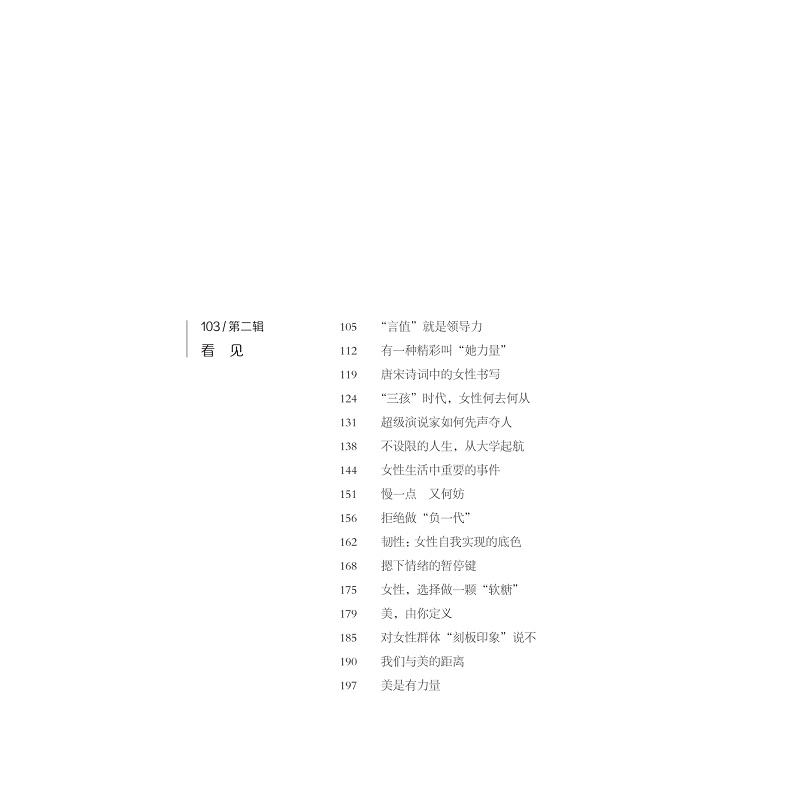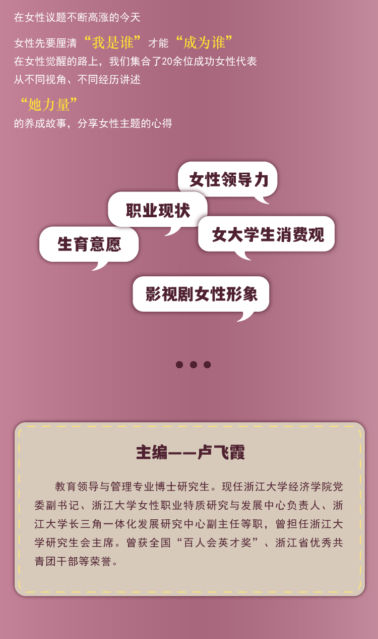 本书是关于女性成长故事的书。女性,被赋予很多角色和标签,但褪去这些面具,她们就是自己,一位平凡而伟大的女性;这也是一本关乎选择的书,“女人不是天生的,而是后天形成的”,成为什么样的女性,完全取决于自己的选择。在女性议题不断高涨的今天,女性先要厘清“我是谁”才能“成为谁”。在女性觉醒的路上,我们集合了20余位成功女性代表,从不同视角、不同经历讲述“她力量”的养成故事,分享女性主题的心得,比如女性领导力、职业现状、影视剧女性形象、女大学生消费观、生育意愿等主题,等等。书中的女性就像一束微光,为我们照出一条路,让我们发现,生活还有另一种可能。