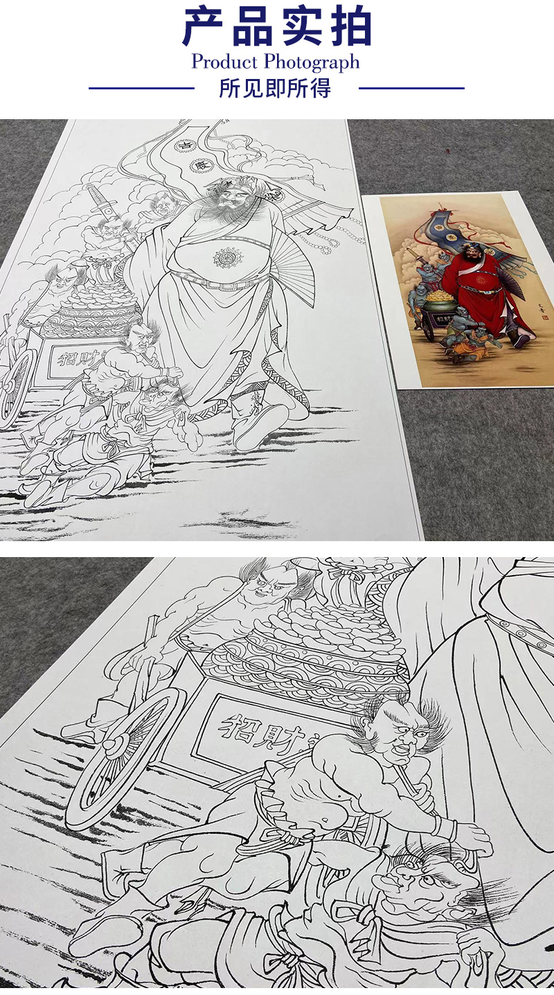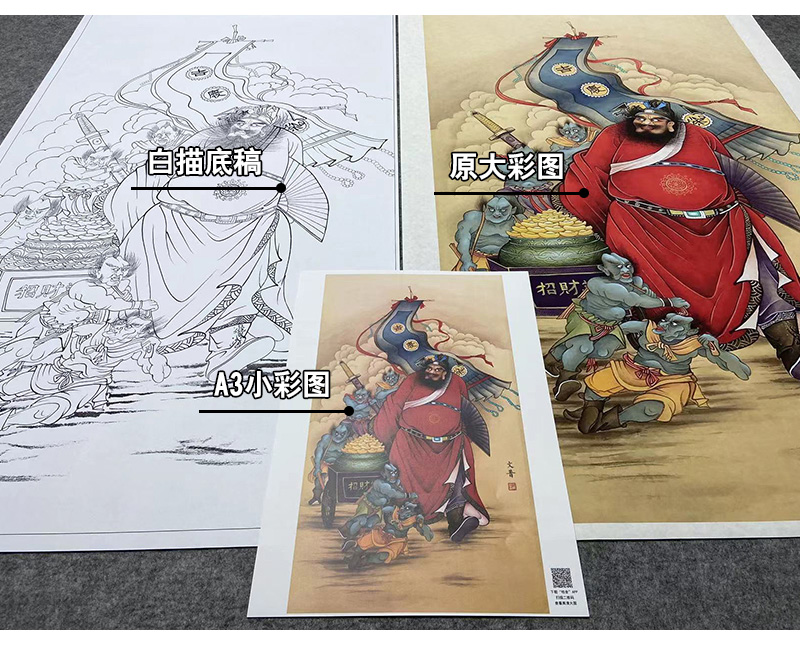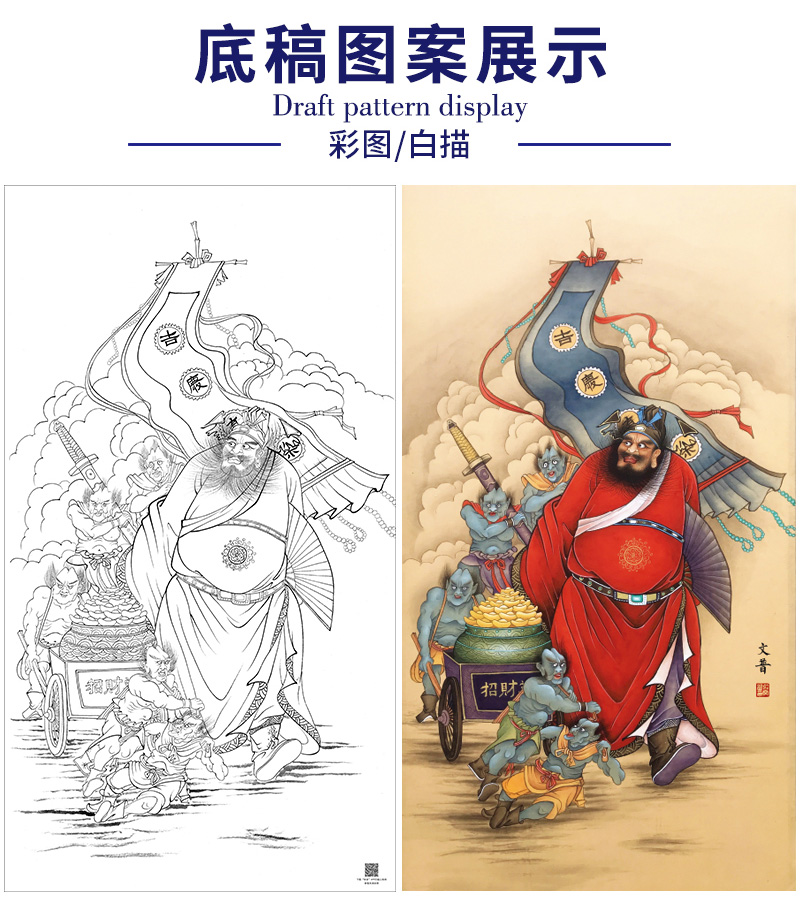 【大彩图】於文普工笔画白描底稿《五贵运财》钟馗临摹勾线人物线稿WP36