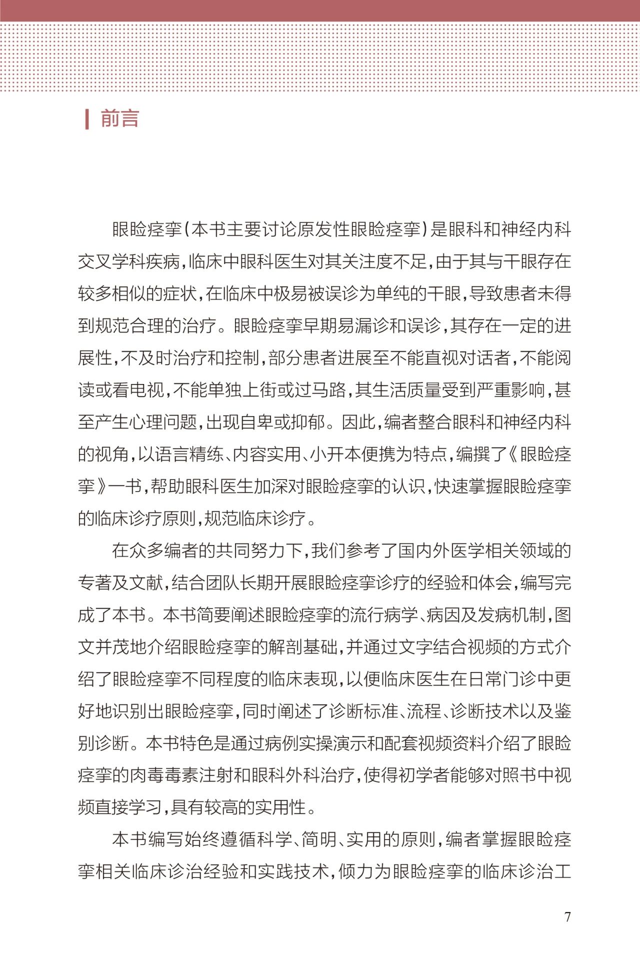 眼睑痉挛作为交叉学科疾病,眼科医生对其认识不足,特别是在疾病早期易误诊、漏诊,本书是首本系统、科学介绍眼睑痉挛诊疗的参考书。
