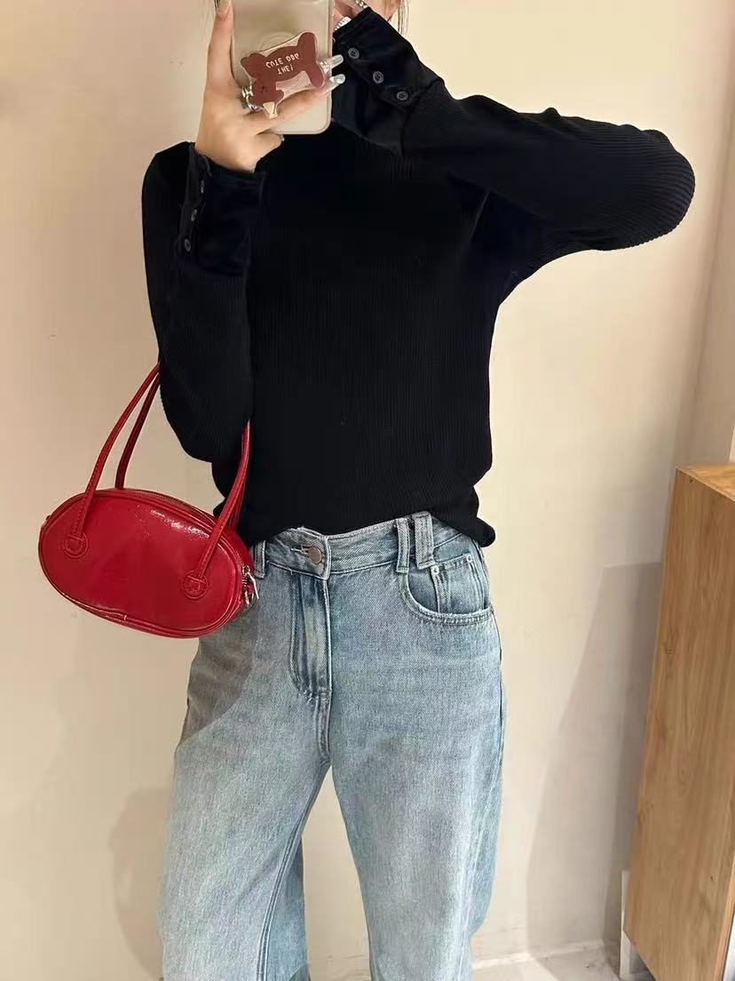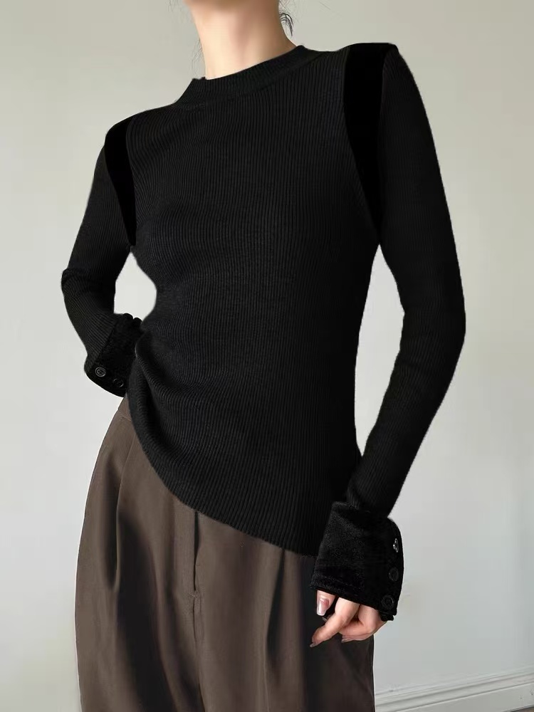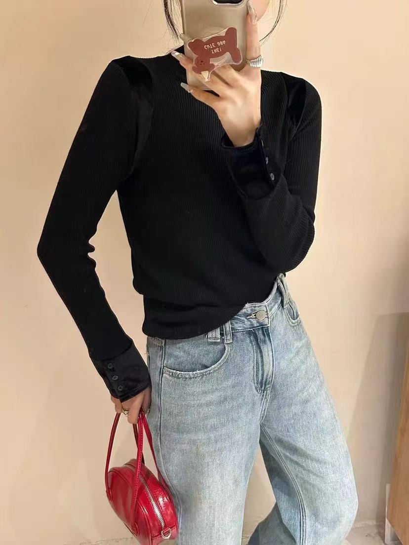 【清仓价】不参与退换 -25276针织拼金丝绒袖口三粒扣小衫-喜出