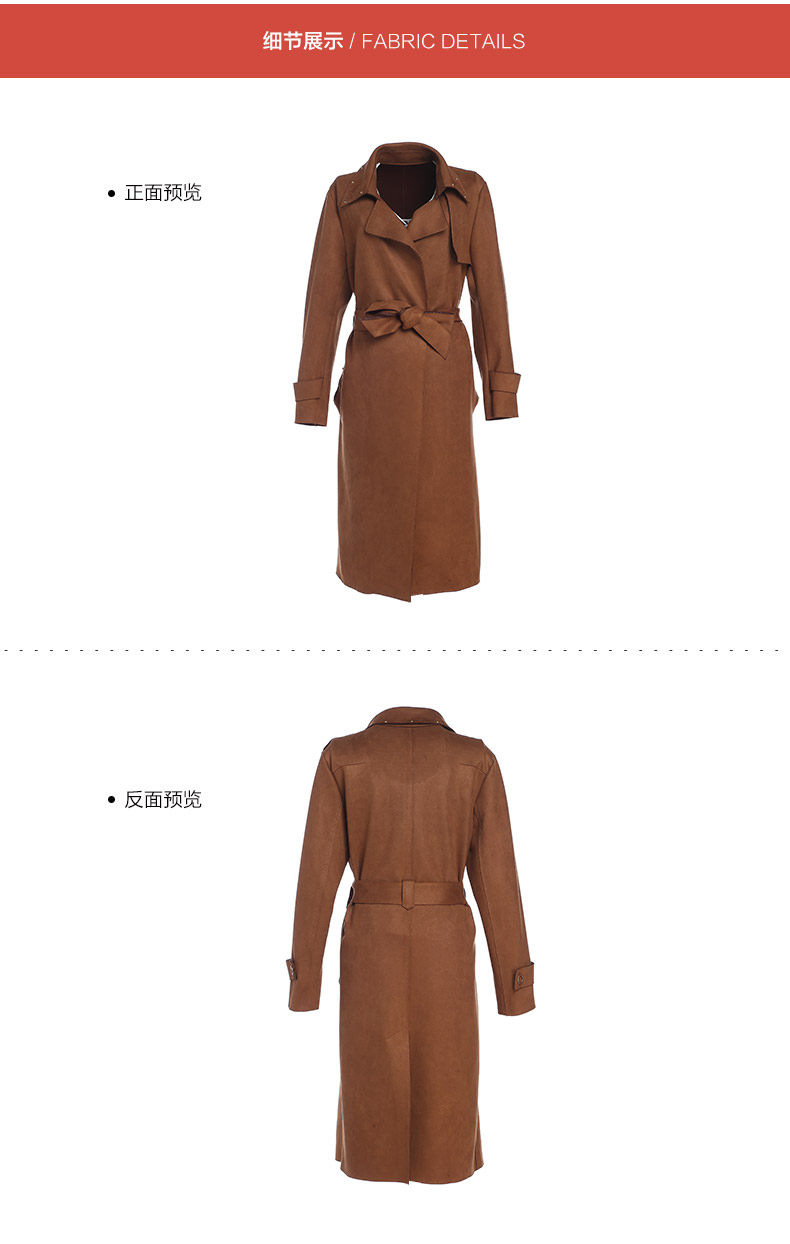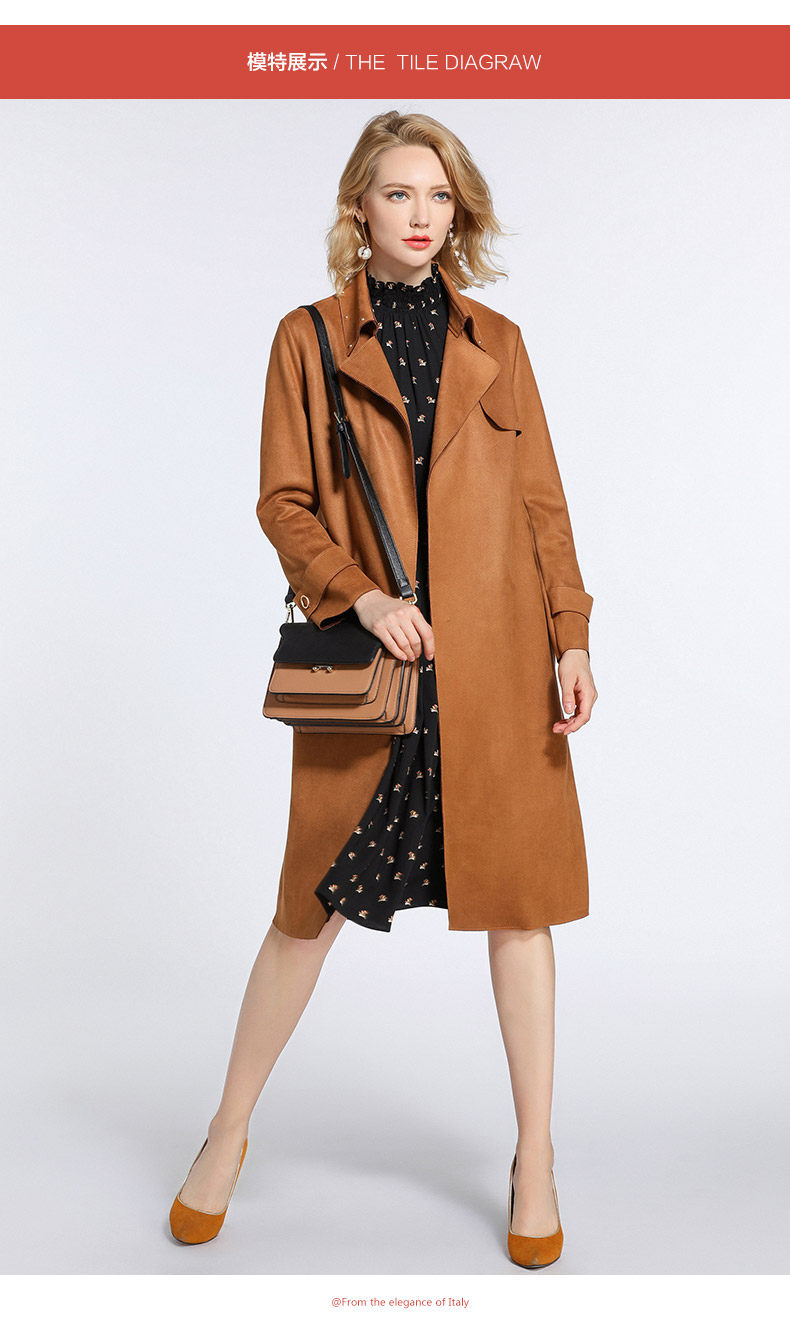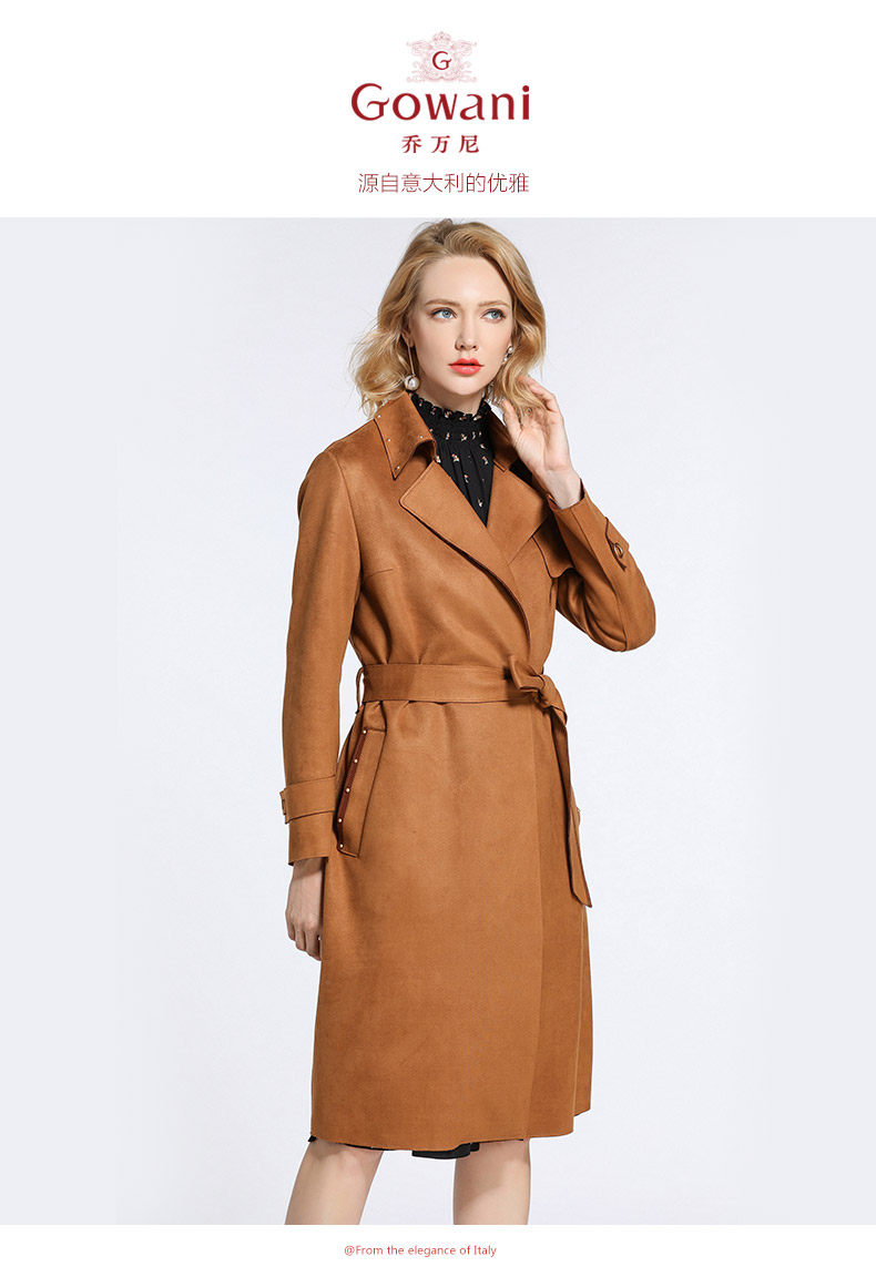 乔万尼春季风衣女中长款韩版鹿绒皮收腰系带纯色气质外套EB3A258