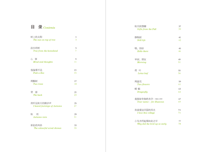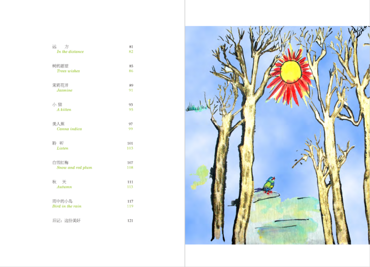 这本诗集中的诗歌灵感来自于张怀存创作的油画作品,两位作家把对生命的感悟和对大自然的热爱,化作清新灵动、情趣盎然的文字,跃然纸上,以孩童的口吻和自然万物发出共鸣,引导孩子们在诗情画意中感知最纯真的诗歌之美,本诗集的英文部分更是原汁原味的诠释出中国儿童诗的韵味,同时又非常到位的呈现了英文诗歌的韵律感。