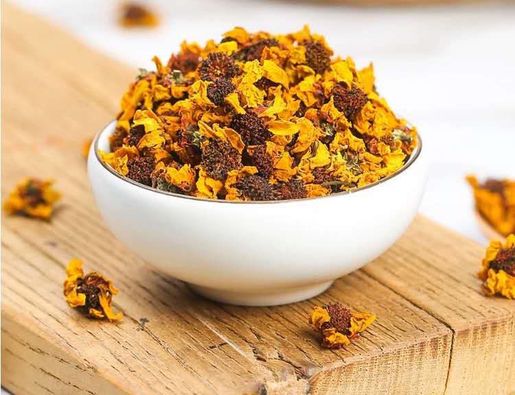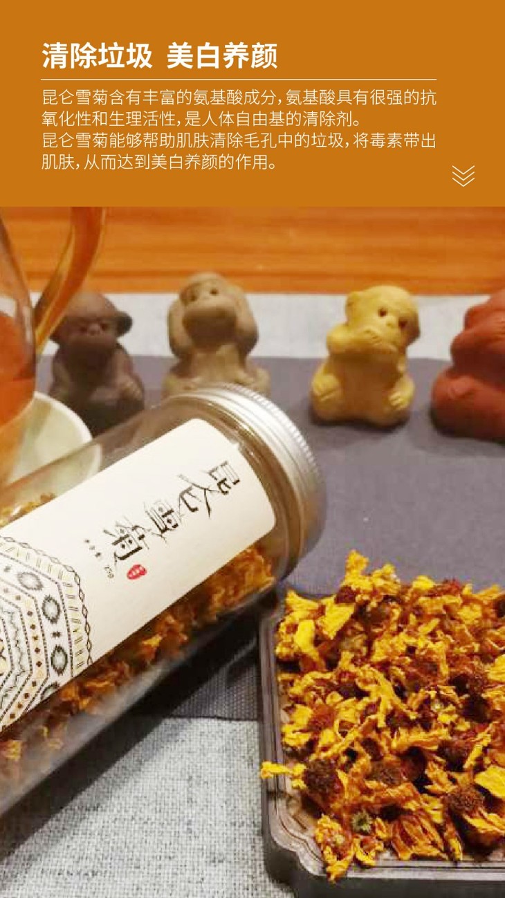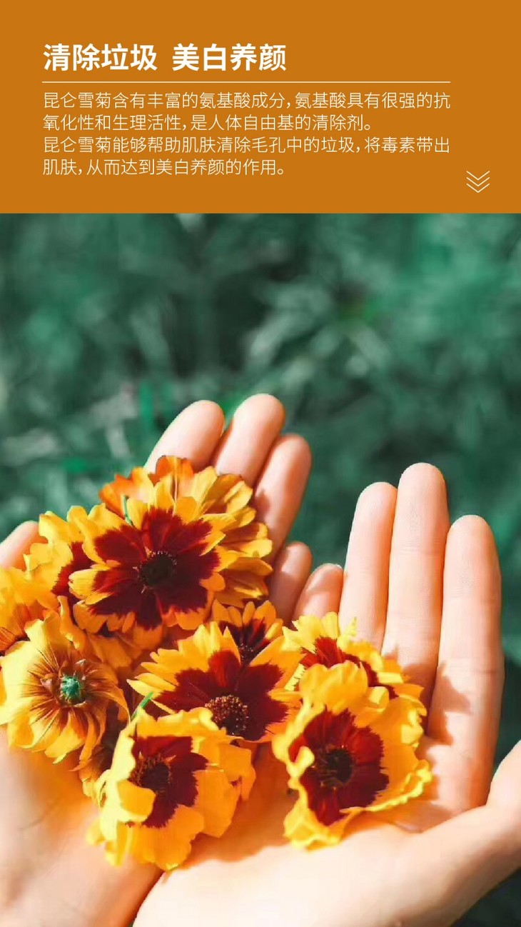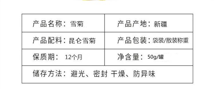 雪菊生长在天山海拔2600米以上的雪山之隅及喀喇昆仑山脉。是种具有独特功效的稀有高寒植物,花瓣呈金黄色,球型花蕊呈棕色,每年八月盛开,花期短促,似昙花一现,由于花期极短,产量极小,生长环境特殊,与冰山雪莲齐名,有着“茶中贵族”的美誉。雪菊原本主要分布在新疆和田地区,后来被北疆以及新疆全国各地引种种植。