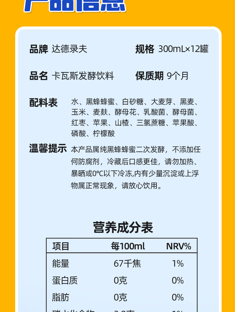 达德录夫·新疆卡瓦斯风味饮 多规格可选 蜂蜜 + 谷物发酵 甘冽香甜 低醇 0 脂