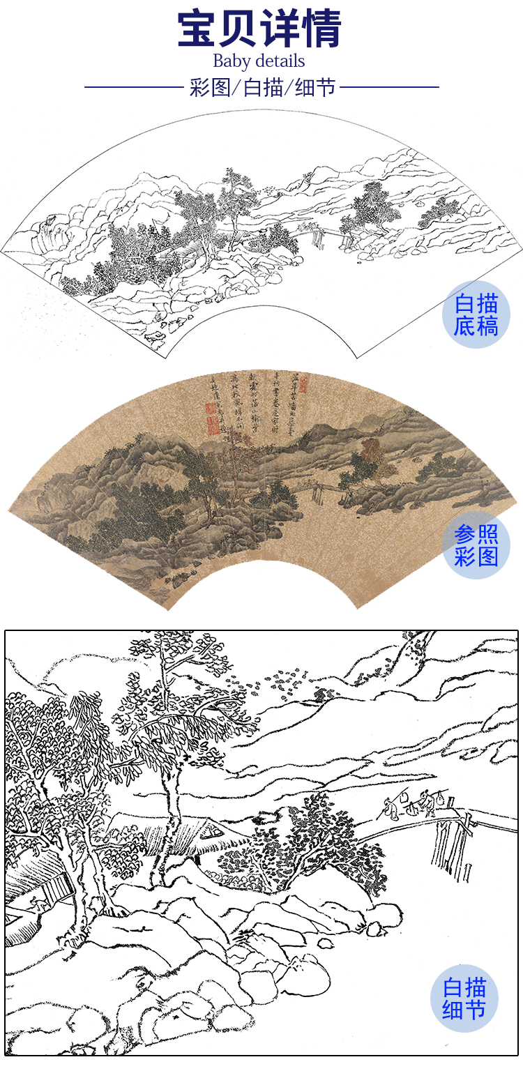 工笔画白描底稿 山水扇面小品 明 唐寅 SR22