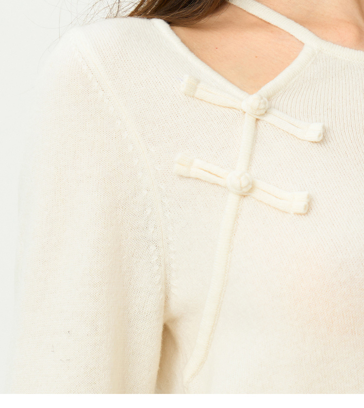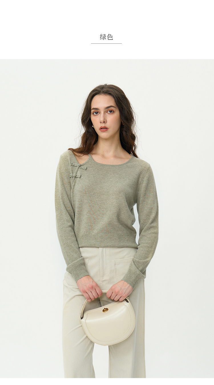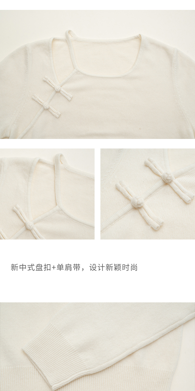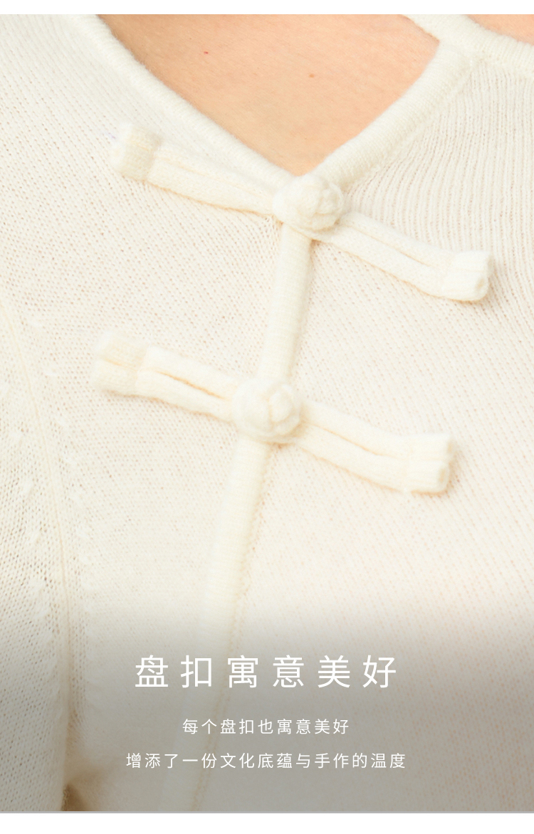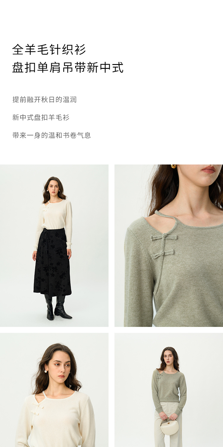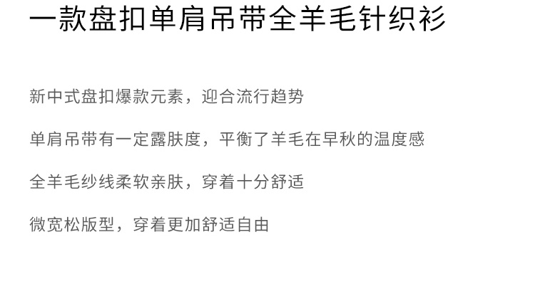 HeyDress新中式盘扣针织衫女春秋全羊毛单肩吊带镂空宽松短款上衣