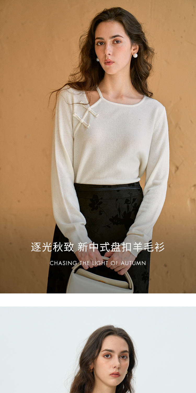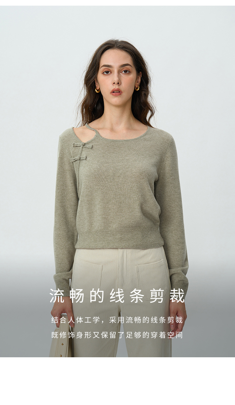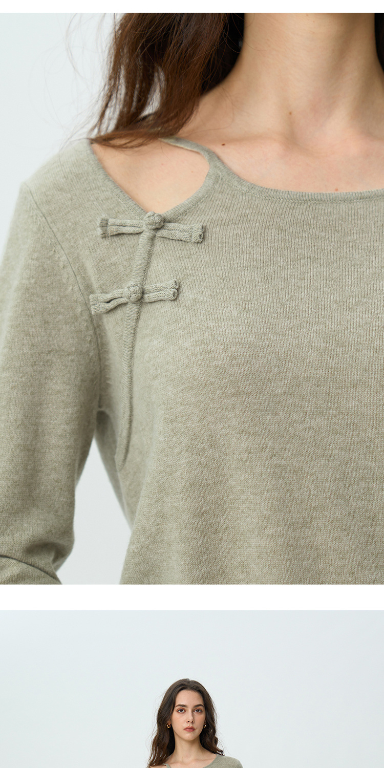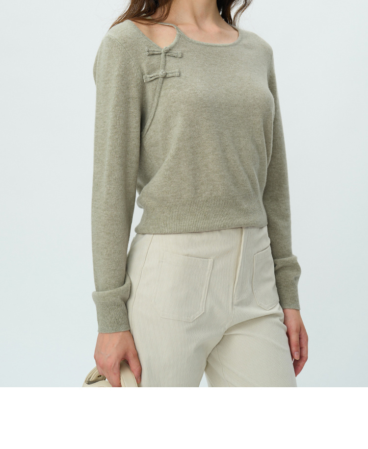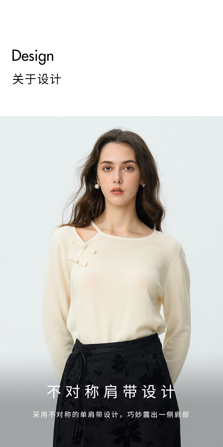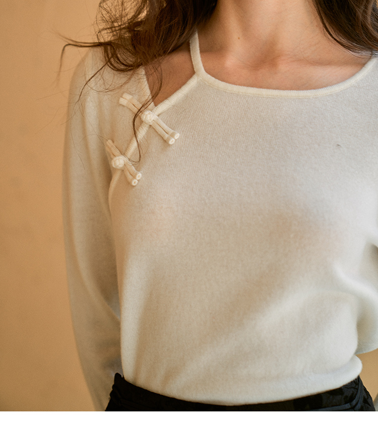 HeyDress新中式盘扣针织衫女春秋全羊毛单肩吊带镂空宽松短款上衣