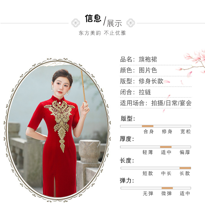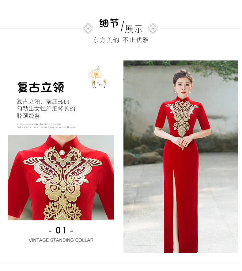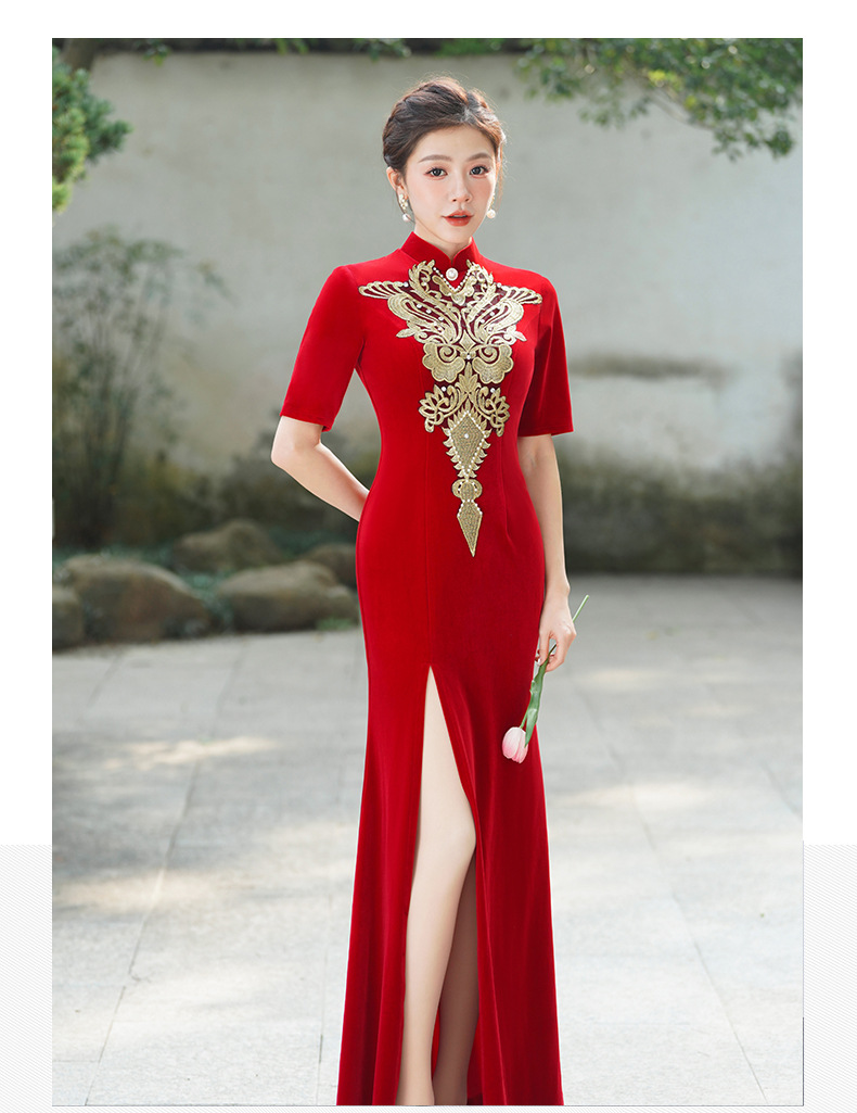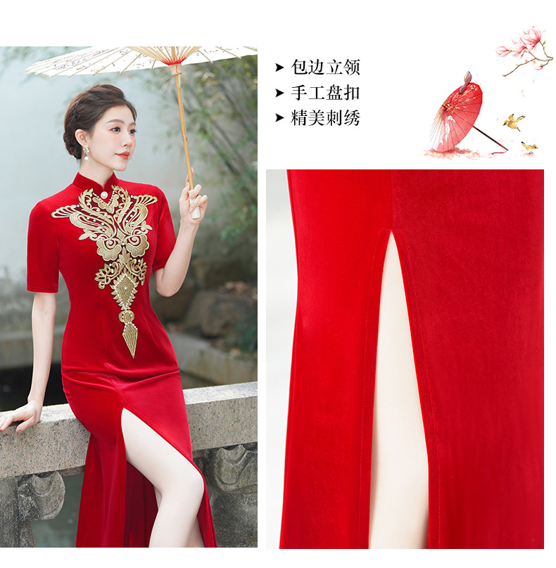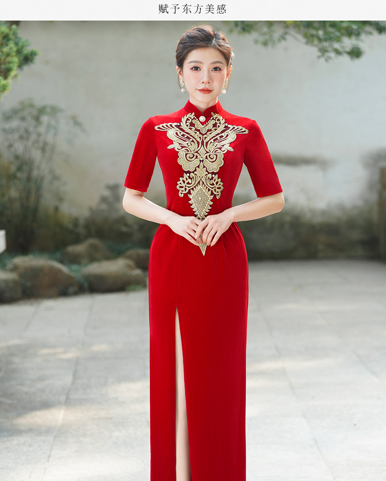 复古中式改良旗袍裙红色立领半袖高开叉长款旗袍礼服国风走秀款