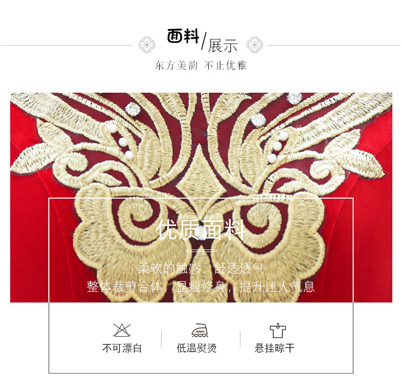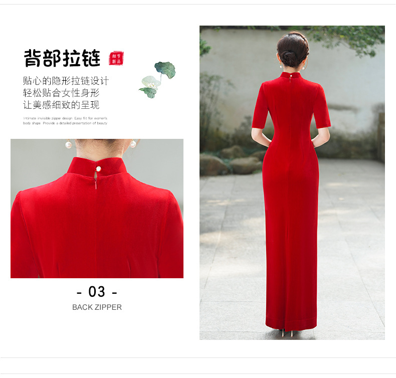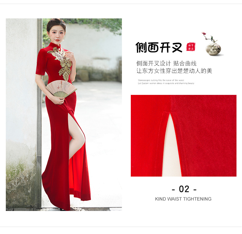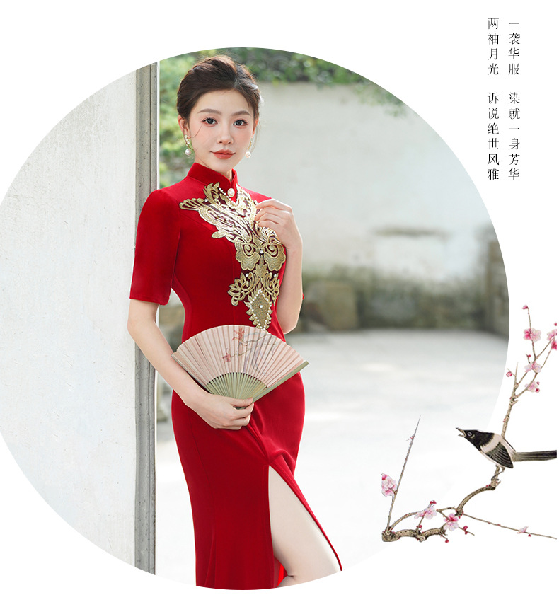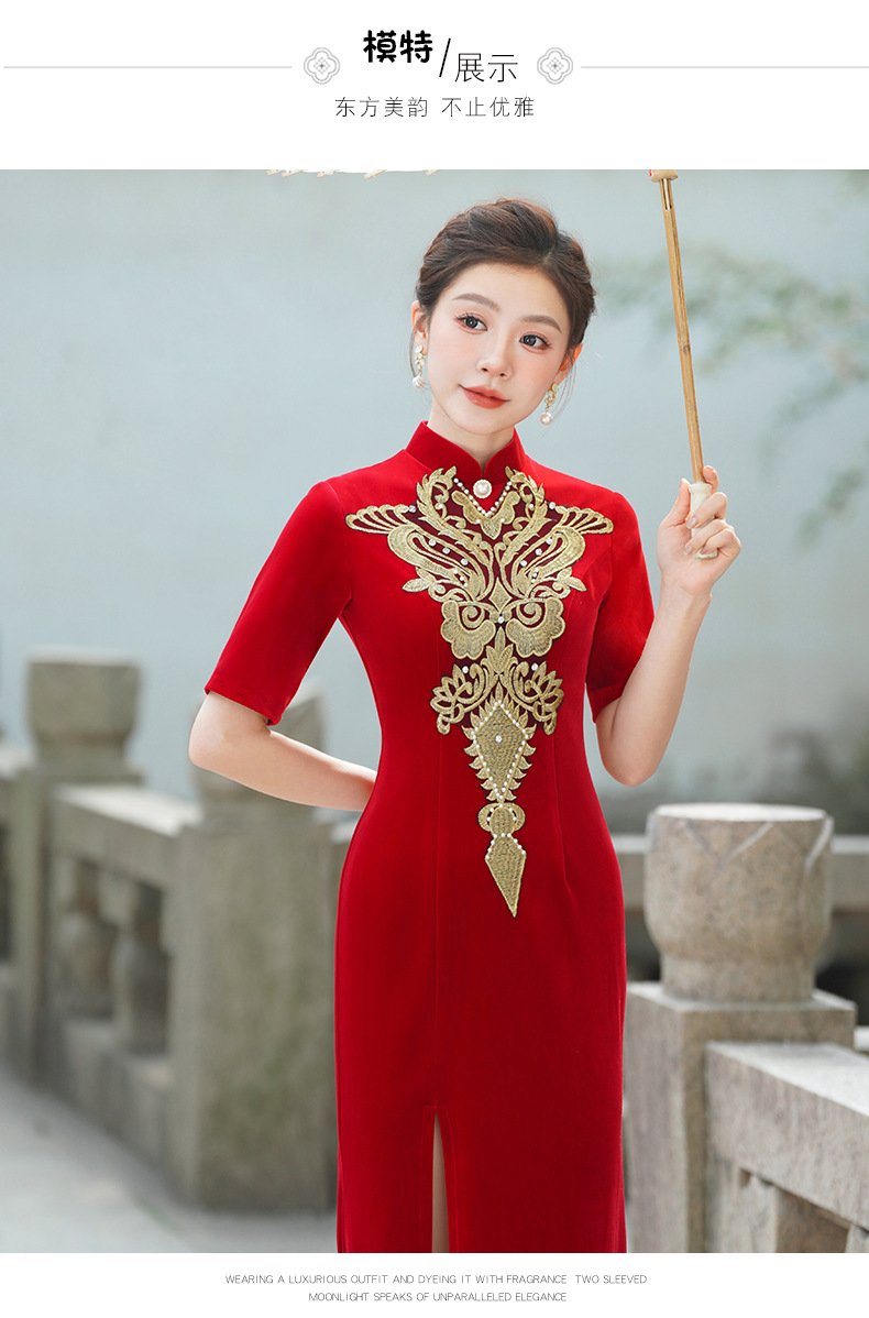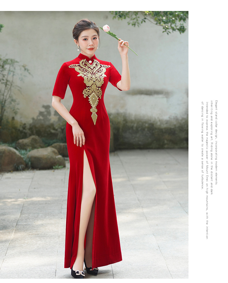 复古中式改良旗袍裙红色立领半袖高开叉长款旗袍礼服国风走秀款