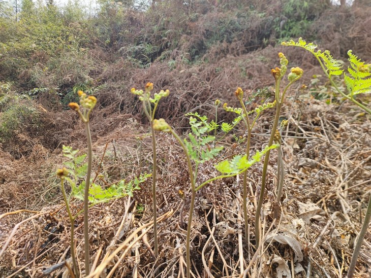 早春时节,伴着春雨的滋润,蕨菜也在地里、山上冒出了芽。蕨菜在萌发后10 天左右,高约20厘米,看起来像是小孩握紧的拳头,叶柄粗壮脆嫩,叶芽还没有伸展开,这个时候是采摘的最佳时间。