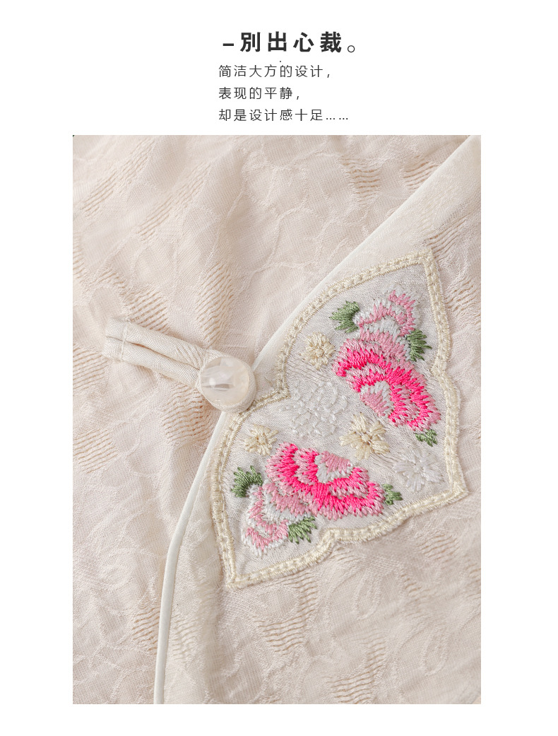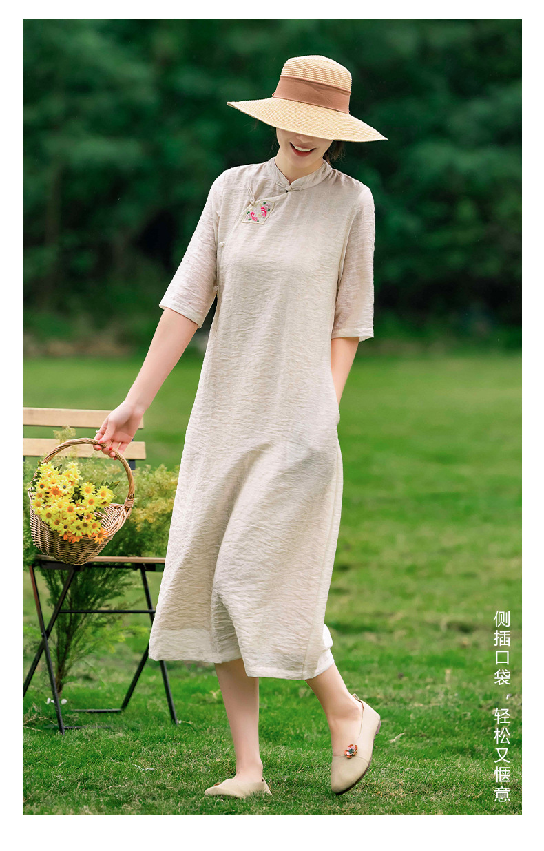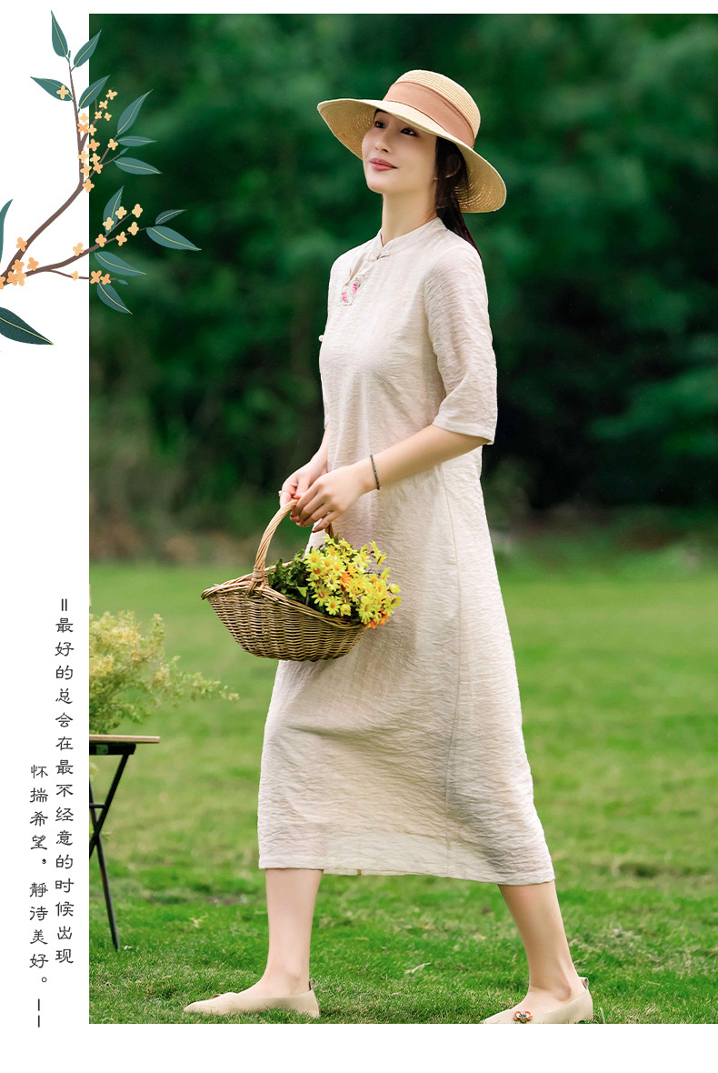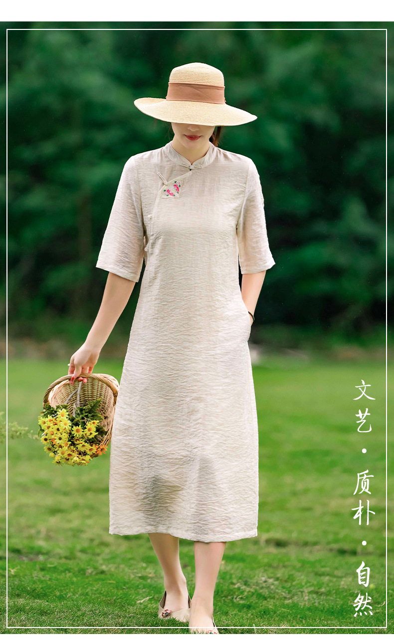 HM-S358春夏禅意风改良旗袍古典气质绣花立领开襟天丝提花文艺连衣裙