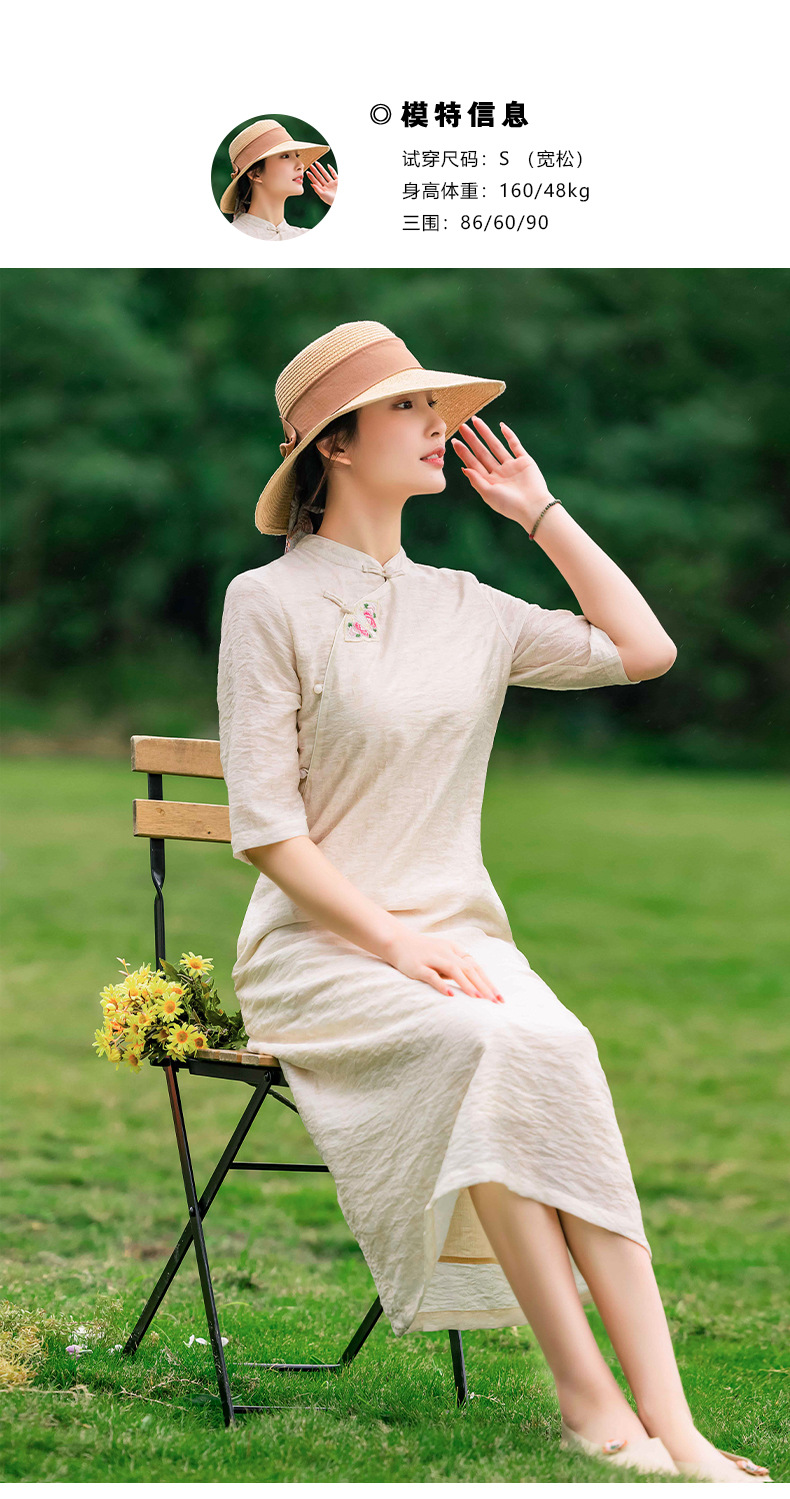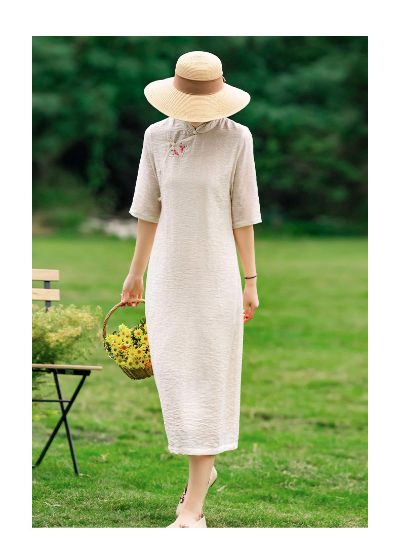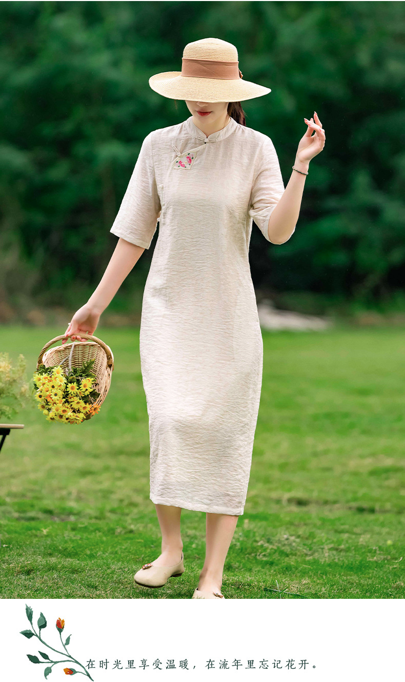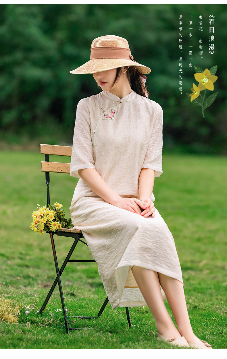 HM-S358春夏禅意风改良旗袍古典气质绣花立领开襟天丝提花文艺连衣裙