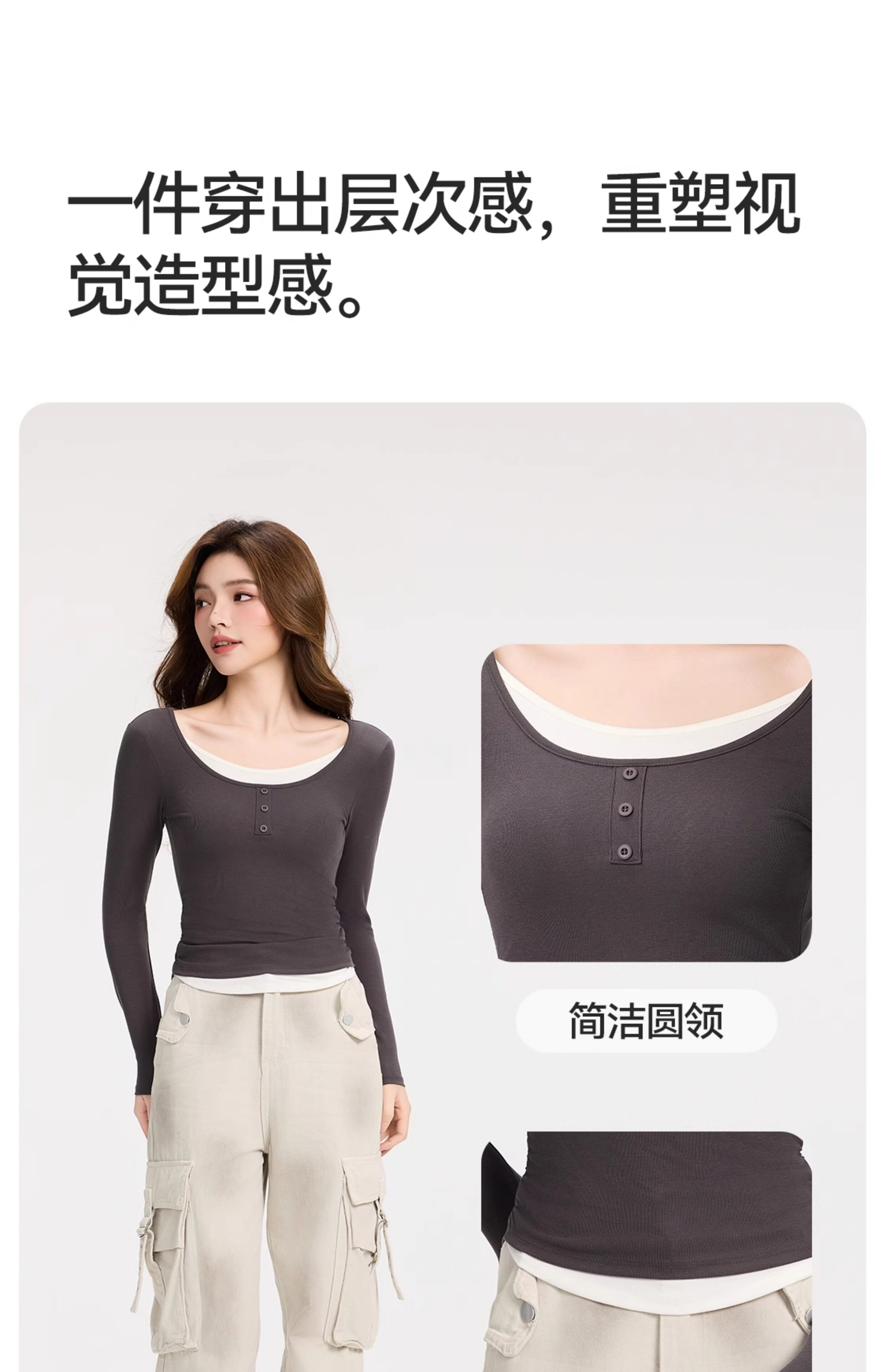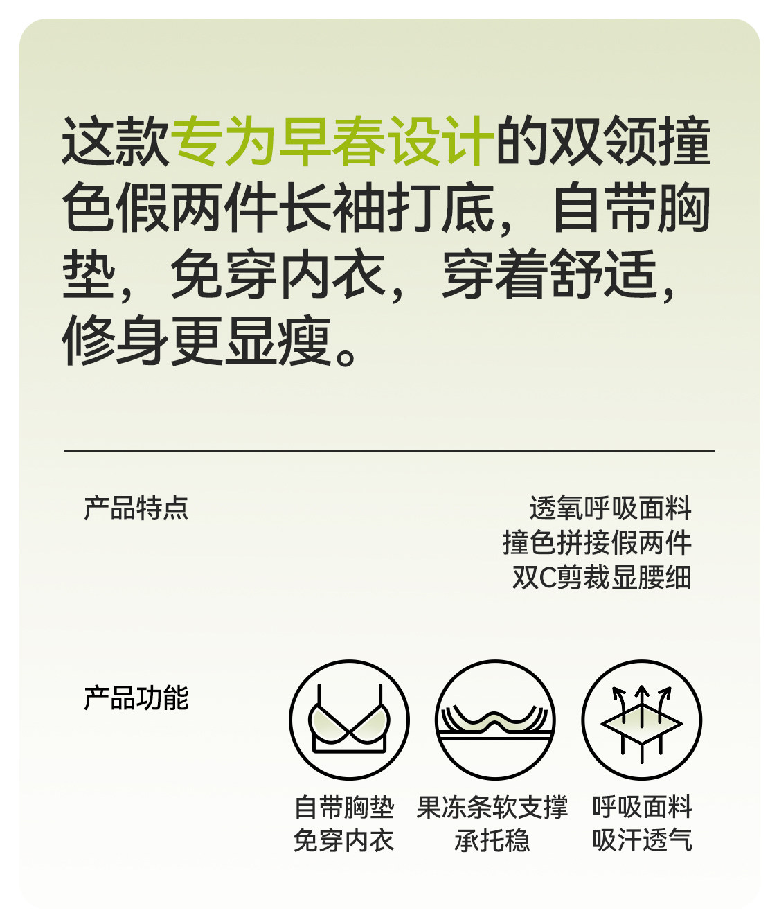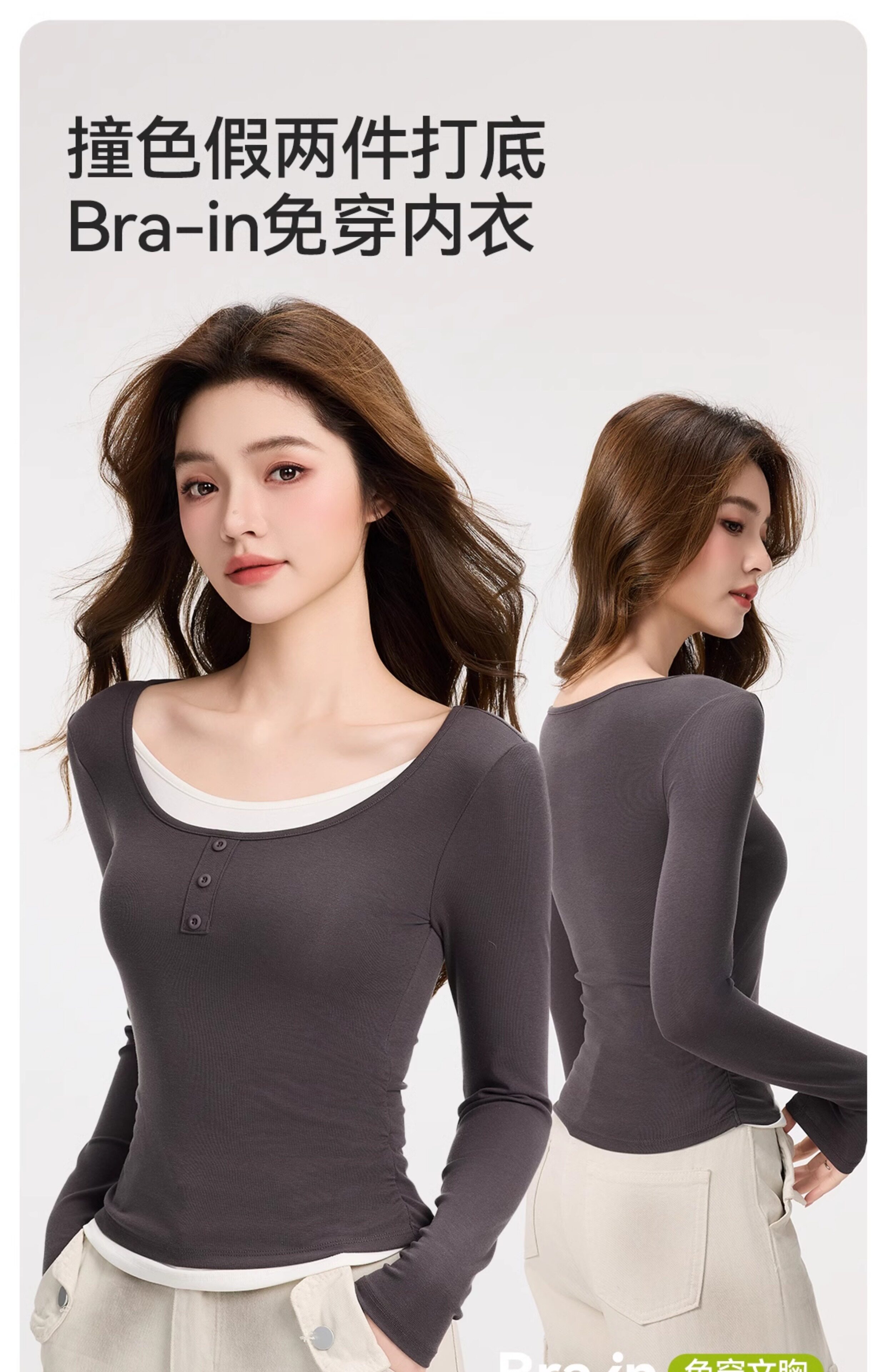 内茵2026新款假两件长袖女士带胸垫百搭打底衫修身显瘦撞色内搭