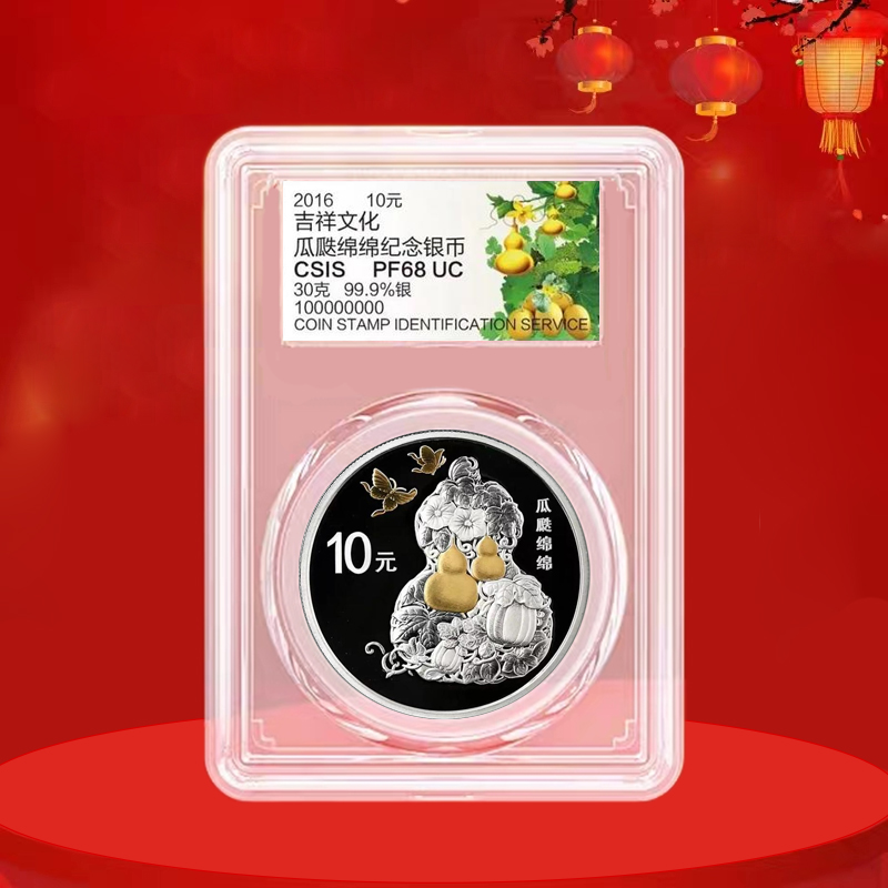 今天给大家带来三枚2016年的吉祥文化纪念币,分别为五福拱寿、瓜瓞绵绵和年年有余。每一枚的设计都非常经典,颜值在线,且都是评级封装版,68分的高分,品相有保障,也方便长期保存,收藏送礼都合适。