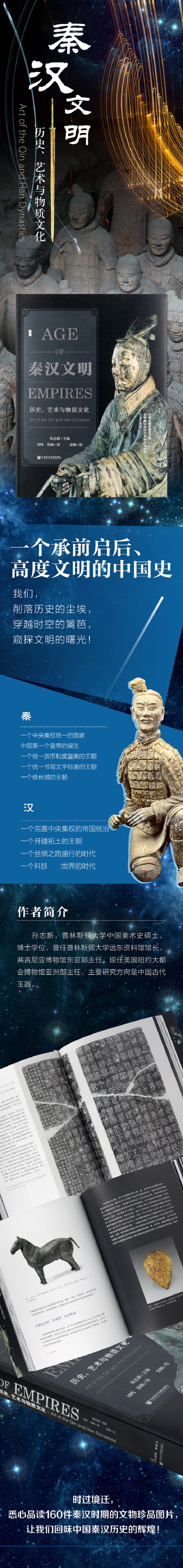 到公元前3世纪,年迈的周朝走完了自己的旅程,诸侯国之间不断爆发争夺地盘的战争。最后,秦国打败了所有的对手,统一了中国的大部分地区。秦朝的统治者名为嬴政,他认定,控制手段是宣扬团队精神:让所有人拥有同样的公民身份,并保持那样的身份。为此,他统一了货币和度量衡。他下令使用统一的书写文字,这让他控制了政治话语权。他开始修建长城,用砖块和灰浆宣告“我们”和“他们”的对立。所有这些的作用是在不同的人群中创造了一种基本的共同身份感,一种秦人的身份感——或者用可能源自“秦”的现代英语的说法,一种中国人的身份感。嬴政成了中国的第一位皇帝,给自己封了一个至高无上的称号——秦始皇,并在中国西北部的西安附近修建了一座陵墓,以彰显自己的显赫。至于墓里有什么,只有文字记载(亭台、蜡烛等,它从未被发掘)。但是,它的存在造就了20世纪晚期的一项伟大的艺术历史发现。1978年,考古学家根据当地农民的指引,发现了陵墓附近埋葬的一支由约7000尊真人大小的陶制士兵组成的军队。汉朝进一步完善了中央集权的帝国统治,对外向全球扩张疆域。汉代艺术家追随秦代先人的步伐,但也有所调整。有一段时间,他们保持着对现实主义的兴趣,不过似乎将重点从人转向了自然界。物质的丰富性和多样性在不断增长,比如经陆地和海洋从阿富汗、印度、波斯、欧亚大陆的游牧地区和地中海带来的镶金首饰、紫水晶项链和奢华的纺织品。《帝国时代》一书通过近160件秦汉时期的文物珍品图片,结合新的研究成果,为读者听过了认识秦汉艺术与文化的多元视角好崭新观点。