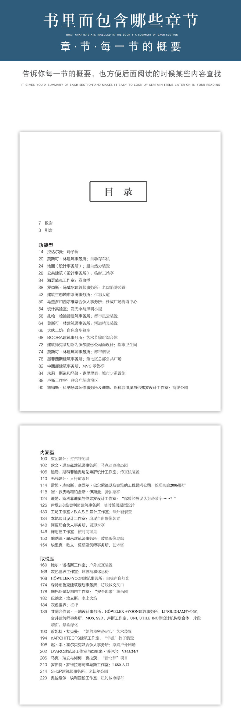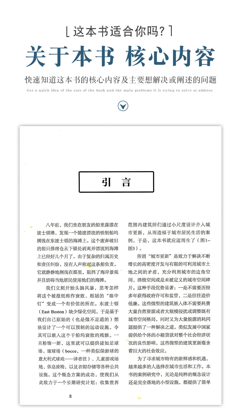 全书囊括了来自全球建筑师的五十个简洁而不简单的创意性案例,小到公交站台雨棚照明方案的改进,大到近来在设计领域屡获奖项的城市废弃高架铁路空间的再利用,既有纯粹的创新概念也有高完成度的实际项目。书目组织按这些案例创意点侧重的不同,大致划分为偏重功能性、思想性、视觉感染力等三大类。