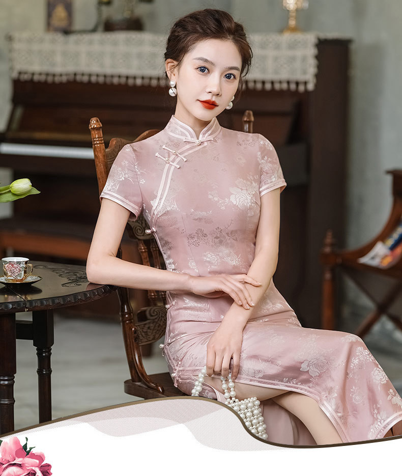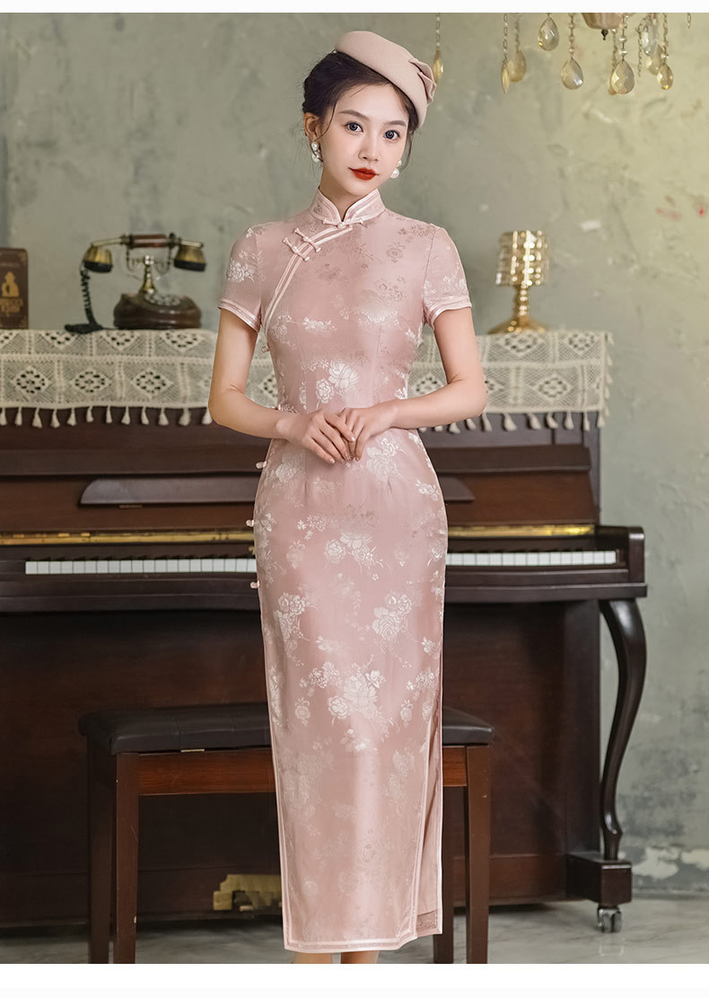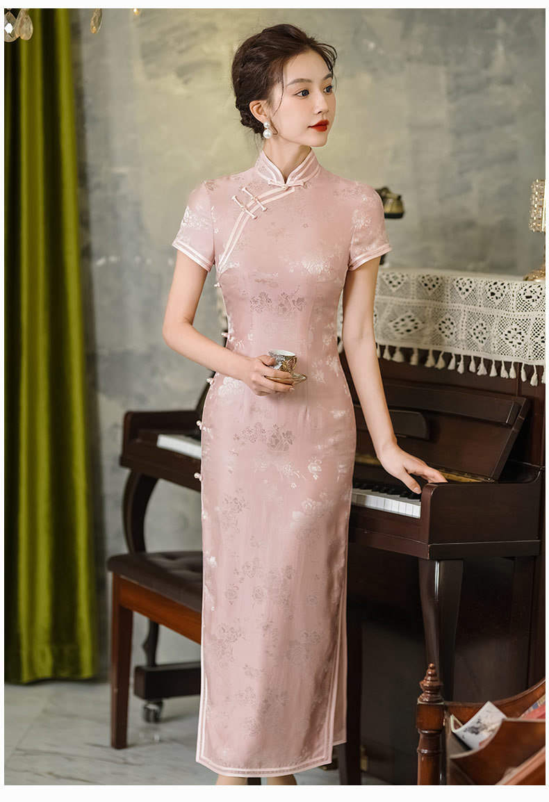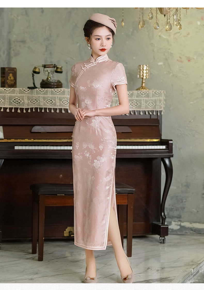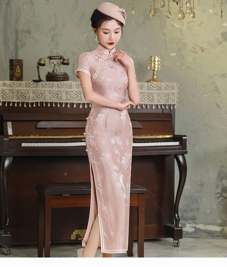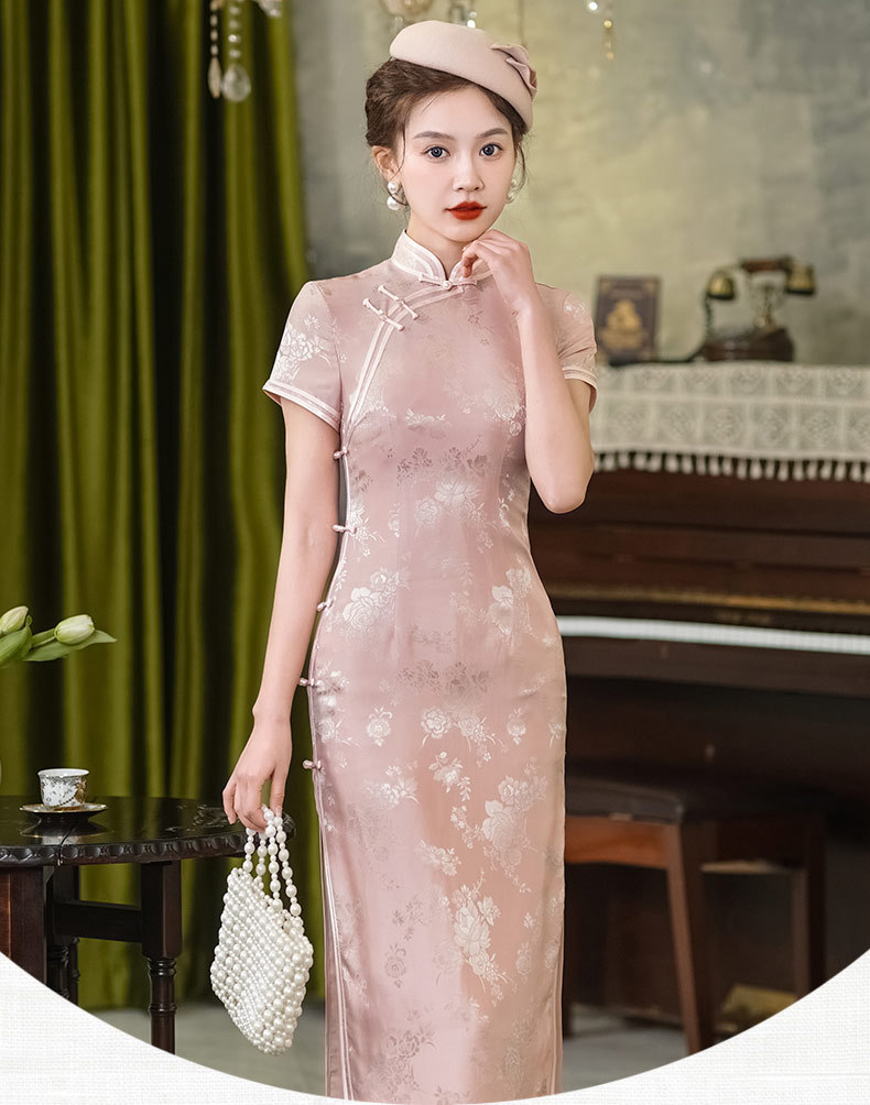 WX-新款真丝旗袍手工缝制高端气质长款改良版桑蚕丝修身礼服日常
