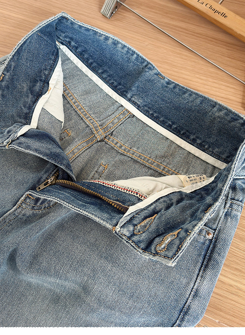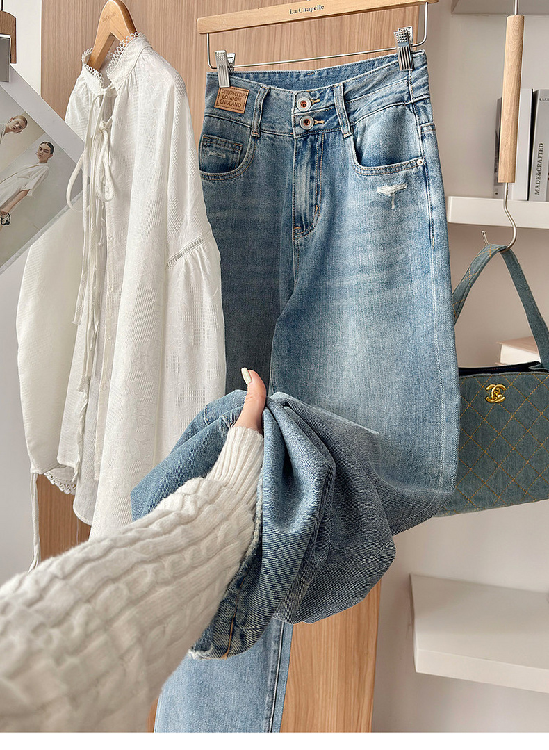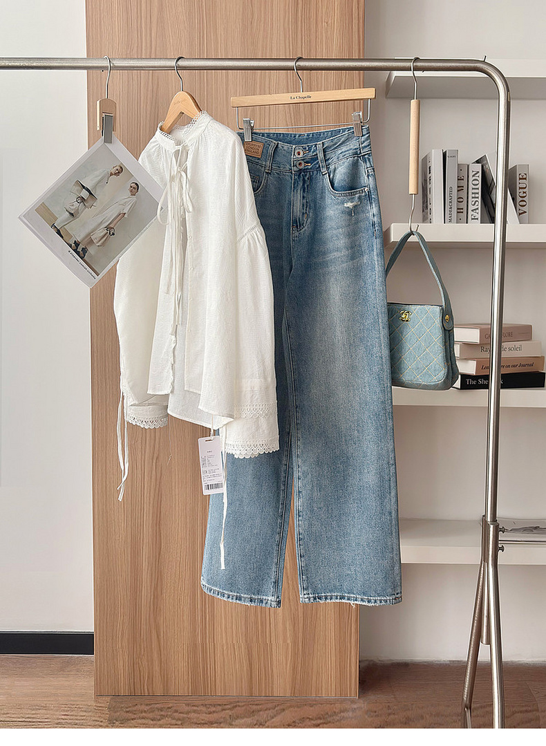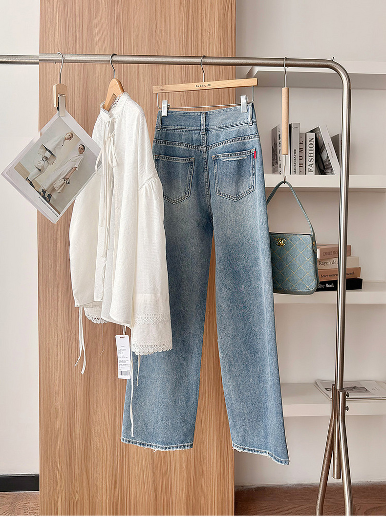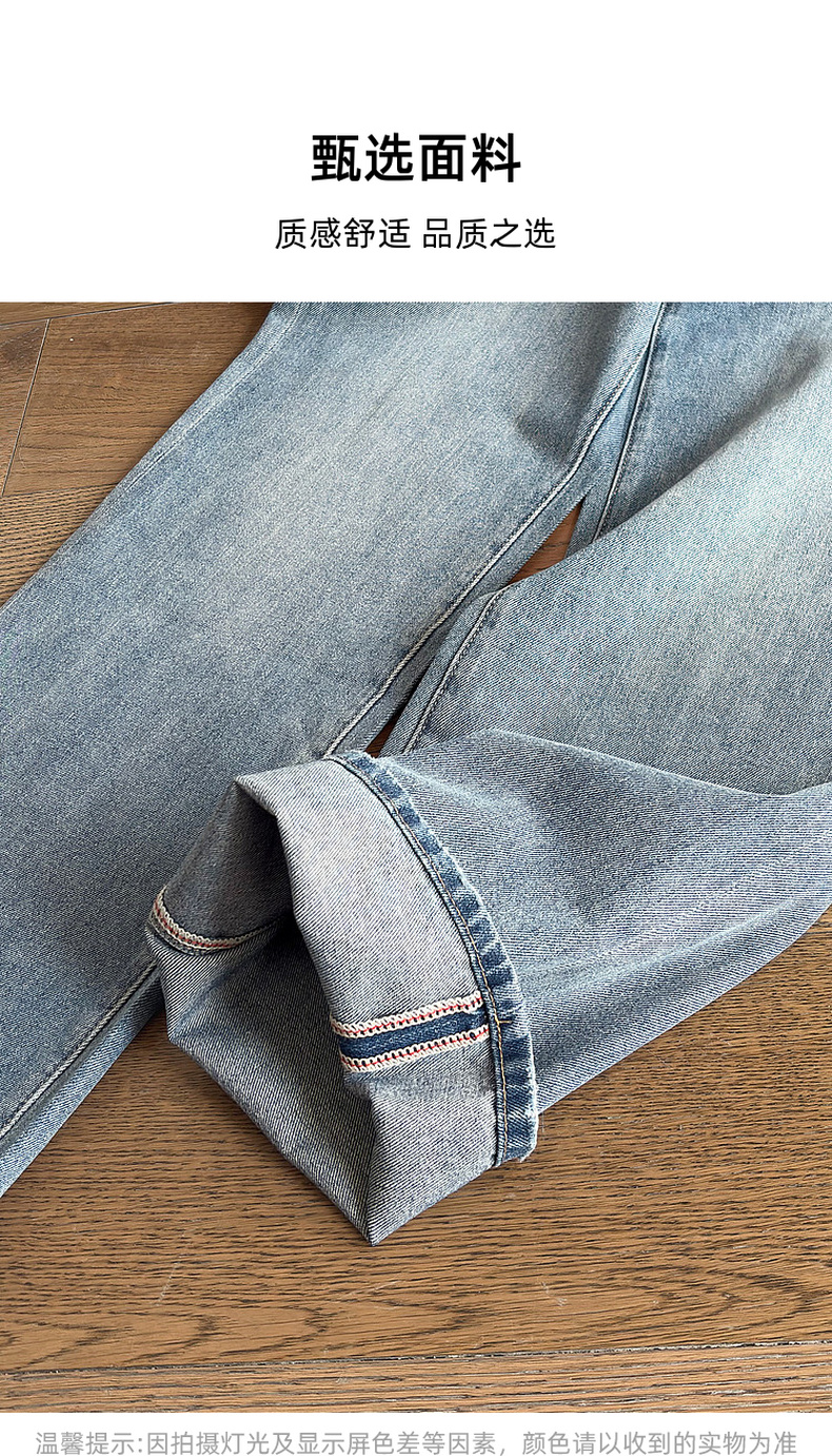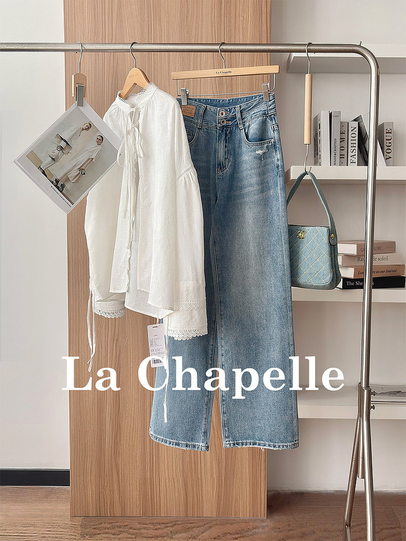 专柜实拍【简约松弛感】拉夏贝尔/La Chapelle垂顺有型高腰两扣撞色标裤袢做旧设计感直筒牛仔长裤
