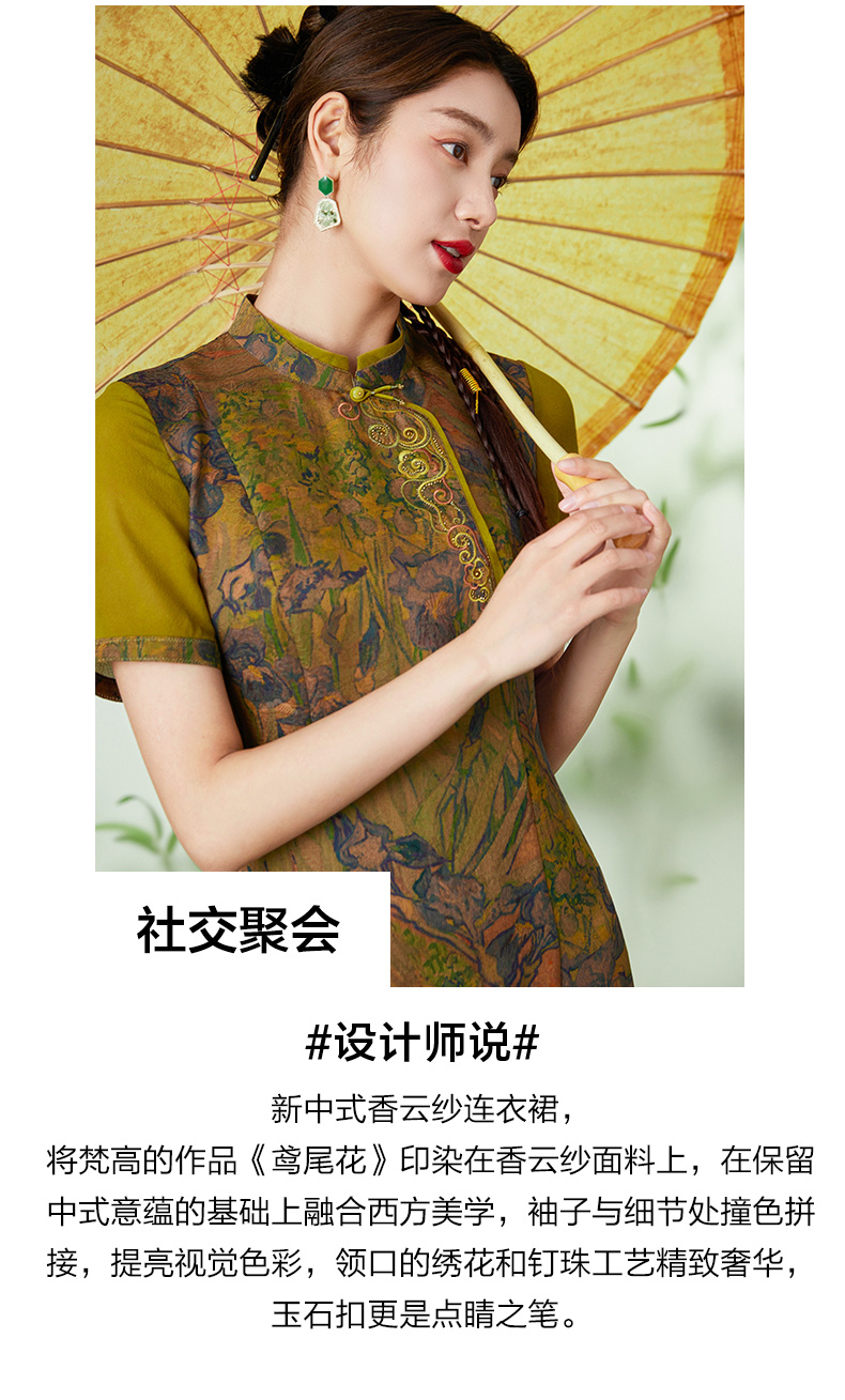 【梵高的鸢尾花】【香云纱】乔万尼24mm重磅真丝连衣裙古典油画风旗袍EM2E837