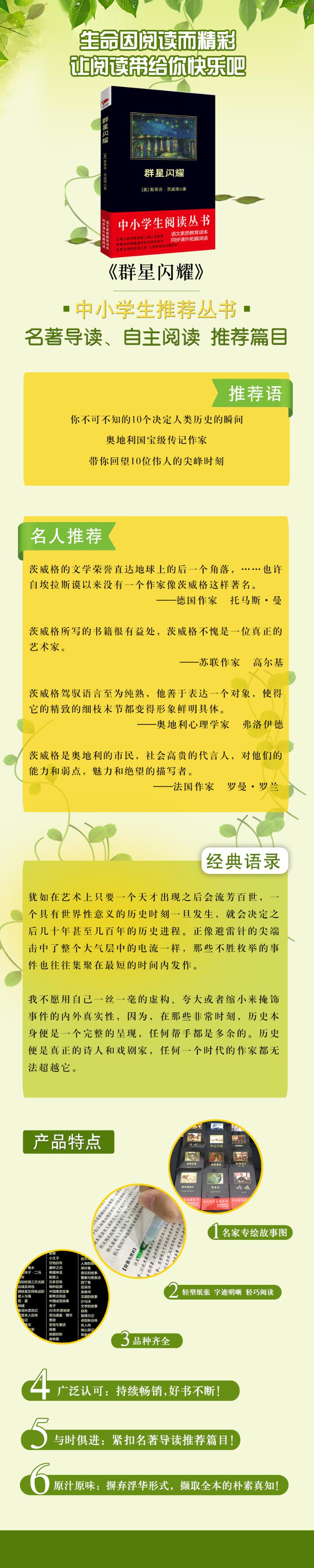 斯蒂芬·茨威格编著的《群星闪耀》是展现岁月雕琢的旷世杰作,折射时代进程的文学经典,以诗人的情感讲述人物心灵故事,用隽永的笔触记录历史特定转折。从二十世纪二十年代起,茨威格便“以德语创作赢得了不让于英、法语作品的广泛盛誉”。无论是诗歌、小说、戏剧、文论、传记,还是文学翻译,茨威格都能从独特的视角,用自己别出心裁的风格,做到游刃有余,其中尤以在小说和人物传记方面的成就最为卓著。