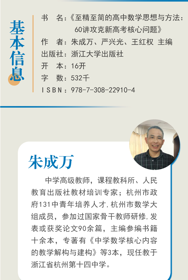 朱成万,中学高级教师,课程教科所、人民教育出版社教材培训专家;杭州市政府131中青年培养人才,杭州市数学大组成员,参加过国家骨干教师研修,发表或获奖论文90余篇,主编参编书籍十余本,专著有《中学数学核心内容的教学解构与建构》等3本,现任教于浙江省杭州第十四中学.