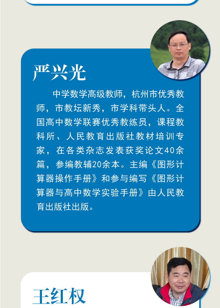 严兴光,中学数学高级教师,杭州市优秀教师,市教坛新秀,市学科带头人.全国高中数学联赛优秀教练员,课程教科所、人民教育出版社教材培训专家,在各类杂志发表获奖论文40余篇,参编教辅20余本.主编《图形计算器操作手册》和参与编写《图形计算器与高中数学实验手册》由人民教育出版社出版.