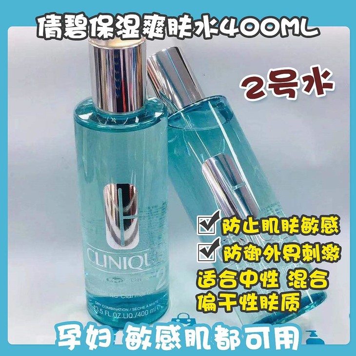 倩碧保湿爽肤水400ml#1号水/#2号水👍全新保湿洁肤水,专为亚洲女性娇嫩敏感的肌肤研制🤪,❌不含酒精成分,不仅能瞬间补水💦,而且独特配方,更能加强肌肤天然滋润保护膜♻,增强肌肤自身的保湿滋润能力⬆,同时增强肌肤抵抗力,👊防御外界刺激,防止肌肤敏感!💁#1号水适合干性、敏感性肤质/#2号水适合中性、混合偏干性肤质,根据自己肤质选择号码哦😇~