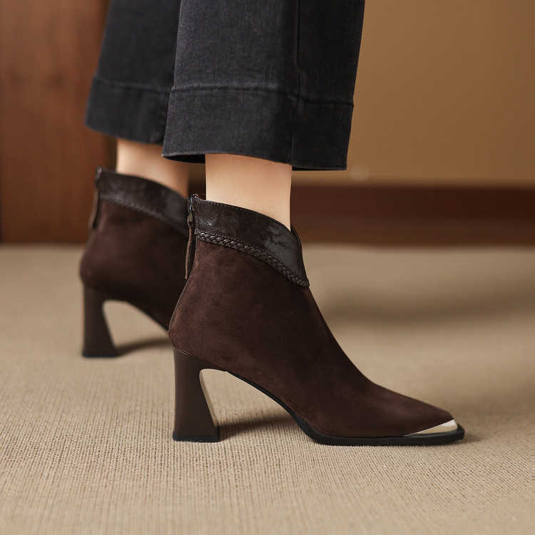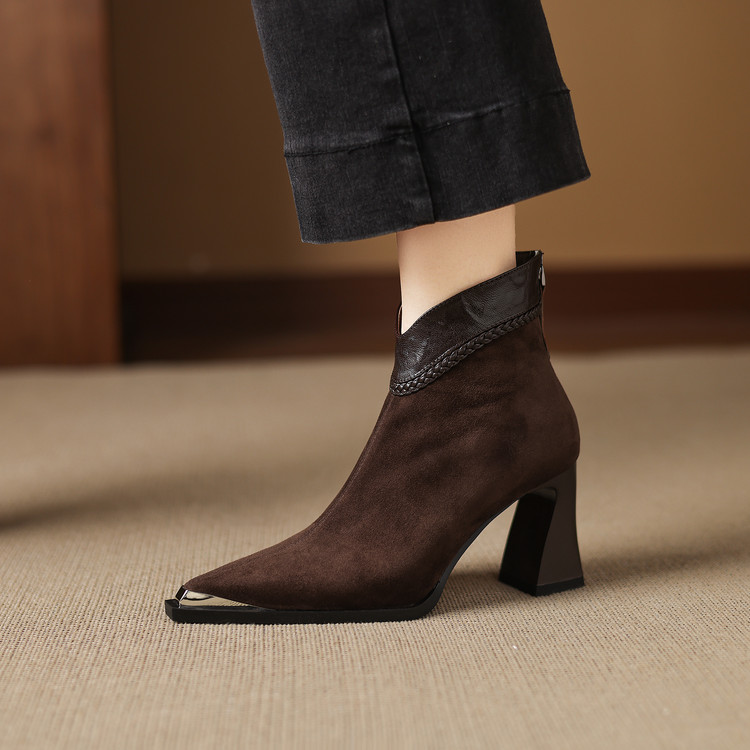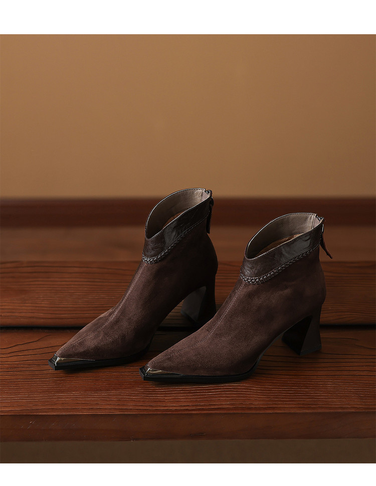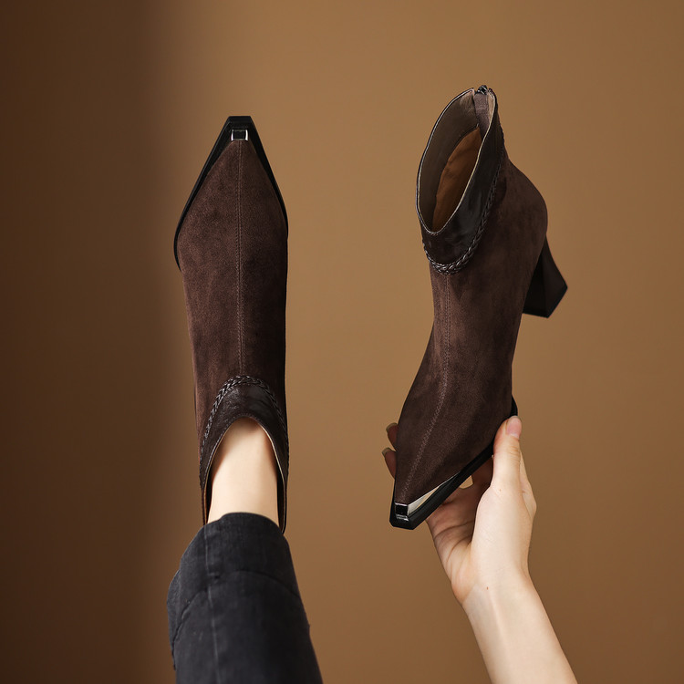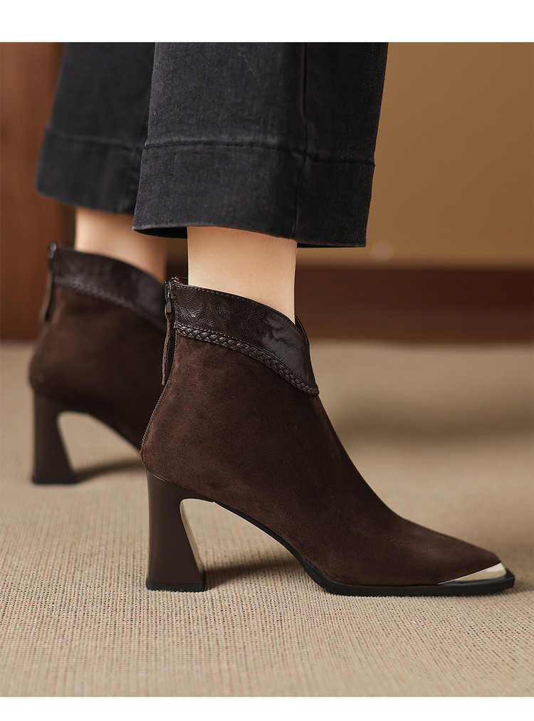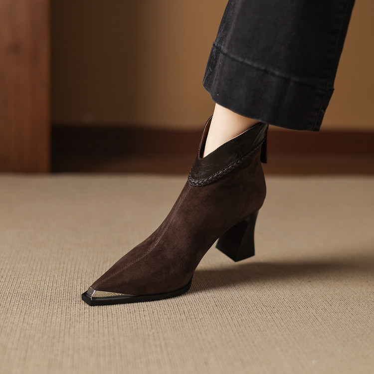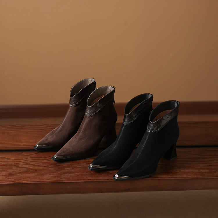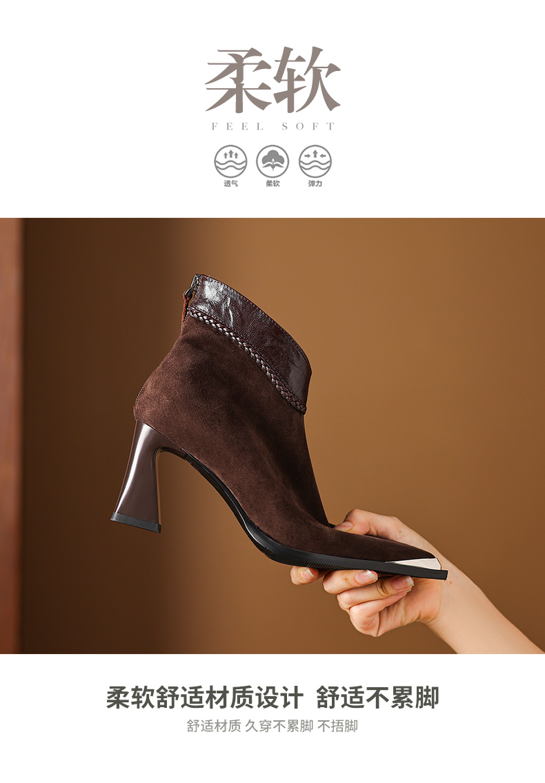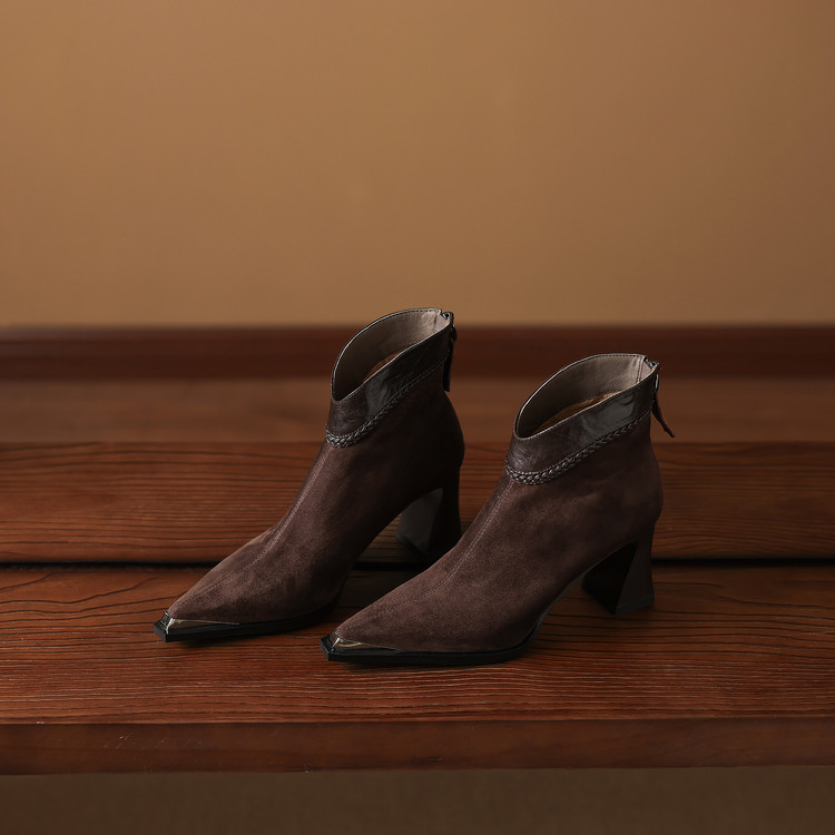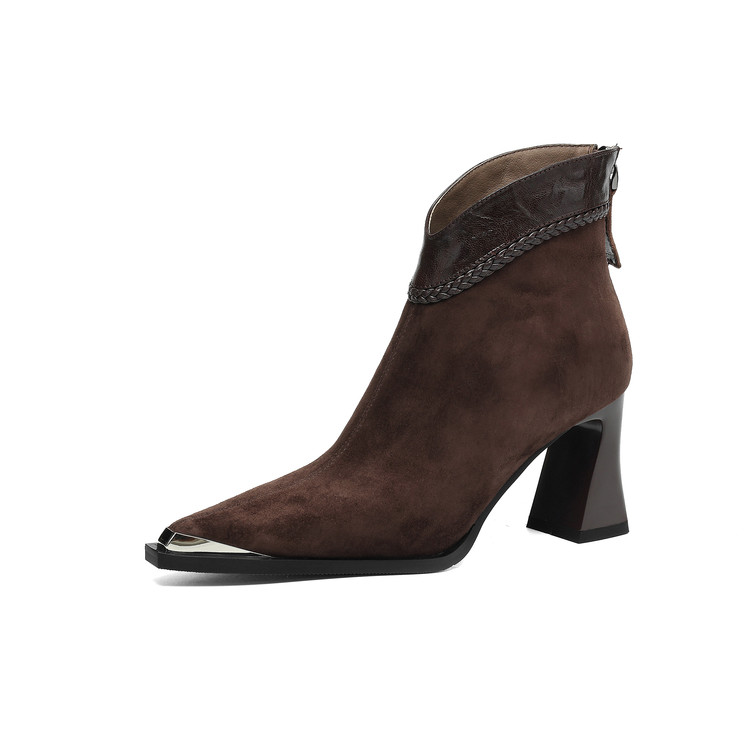 【预售5天】法式短靴女粗跟秋冬后拉链棕色气质高跟马丁靴显瘦V口瘦瘦靴DPJ&7178