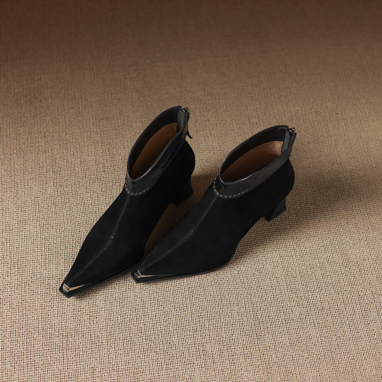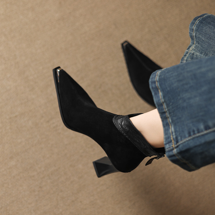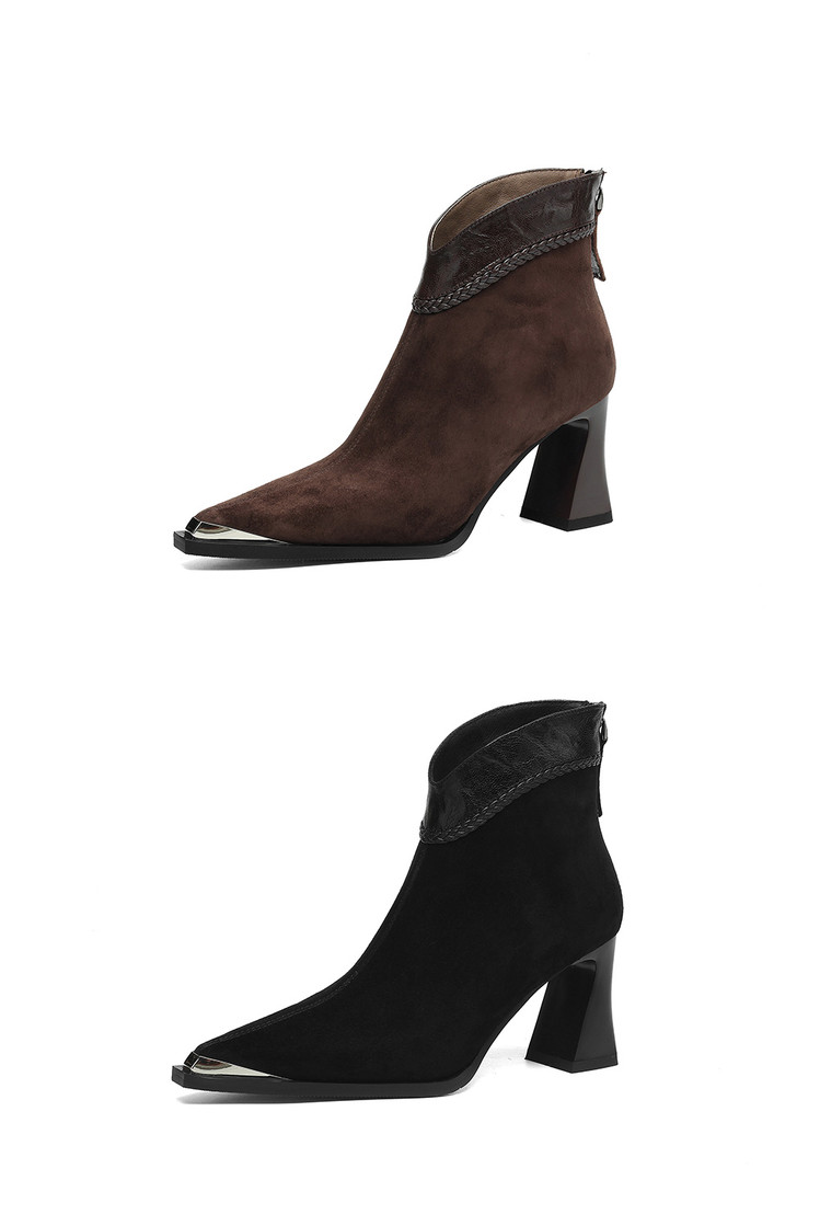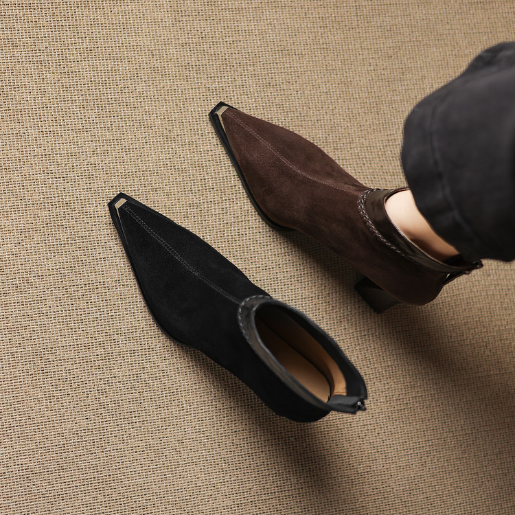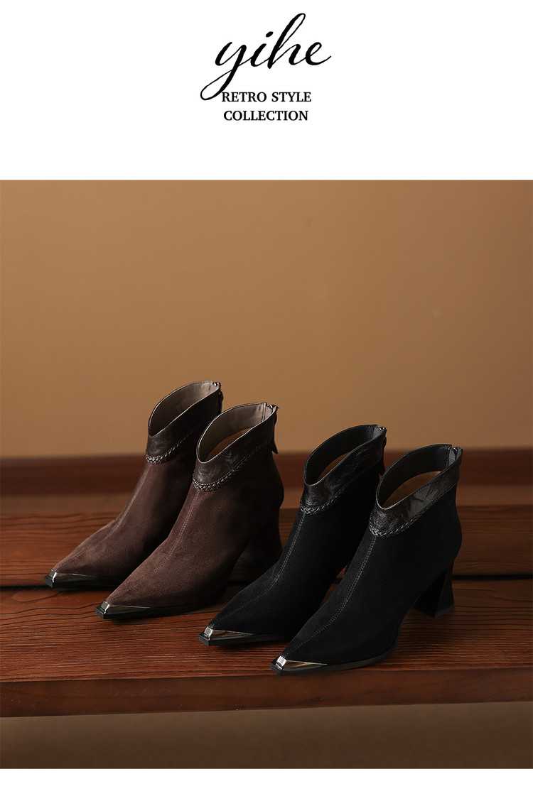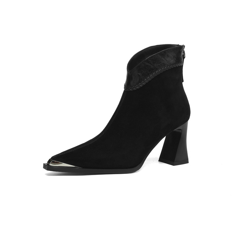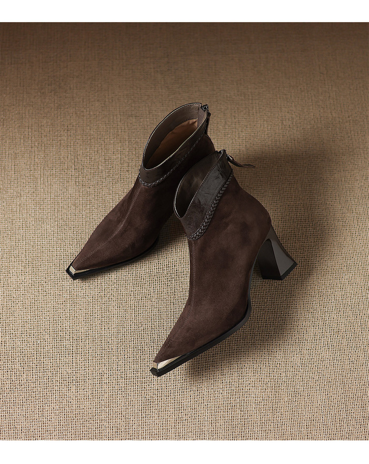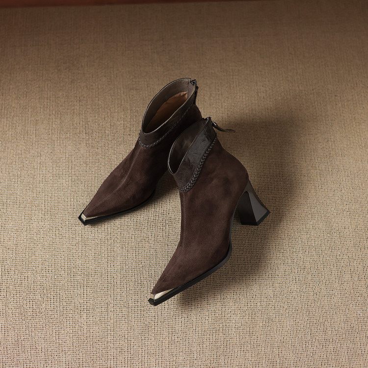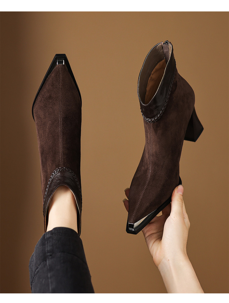 【预售5天】法式短靴女粗跟秋冬后拉链棕色气质高跟马丁靴显瘦V口瘦瘦靴DPJ&7178